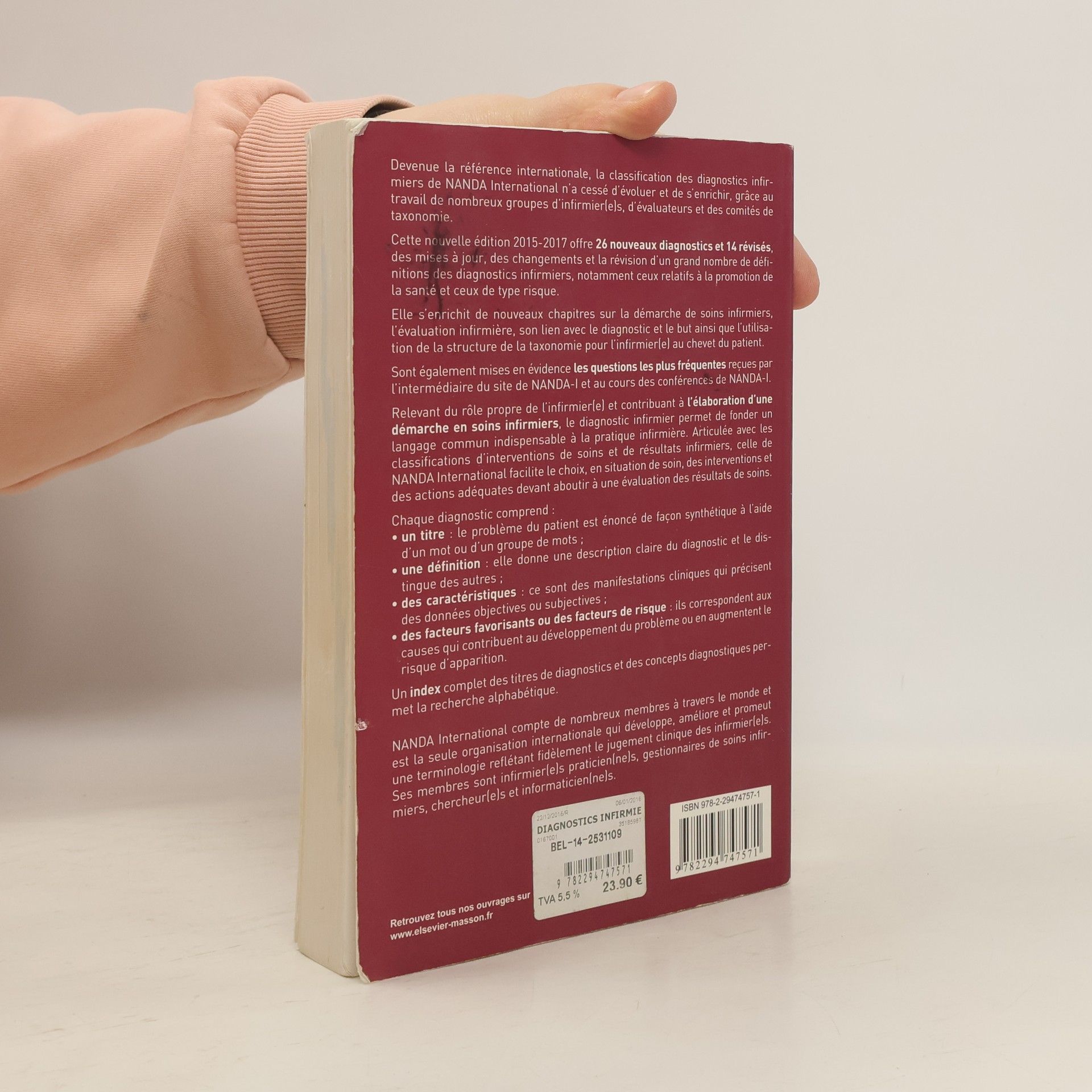 La reference internationale! Cette nouvelle edition 2015-2017 offre 26 nouveaux diagnostics et 14 revises, des mises a jour, des changements et la revision d'un grand nombre de definitions des diagnostics infirmiers, notamment ceux relatifs a la promotion de la sante et ceux de type risque. Elle s'enrichit de nouveaux chapitres sur la demarche de soins infirmiers, l'evaluation infirmiere, son lien avec le diagnostic et le but ainsi que l'utilisation de la structure de la taxonomie pour l'infirmier(e) au chevet du patient. Sont egalement mises en evidence les questions les plus frequentes recues par l'intermediaire du site de NANDA-I et au cours des conferences de NANDA-I. Articulee avec les classifications d'interventions de soins et de resultats infirmiers, celle de NANDA International facilite le choix, en situation de soin, des interventions et des actions adequates devant aboutir a une evaluation des resultats de soins. Chaque diagnostic comprend: - un titre: le probleme du patient est enonce de facon synthetique a l'aide d'un mot ou d'un groupe de mots; - une definition qui donne une description claire du diagnostic et le distingue des autres; - des caracteristiques: manifestations cliniques qui precisent des donnees objectives ou subjectives; - des facteurs favorisants ou des facteurs de risque: les causes qui contribuent au developpement du probleme ou en augmentent le risque d'apparition. Un index complet des titres de diagnostics et des concepts diagnostiques permet la recherche alphabetique.
