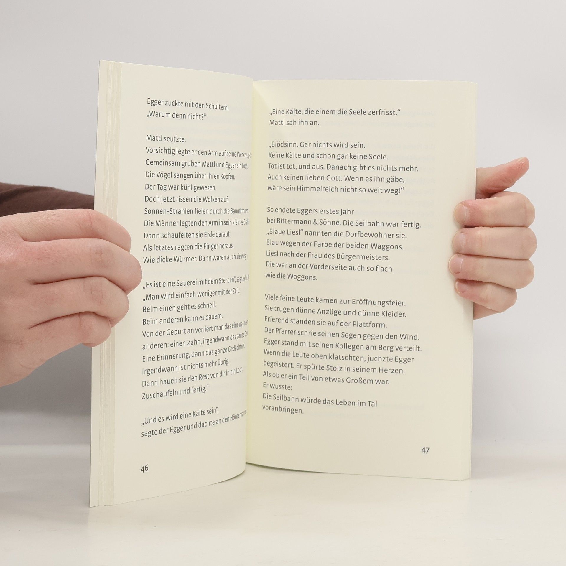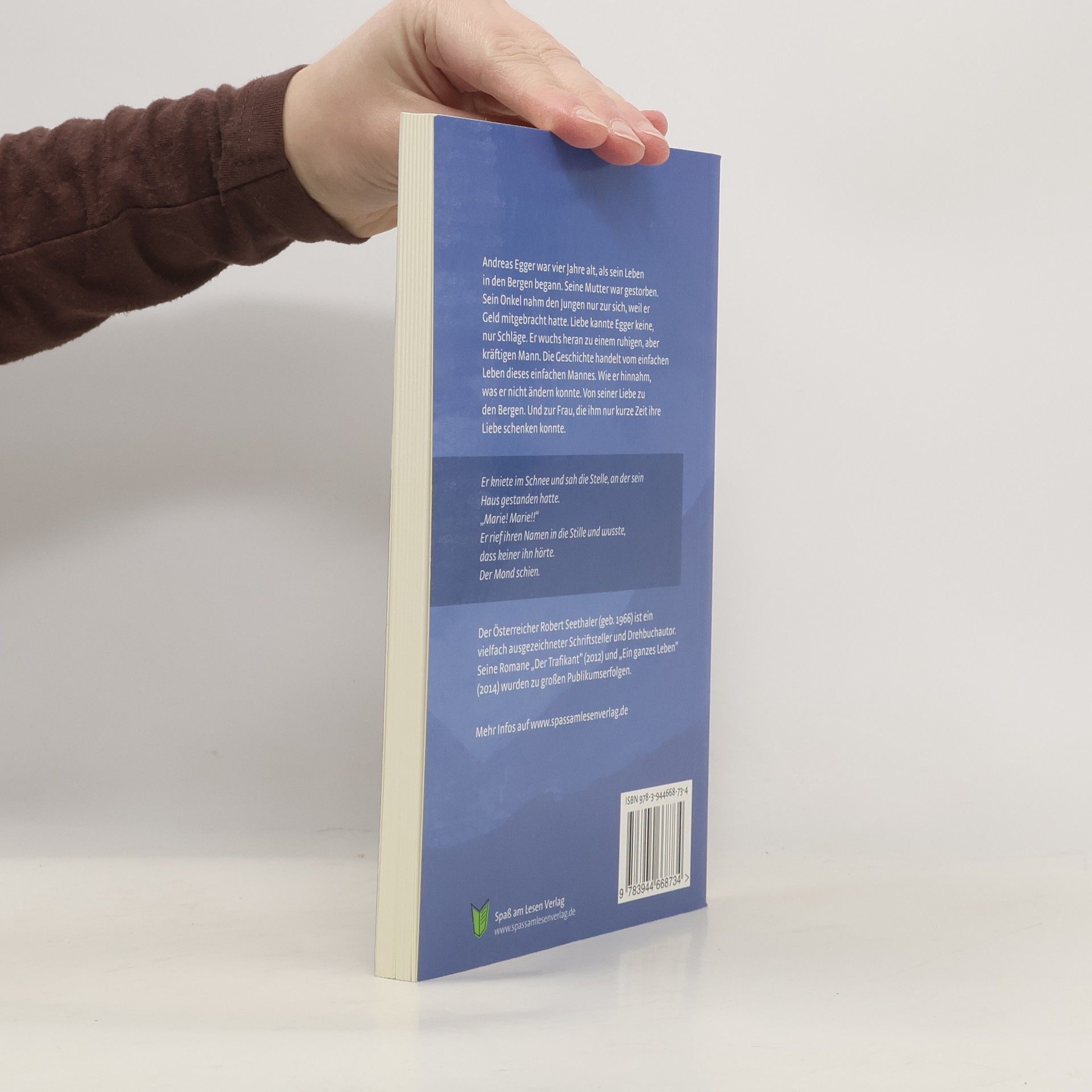 Andreas Egger war vier Jahre alt, als sein Leben in den Bergen begann. Seine Mutter war gestorben. Sein Onkel nahm den Jungen nur zur sich, weil er Geld mitgebracht hatte. Liebe kannte Egger keine, nur Schläge. Er wuchs heran zu einem ruhigen, aber kräftigen Mann. Die Geschichte handelt vom einfachen Leben dieses einfachen Mannes. Wie er hinnahm, was er nicht ändern konnte. Von seiner Liebe zu den Bergen. Und zur Frau, die ihm nur kurze Zeit ihre Liebe schenken konnte. Er schaute über den Hügel und schluchzte laut auf. Er kniete im Schnee und sah die Stelle, an der sein Haus gestanden hatte. „Marie! Marie!!“ Er rief ihren Namen in die Stille und wusste, dass keiner ihn hörte. Der Mond schien. Der Österreicher Robert Seethaler (geb. 1966) ist ein vielfach ausgezeichneter Schriftsteller und Drehbuchautor. Seine Romane „Der Trafikant“ (2012) und „Ein ganzes Leben“ (2014) wurden zu großen Publikumserfolgen.