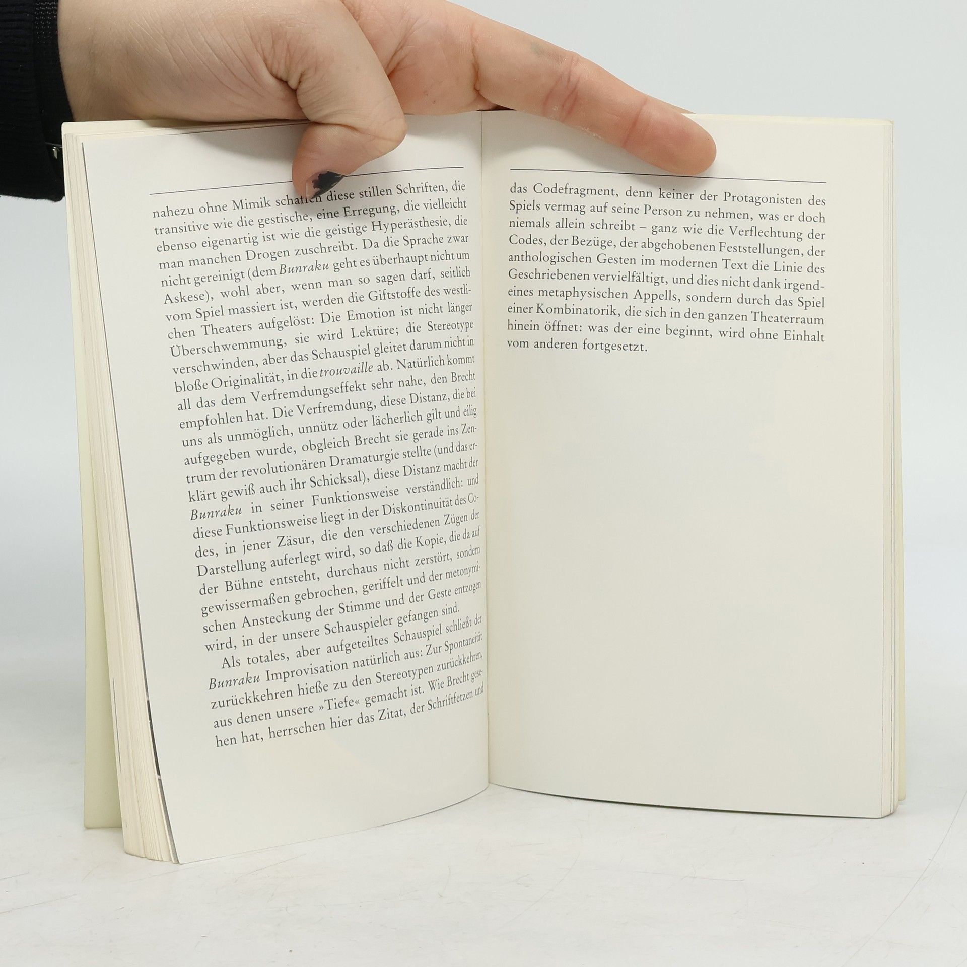 Auf einer Reise nach Japan wurde er mit der japanischen Zeichenwelt vertraut und bemerkte, daß diese Zeichen seiner Vorstellung vom Zeichen am nächsten kamen. Das japanische Zeichen ist stark: Es ist in bewundernswerter Weise Regeln unterworfen, angeordnet, dargestellt, niemals naturalisiert oder rationalisiert. Das japanische Zeichen ist leer: Sein Signifikat flieht, es gibt keinen Gott, keine Wahrheit, keine Moral, die diesen Signifikanten zugrunde liegt, die ohne ihr Gegenstück herrschen. Und vor allem sind die höhere Qualität dieses Zeichens, die Anmut seiner Behauptung und der erotische Charme, mit dem es auftritt, überall eingeprägt, auf den belanglosesten Gegenständen und Verhaltensweisen, die wir normalerweise in das Gebiet des Unbedeutenden oder Banalen verweisen.
