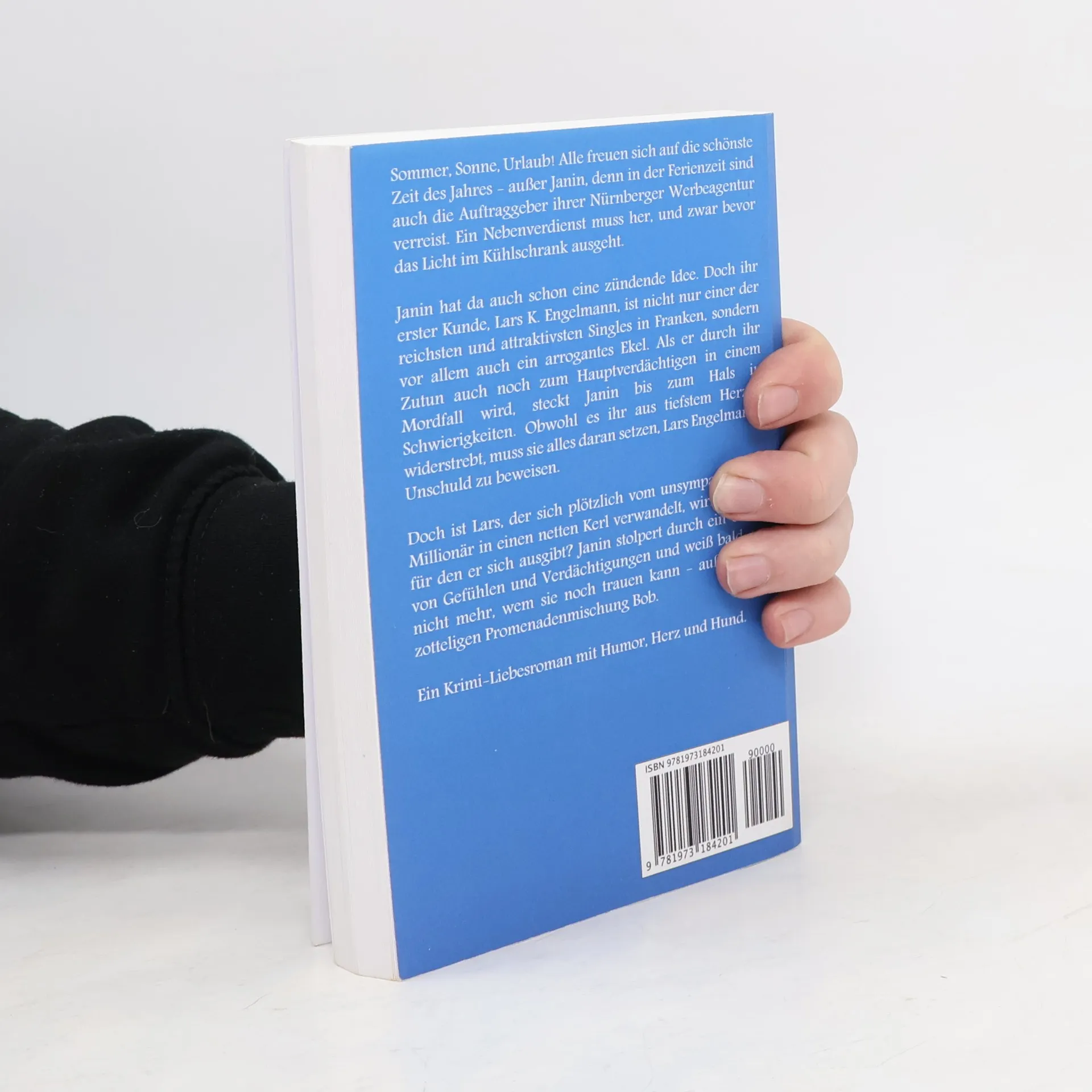 Sommer, Sonne, Urlaub - alle freuen sich auf die sch�nste Zeit des Jahres, nur Janin sieht der Ferienzeit mit Schrecken entgegen, denn alle Auftraggeber der N�rnberger Werbetexterin sind verreist und sie ist so gut wie pleite. Ein Nebenverdienst muss her, und zwar bevor das Licht im K�hlschrank ausgeht. Janin hat da auch schon eine z�ndende Idee. Dumm nur, dass ihr einziger Kunde, Lars K. Engelmann, exzentrischer Million�r und einer der attraktivsten Singles Frankens, so ein selbstherrliches Ekel ist. Als er durch ihre Arbeit auch noch des Mordes verd�chtigt wird, steckt Janin bis zum Hals in Schwierigkeiten. Obwohl es ihr aus tiefstem Herzen widerstrebt, muss sie alles daran setzen, um die Unschuld des unsympatischen Machos zu beweisen. Doch stecken hinter Lars, der auf den zweiten Blick gar nicht so schrecklich ist, wie Janin angenommen hat, noch mehr Geheimnisse? Wem, au�er ihrer vierbeinigen Promenadenmischung Bob, kann sie jetzt noch vertrauen? Eine lustige, spannende Liebes-Krimi-Kom�die mit Humor, Herz und Hund.