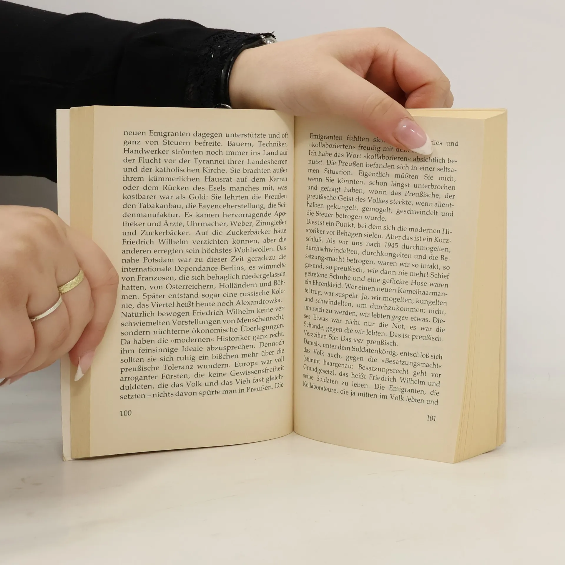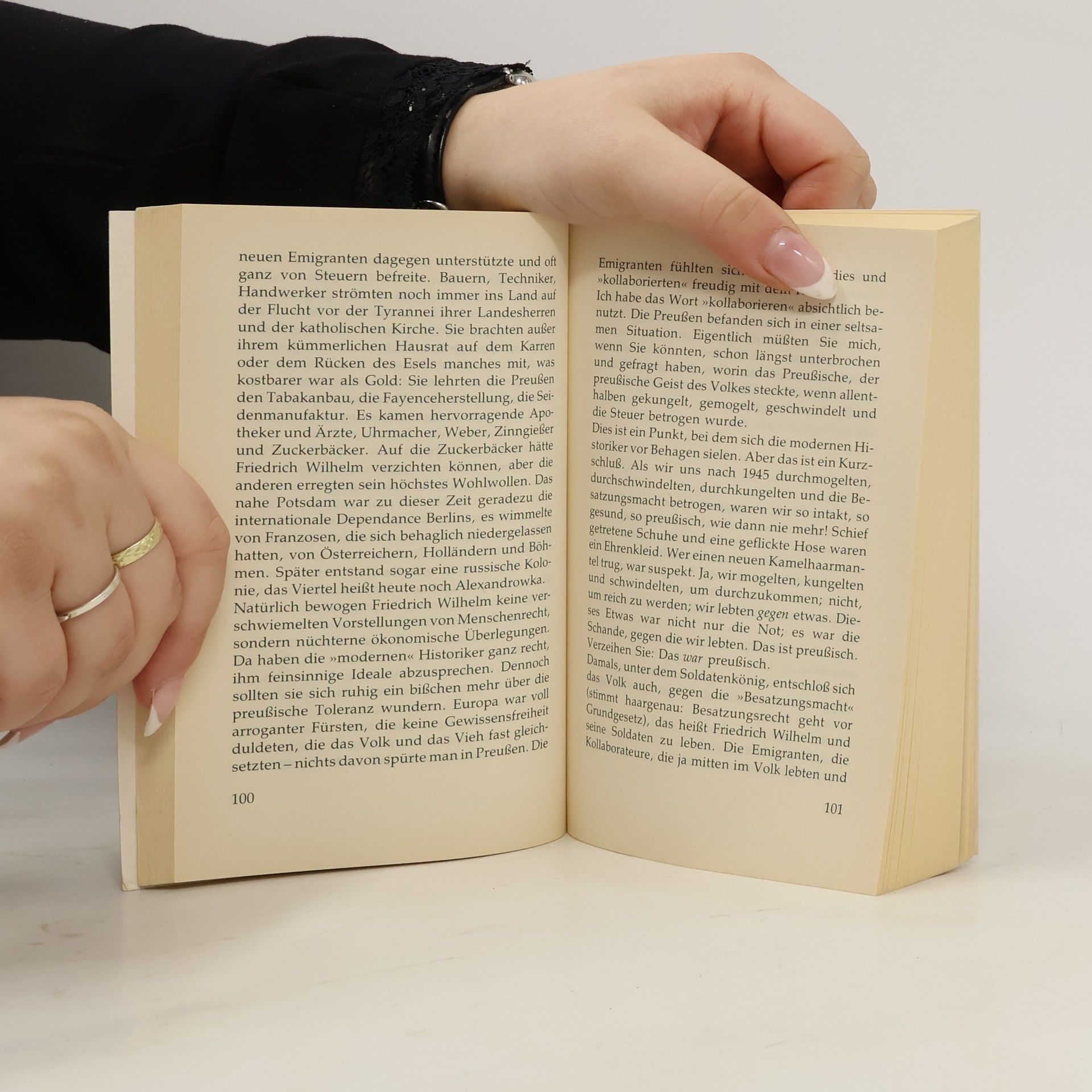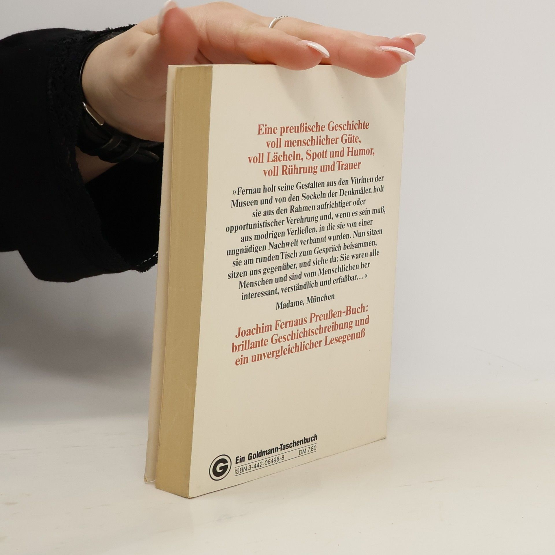 Die Geschichte der armen Leute? Bei einem solchen Untertitel erwartet man aufschlussreiche, aber eher trockene sozialhistorische Kost. Doch beim Lesen von Joachim Fernaus Werk Sprechen wir über Preußen wird man überrascht: Kein thematisches oder chronologisches Inhaltsverzeichnis, keine Abbildungen, sondern ein Buch, das auf den ersten Blick wie ein Roman aussieht. Man stöbert hinein und stellt erfreut fest, dass es sich fast wie ein Roman liest. Statt sachlicher Geschichtsbeschreibung erwartet den Leser eine lebendige Abhandlung über Preußens Entwicklung. Fernau unternimmt eine Wanderung durch das historische Preußen, beschreibt den Alltag im Überlebenskampf gegen Armut, Seuchen und Ganoven, und gewährt Einblicke in die Kasernenhöfe mit ihrem harten Militärdrill. Er beleuchtet die herrschaftlichen Sitze und erklärt den Einfluss der preußischen Herrscher auf Staat, Regierungsstil und Politik, die das Leben der Bürger prägten. Zwar ist das Buch kein klassisch-informatives Geschichtsbuch mit hohem Nachschlagewert, dafür vermittelt es Preußen-Fakten auf ungewohnte Weise. Wer eine wissenschaftlichere Aufbereitung sucht, findet in traditionellen Geschichtsbüchern Alternativen. Fernaus Arbeit verdient das Prädikat "Ein etwas anderes Geschichtsbuch".