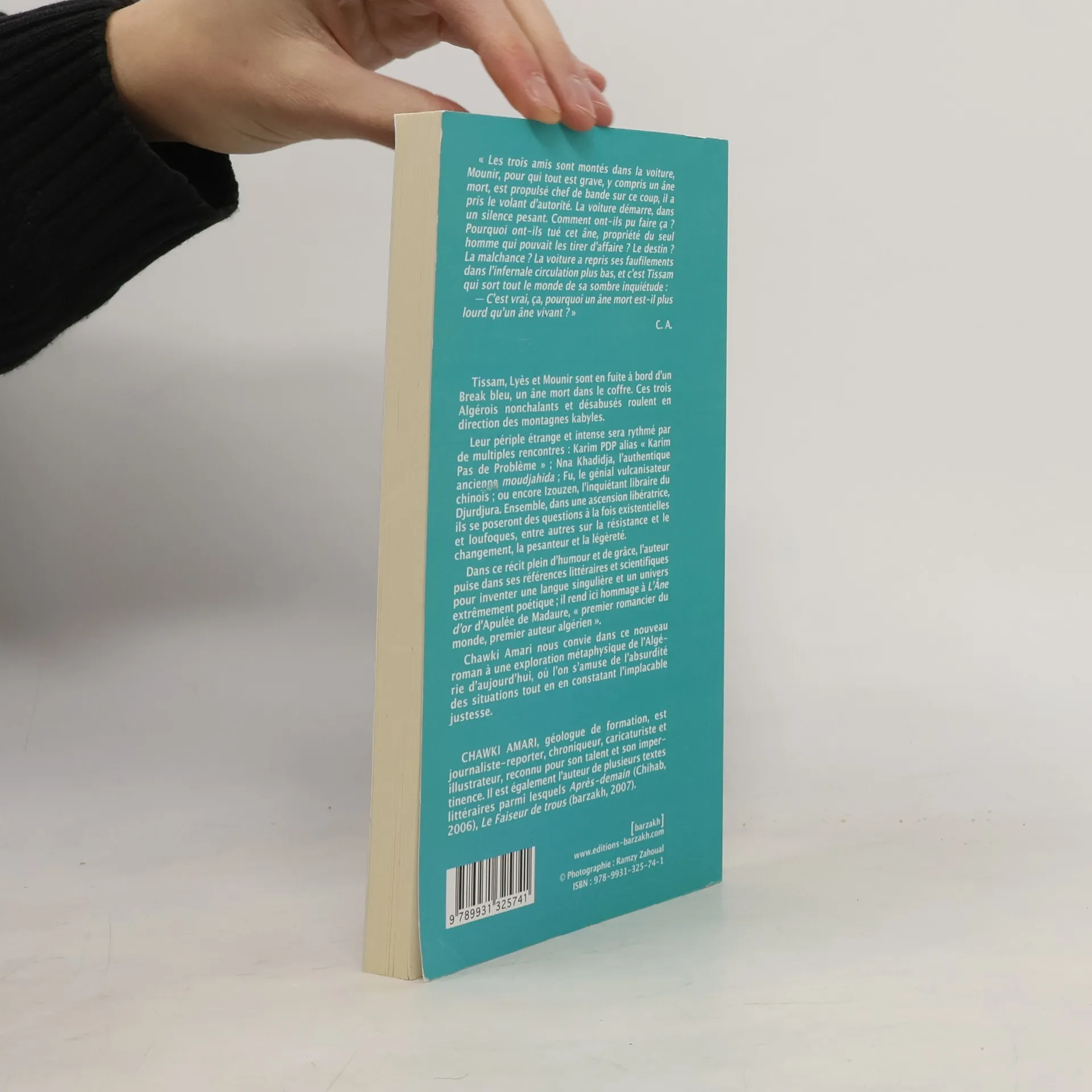 Les trois amis sont montés dans la voiture, Mounir, pour qui tout est grave, y compris un âne mort, est propulsé chef de bande sur ce coup il a pris le volant d'autorité. La voiture démarre, dans un silence pesant. Comment ont-ils pu faire ça ? Pourquoi ont-ils tué cet âne, propriété du seul homme qui pouvait les tirer d'affaire ? Le destin ? La malchance ? La voiture a repris ses faufilements dans l'infernale circulation plus bas n et c'est Tissam qui sort tout le monde de sa sombre inquiétude : C'est vrai, ça, pourquoi un âne mort est-il plus lourd qu'un âne vivant ? Tissam, Lyès et Mounir sont en fuite à bord d'un Break bleu, un âne mort dans le coffre. Ces trois Algérois nonchalants et désabusés roulent en direction des montagnes kabyles. Leur périple étrange et intense sera rythmé par de multiples rencontres : Karim PDP alias « Karim Pas de Problème » ; nna Khadidja, l'authentique ancienne moudjahida ; Fu, le génial vulcanisateur chinois ; ou encore Izouzen, l'inquiétant libraire du Djurdjura. Ensemble, dans une ascension libératrice, ils se poseront des questions à la fois existentielles et loufoques entre autres sur la résistance et le changement, la pesanteur et la légèreté. Dans ce récit plein d'humour et de grâce, l'auteur puise dans ses références littéraires et scientifiques pour inventer une langue singulière et un univers extrêmement poétique ; il rend ici hommage à L'Âne d'or d'Apulée de Madaure, « premier romancier du monde, premier auteur algérien ». Chawki Amari nous convie dans ce nouveau roman à une exploration métaphysique de l'Algérie d'aujourd'hui, où l'on s'amuse de l'absurdité des situations tout en en constatant l'implacable justesse.