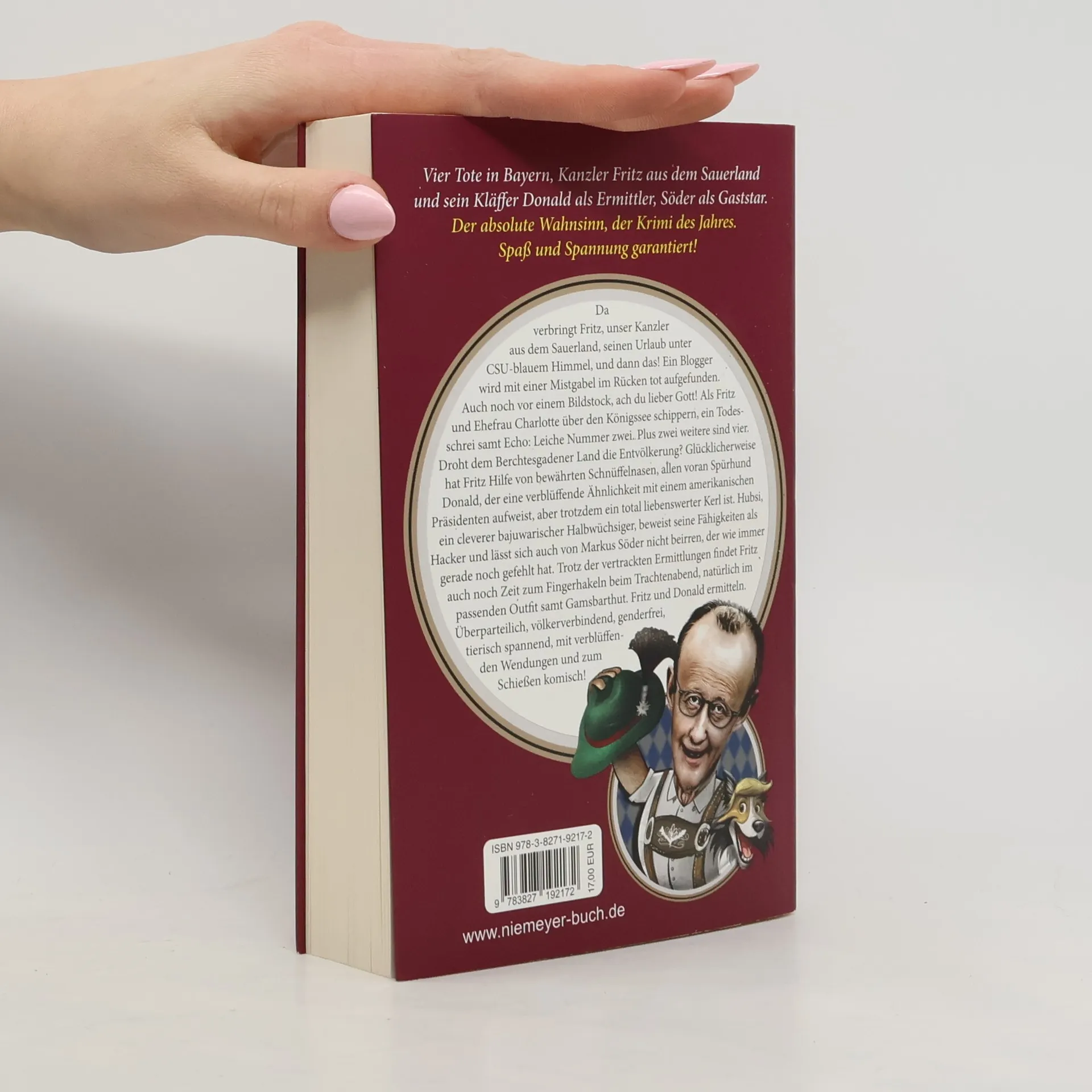 Unser Kanzler aus dem Sauerland, verbringt seinen Urlaub unter CSU-blauem Himmel, als ein Blogger mit einer Mistgabel ermordet wird. Als Fritz und Ehefrau Charlotte über den Königssee schippern, ein Todesschrei samt Echo: Leiche Nummer zwei. Plus zwei weitere sind vier! Droht dem Berchtesgadener Land die Entvölkerung? Zum Glück hat Fritz Unterstützung: Spürhund Donald, der dem amerikanischen Präsidenten ähnelt, aber ganz lieb ist, sowie der Hacker Hubsi. Da hat Markus Söder gerade noch gefehlt. Trotz der Ermittlungen findet Fritz noch Zeit zum Fingerhakeln beim Trachtenabend – im passenden Outfit samt Gamsbarthut. Wer außerdem wissen möchte, was Mozart mit dem Fall zu tun hat und welche Granden der Politik es in Tiefgaragen miteinander treiben, kommt um dieses Buch nicht herum. Fritz und Donald ermitteln. Überparteilich, völkerverbindend, tierisch spannend, und absolut komisch!