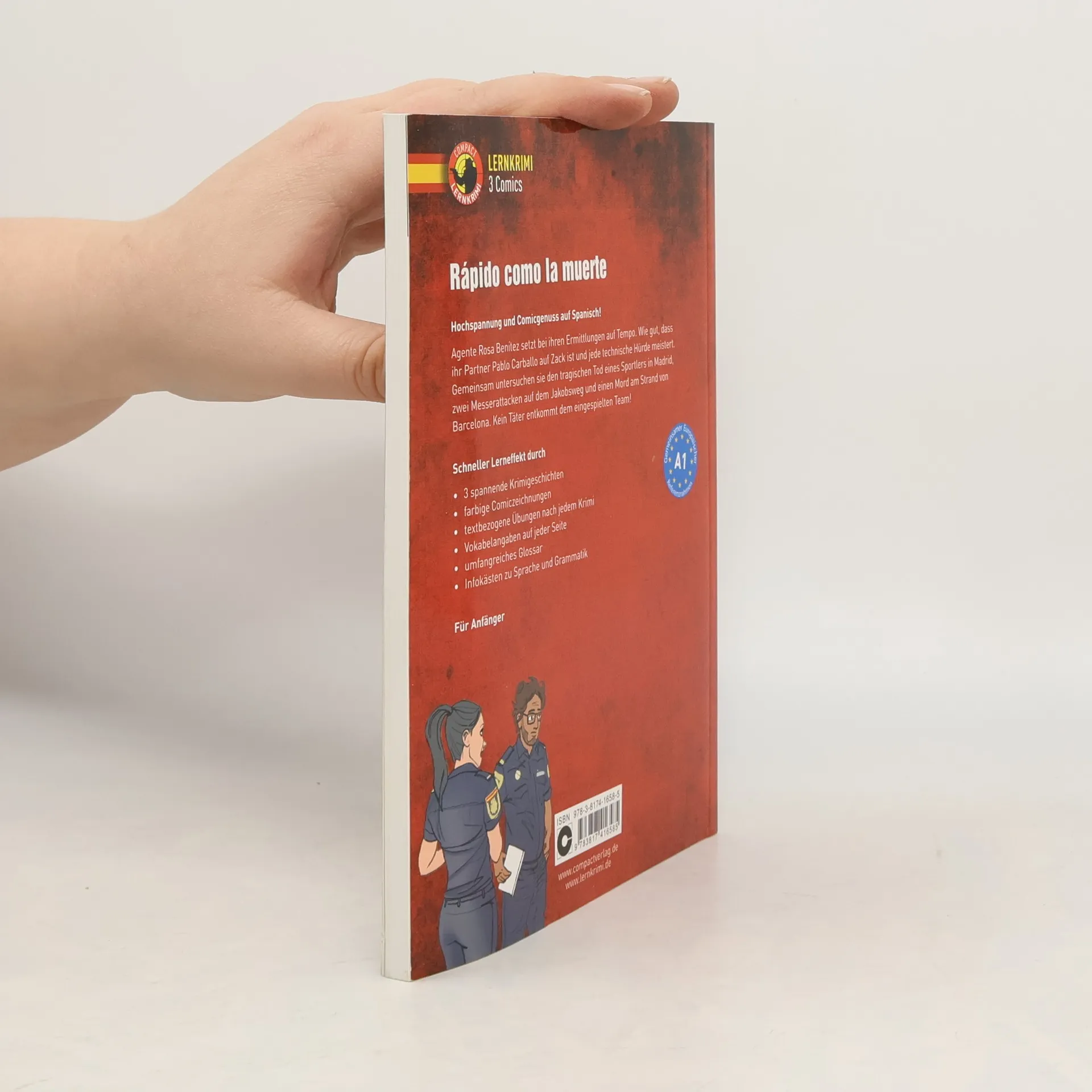 Entdecken Sie spannende Möglichkeiten, Sprachen zu lernen, während Sie unterhalten werden! Das erfolgreiche Lernkonzept des Circon Verlags gibt es jetzt als Comic. Mit actionreichen Krimigeschichten, authentischer Sprache und farbigen Illustrationen verbessern Sie Ihre Sprachfähigkeiten effektiv. In „Rápido como la muerte“ ermitteln Kommissarin Rosa Benítez und ihr Kollege Pablo Carballo in Madrid, Santiago de Compostela und Barcelona. Sie lösen Rätsel rund um den Tod eines hoffnungsvollen Sprinters, die mysteriösen Umstände zweier junger Pilgerinnen und die Korruption eines Ingenieurs. Das Spanisch-Lerncomic bietet drei spannende Krimigeschichten, in denen Sie in die Rollen der Ermittler schlüpfen und Ihre Sprachkenntnisse verbessern. Die ansprechenden Comiczeichnungen unterstützen den Lerneffekt und erleichtern den Einstieg in die Sprache. Textbezogene Übungen nach jedem Krimi steigern die Merkfähigkeit, während Vokabelangaben auf jeder Seite alle schwierigen Wörter griffbereit machen. Ein umfangreiches Glossar am Ende ermöglicht das Nachschlagen von Begriffen. Zusätzliche Informationen zu Sprache und Grammatik ergänzen die Geschichten und erleichtern das Lernen. Die Compact Kurzkrimis sind in mehreren Sprachen verfügbar und bieten eine positive Leseerfahrung, die sich ideal für den Unterricht oder das Selbststudium eignet.