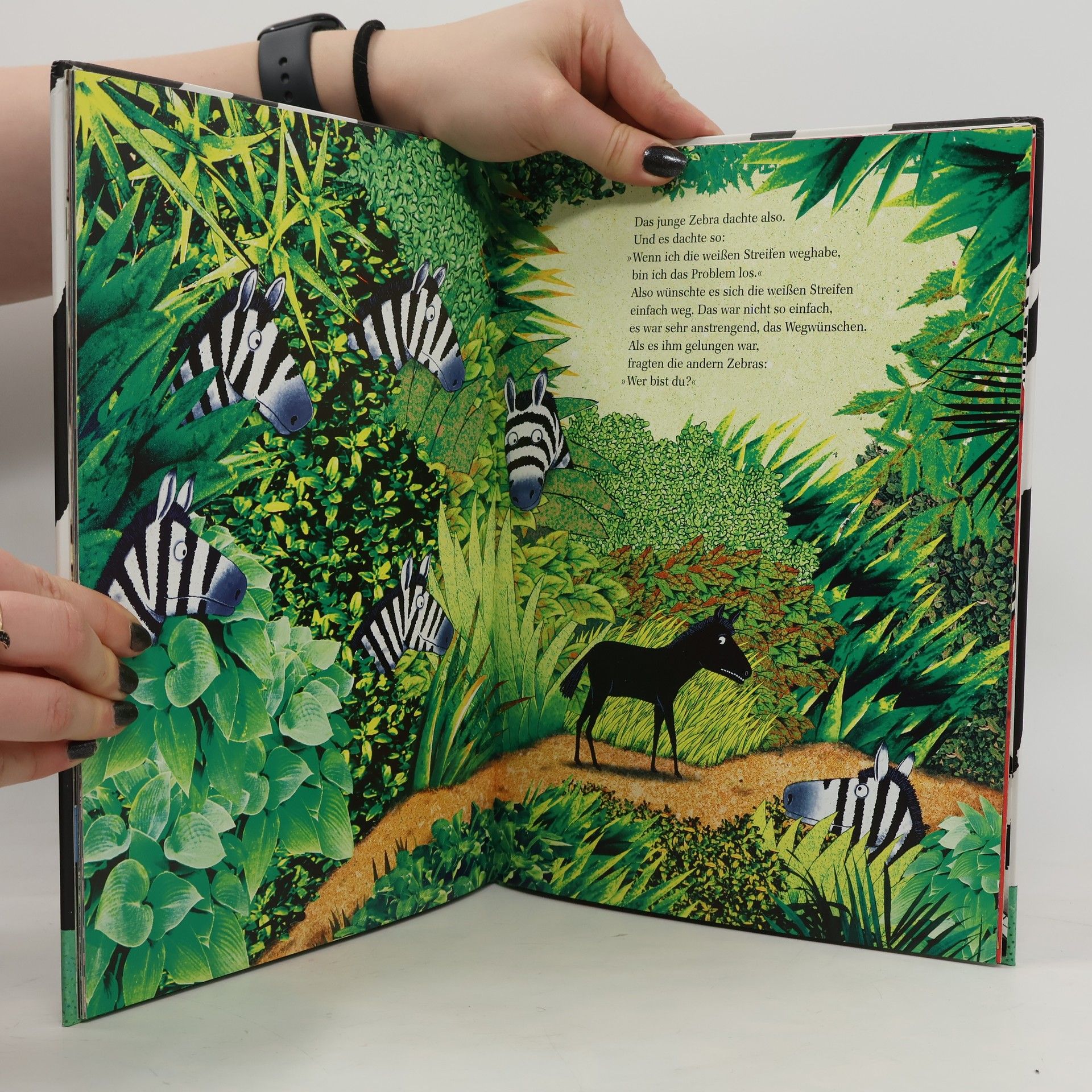 Ist das Fell der Zebras weiß mit schwarzen Streifen oder schwarz mit weißen Streifen? Das kleine Zebra zerbrichtsich darüber den Kopf, und in seinen Träumen wirbeln gar farbige Streifen und neue Muster durcheinander. »Bist du krank?«, fragen die anderen Zebras. »Ich denke«, antwortet das Zebra und wünscht sich die Streifen auch mal weg. Aber ob das die Antwort auf seine Fragen ist? Wer bin ich, und wohin gehöre ich? Mit seiner philosophischen Geschichte reagiert Max Huwyler auf eine unumgängliche Frage von Kindern. Und Jürg Obrist bietet starke Bilder für die Gedankenreise des kleinen Zebras und auch für seine Geborgenheit.