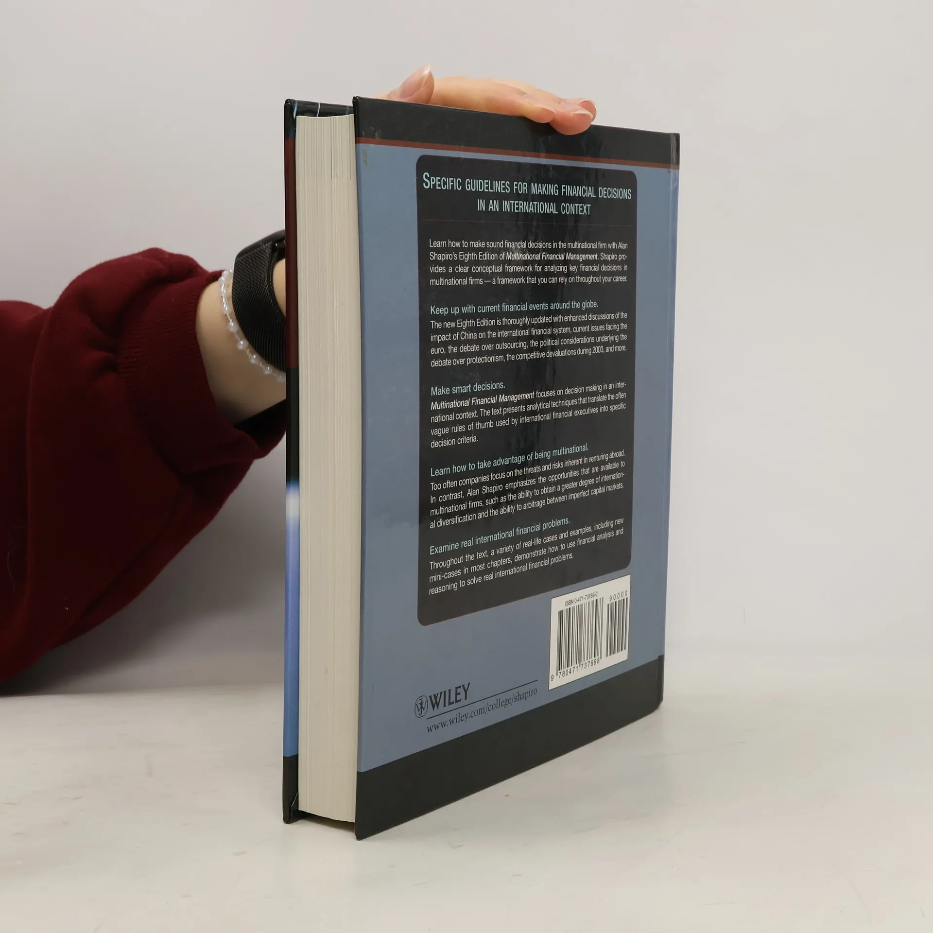 Specific guidelines for making financial decisions in an international context Learn how to make sound financial decisions in the multinational firm with Alan Shapiro's Eighth Edition of Multinational Financial Management. Shapiro provides a clear conceptual framework for analyzing key financial decisions in multinational firms-a framework that you can rely on throughout your career. Keep up with current financial events around the globe. The new Eighth Edition is thoroughly updated with enhanced discussions of the impact of China on the international financial system, current issues facing the euro, the debate over outsourcing, the political considerations underlying the debate over protectionism, the competitive devaluations during 2003, and more. Make smart decisions. Multinational Financial Management focuses on decision making in an international context. The text presents analytical techniques that translate the often vague rules of thumb used by international financial executives into specific decision criteria. Learn how to take advantage of being multinational. Too often companies focus on the threats and risks inherent in venturing abroad. In contrast, Alan Shapiro emphasizes the opportunities that are available to multinational firms, such as the ability to obtain a greater degree of international diversification and the ability to arbitrage between imperfect capital markets. Examine real international financial problems. Throughout the text, a variety of real-life cases and examples, including new mini-cases in most chapters, demonstrate how to use financial analysis and reasoning to solve real international financial problems.