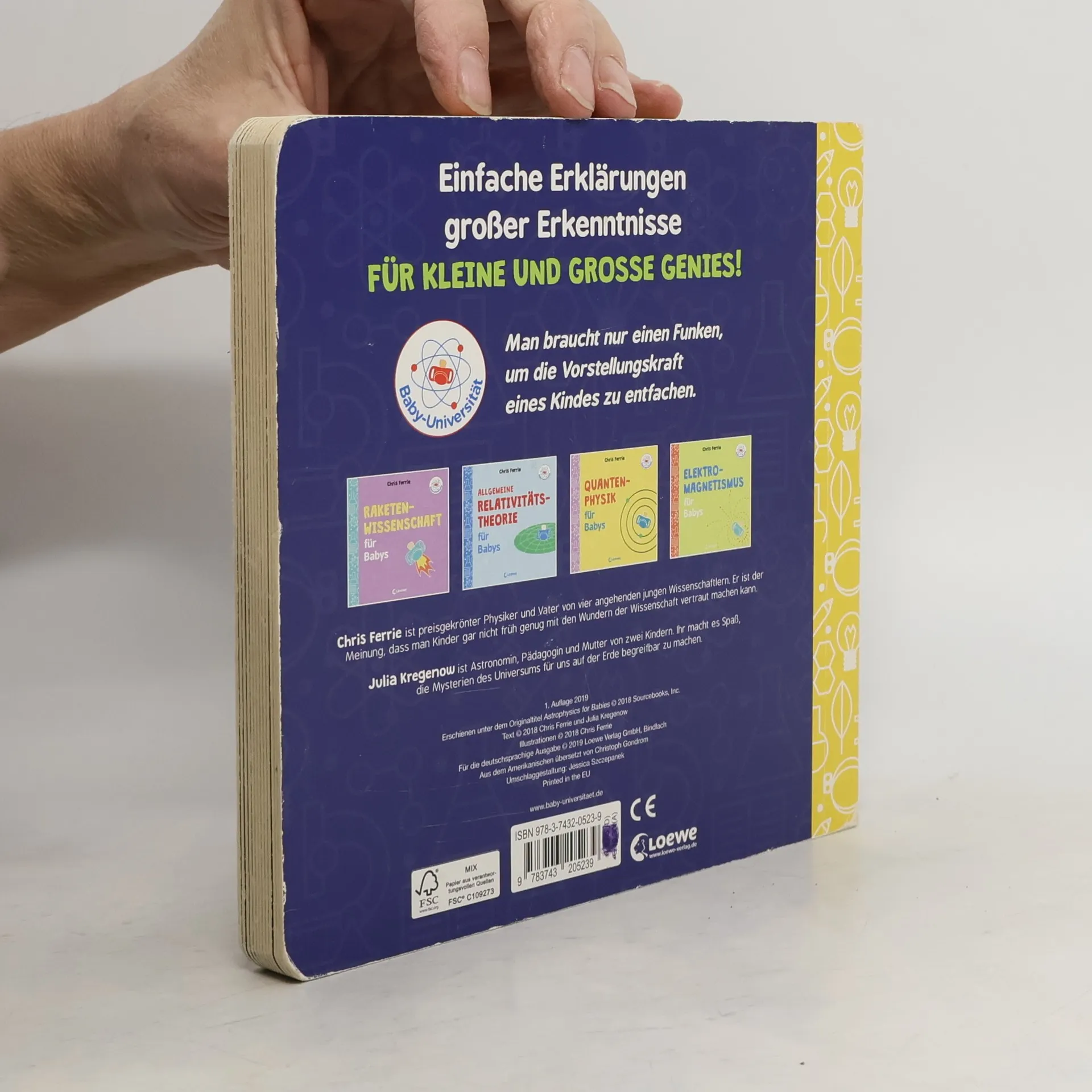 Einfache Erklärungen großer Erkenntnisse für kleine und große Genies ! Astrophysik für Babys erklärt auf heitere und verständliche Weise, wie Physik und Chemie Himmelskörper im Weltraum beeinflussen. Kleinkinder (und Erwachsene!) lernen, warum sie Teil unseres Universums sind. Mit unnachahmlicher Leichtigkeit und stets mit einem Augenzwinkern schaffen es der Physiker Chris Ferrie und die Astronomin Julia Kregenow, Kinder und Erwachsene gleichermaßen zu inspirieren. Die Bücher der Baby-Universität sind der einfachste Weg, um schon unsere Jüngsten für die Wunder der Wissenschaft zu begeistern. Denn es ist niemals zu früh, ein Astrophysiker zu werden! Baby-Universität: Man braucht nur einen Funken, um die Vorstellungskraft eines Kindes zu entfachen.