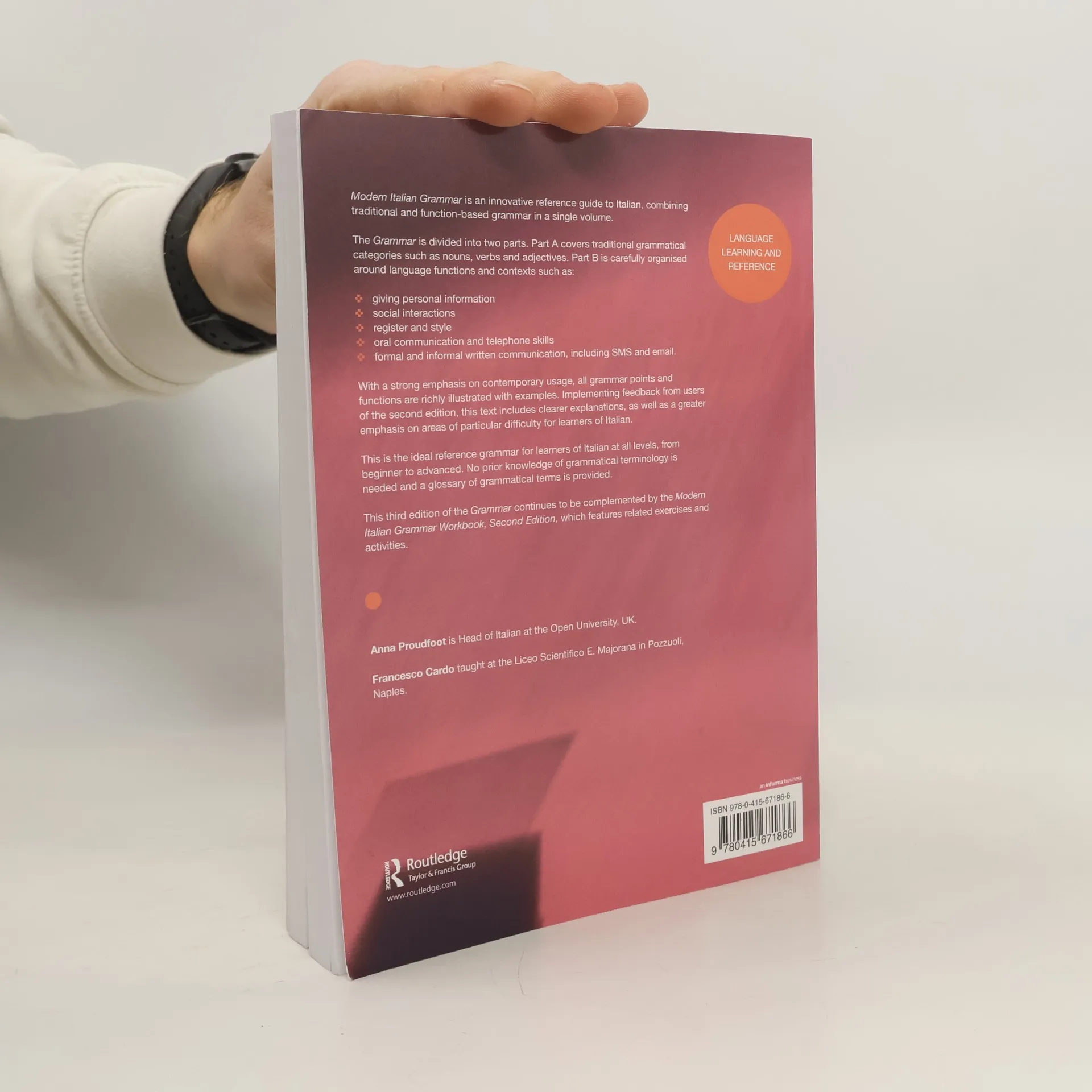 This new edition of the <em>Modern Italian Grammar</em> is an innovative reference guide to Italian, combining traditional and function-based grammar in a single volume. With a strong emphasis on contemporary usage, all grammar points and functions are richly illustrated with examples. Implementing feedback from users of the first edition, this text includes clearer explanations, as well as a greater emphasis on areas of particular difficulty for learners of Italian. Divided into two sections, the book covers: traditional grammatical categories such as word order, nouns, verbs and adjectives language functions and notions such as giving and seeking information, describing processes and results, and expressing likes, dislikes and preferences. This is the ideal reference grammar for learners of Italian at all levels, from beginner to advanced. No prior knowledge of grammatical terminology is needed and a glossary of grammatical terms is provided. This Grammar is complemented by the<em> Modern Italian Grammar Workbook Second Edition</em> which features related exercises and activities.