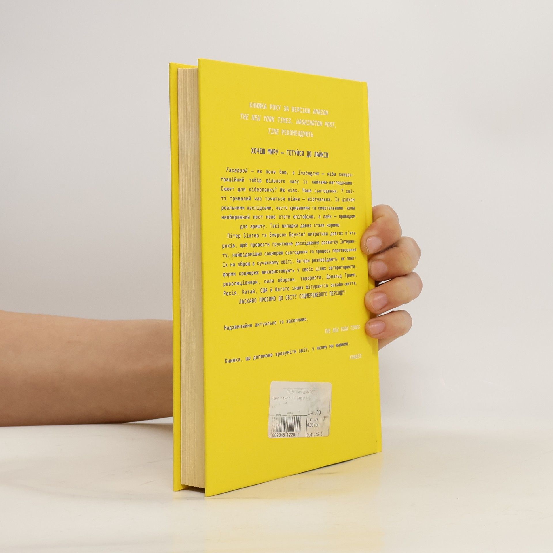 • Книжка року за версією Amazon • The New York Times, Washington Post, Time рекомендують Хочеш миру — готуйся до лайків Facebook — як поле бою, а Instagram — ніби концентраційний табір вільного часу із «лайками»-наглядачами. Сюжет для кіберпанку? Аж ніяк. Наше сьогодення. У світі протягом тривалого часу точиться війна — віртуальна. Із цілком реальними наслідками, часто кривавими та смертельними, коли необережний пост може стати епітафією, а невинна «вподобайка» — приводом для арешту. Такі випадки давно стали нормою. Пітер Сінґер та Емерсон Брукінґ витратили довгих п’ять років, щоб провести ґрунтовне дослідження розвитку Інтернету, найвідоміших соцмереж сьогодення та процесу перетворення їх на зброю в сучасному світі. Від історії появи Всесвітньої павутини, смайликів, твітів та мемів автори розповідають про використання платформ соцмереж авторитаристами, революціонерами, силами оборони, терористами, Дональдом Трампом, Росією, Китаєм, США й багатьма іншими фігурантами онлайн-життя. Ласкаво просимо до cвіту соцмережевого періоду!