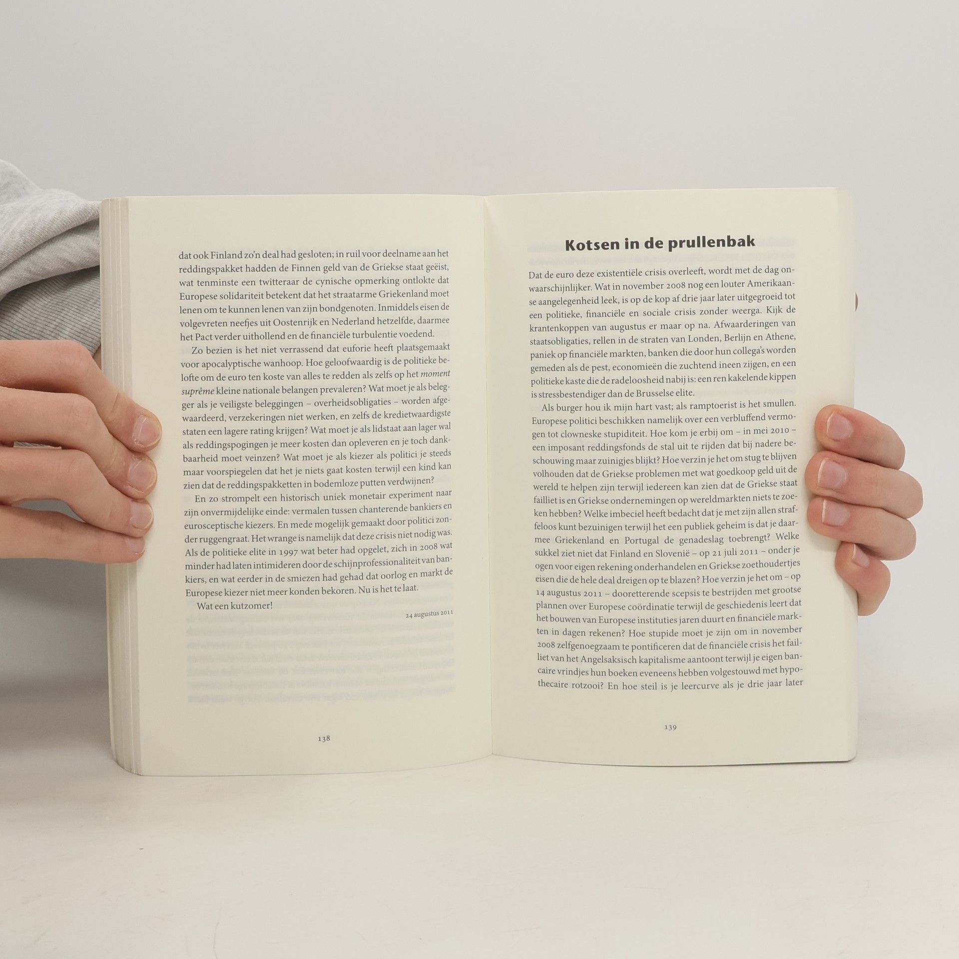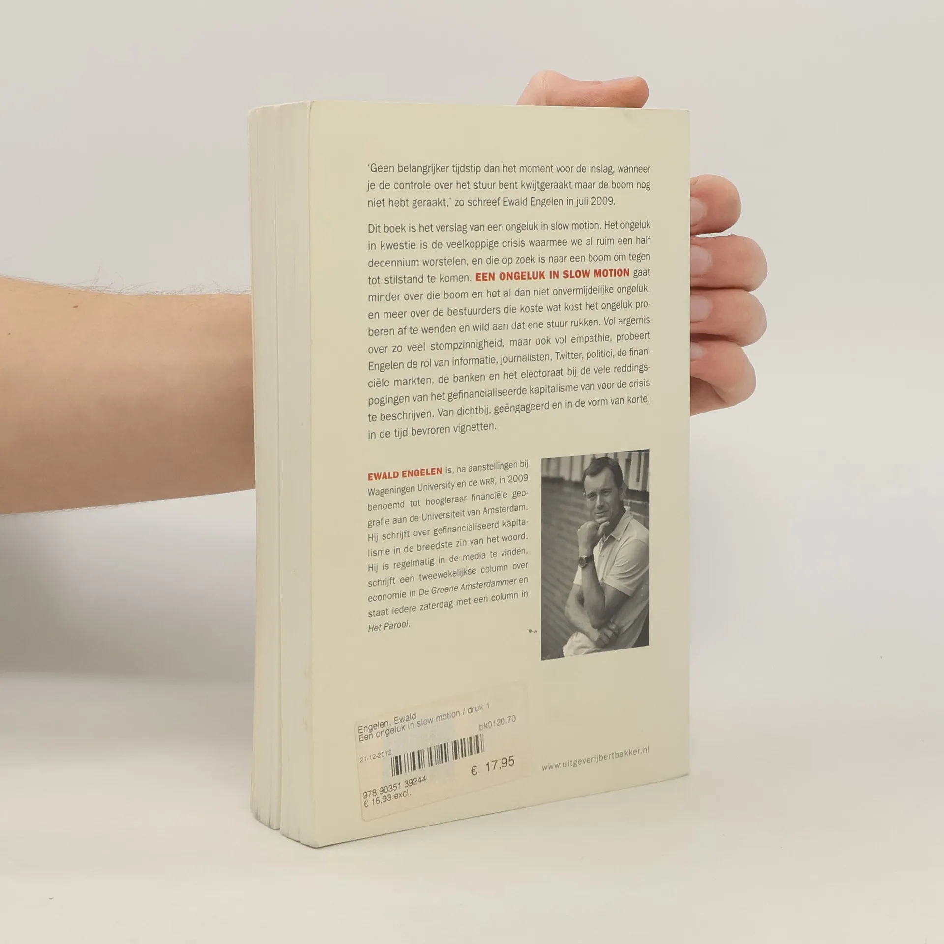Geen belangrijker tijdstip dan het moment vóór de inslag, wanneer je de controle over het stuur bent kwijtgeraakt maar de boom nog niet hebt geraakt', zo schreef Ewald Engelen in juli 2009. Dit boek is het verslag van een ongeluk in slow motion. Het ongeluk in kwestie is de veelkoppige crisis waarmee we al ruim een half decennium worstelen, en die op zoek is naar een boom om tegen tot stilstand te komen. 'Een ongeluk in slow motion' gaat minder over die boom en het al dan niet onvermijdelijke ongeluk, en meer over de bestuurders die koste wat kost het ongeluk proberen af te wenden en wild aan dat ene stuur rukken. Vol ergernis over zo veel stompzinnigheid, maar ook vol empathie, probeert Engelen de rol van informatie, journalisten, Twitter, politici, de financiële markten, de banken en het electoraat bij de vele reddingspogingen van het gefinancialiseerde kapitalisme van voor de crisis te beschrijven. Van dichtbij, geëngageerd en in de vorm van korte, in de tijd bevroren vignetten.