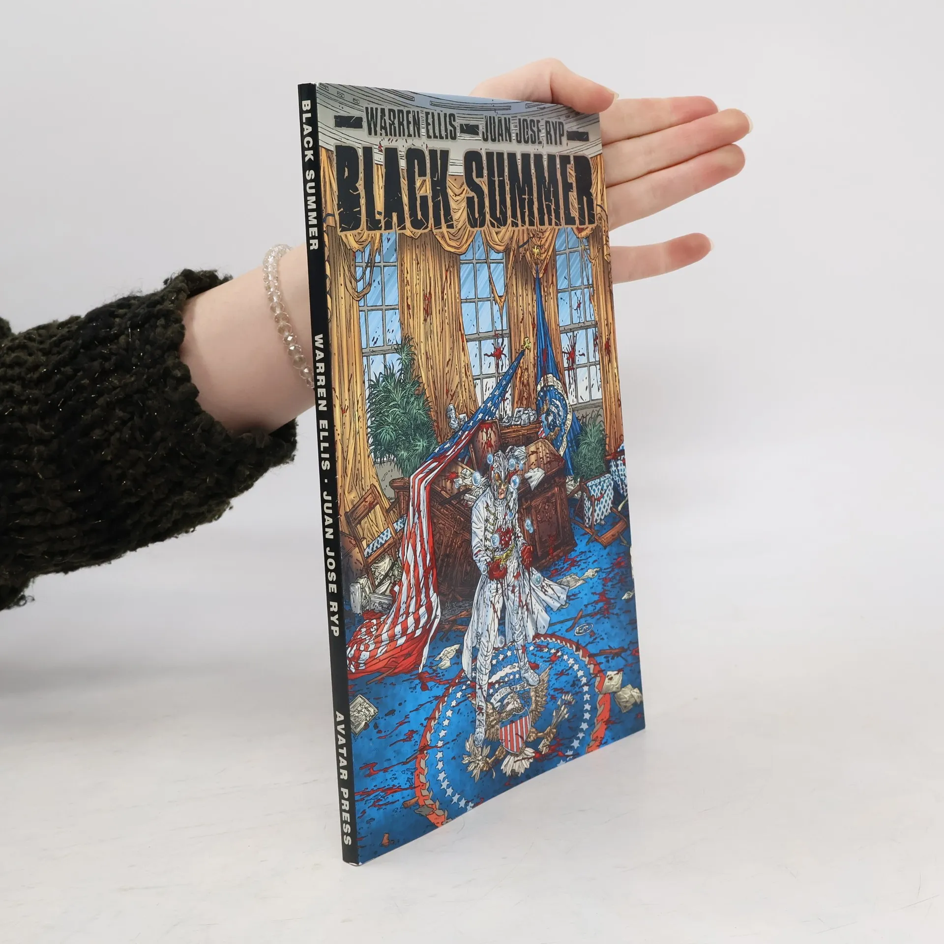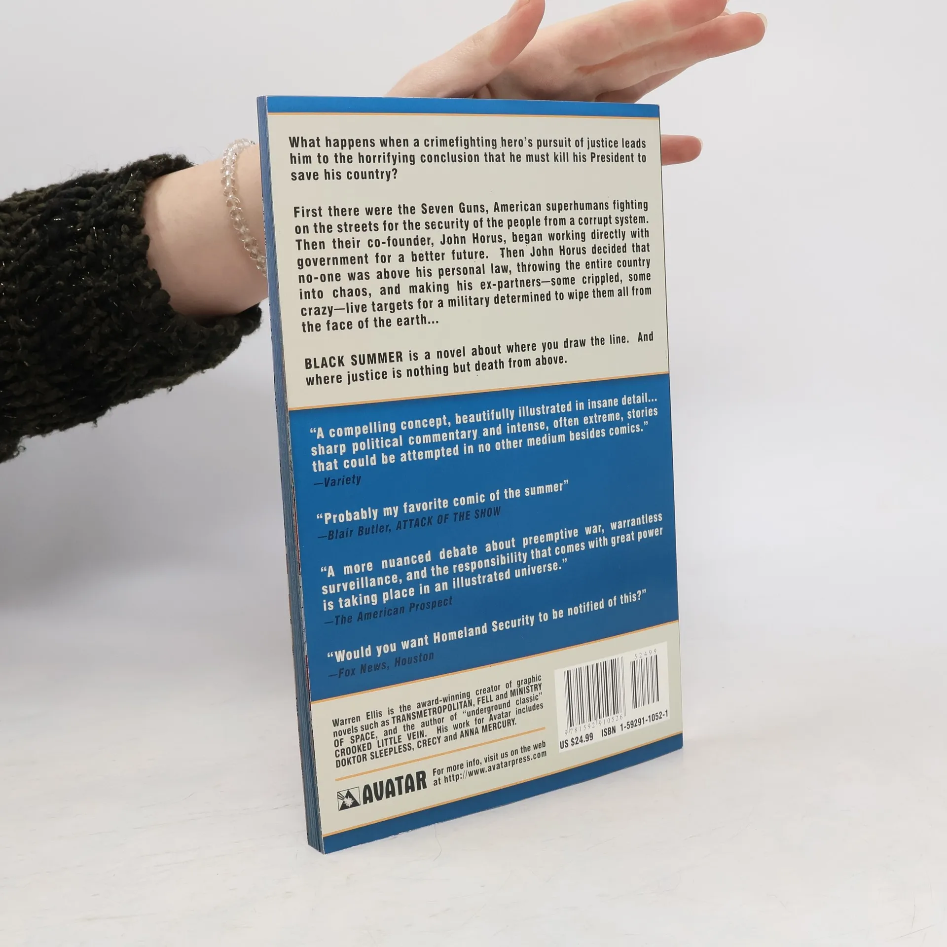When America's premiere hero kills everyone in the White House in pursuit of his own brand of justice, his innocent former teammates become the targets of a massive military crackdown. What happens when a crimefighting hero's pursuit of justice leads him to the horrifying conclusion that he must kill his President to save his country? When John Horus decides that no one is above his personal law, he kicks down the door to the White House and throw the entire country into chaos. Now, his former teammates in the Seven Guns -- some crippled, some crazy, and all considered guilty by association -- become live targets for a military determined to wipe them all from the face of the earth. BLACK SUMMER is Warren Ellis' graphic novel about where you draw the line, and where justice is nothing but death from above.