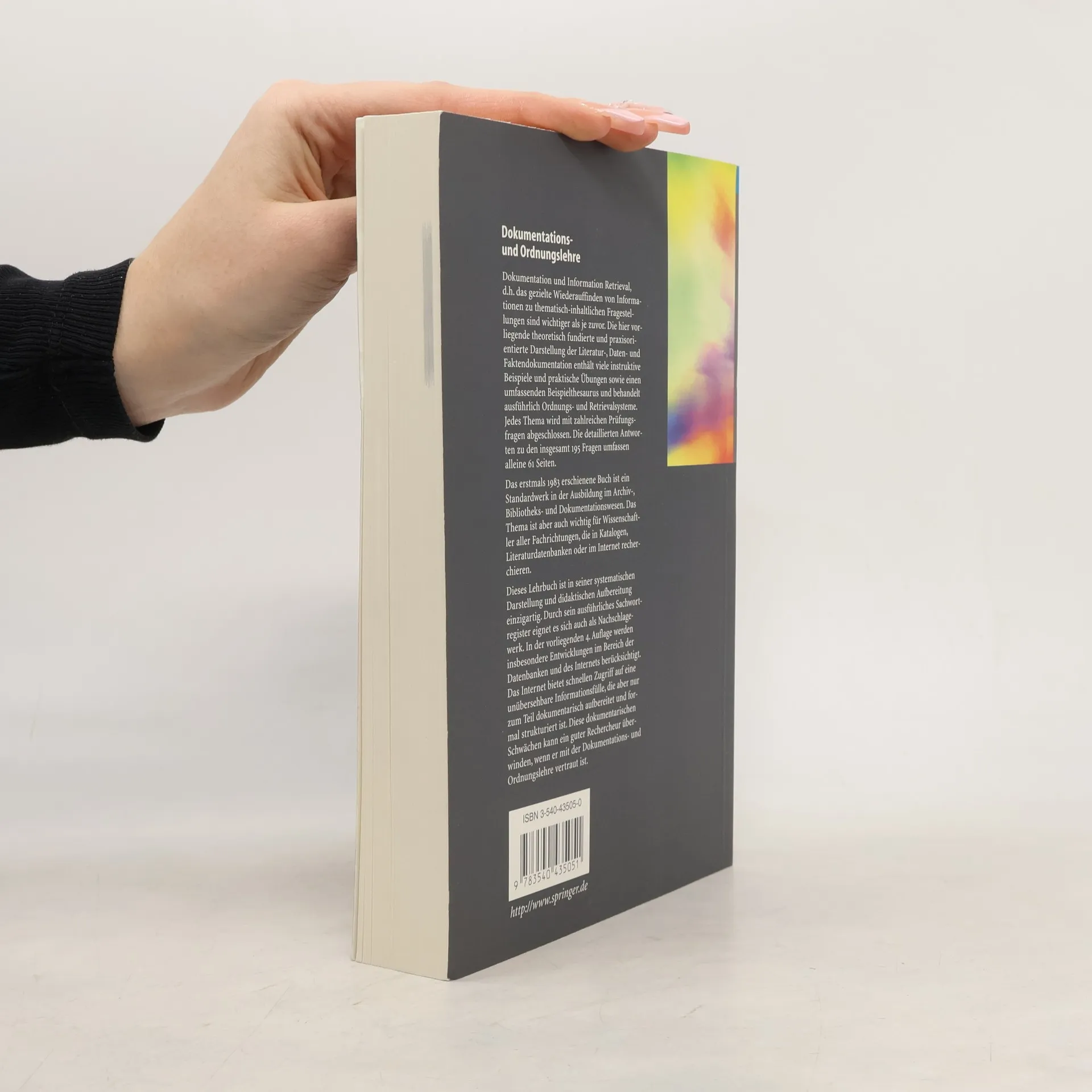 Diese Einführung in die Grundlagen der Dokumentation und des Information Retrieval, d. h. des Wiederauffindens von Information zu thematisch-inhaltlichen Fragen, entstand auf der Basis langjähriger Lehrerfahrung. Die sowohl theoretisch fundierte als auch praxisorientierte Darstellung der Daten-, Literatur- und Faktendokumentation enthält neben zahlreichen Übungen einen Beispiel-Thesaurus, die Besprechung realer Ordnungs- und Retrievalsysteme sowie ca. 200 Prüfungsfragen mit Antworten. Das Buch ist von zentraler Bedeutung für die Ausbildung von Dokumentaren, Bibliothekaren und Archivaren. Das Thema gewinnt aber auch an Bedeutung für Wissenschaftler aller Fachrichtungen. Das Buch ist in seiner systematischen Darstellung und didaktischen Aufbereitung einzigartig. Durch sein ausführliches Sachwortregister eignet es sich auch als Nachschlagewerk. In der vorliegenden vierten Auflage werden insbesondere Entwicklungen im Bereich des Internets und der Informationssysteme berücksichtigt.