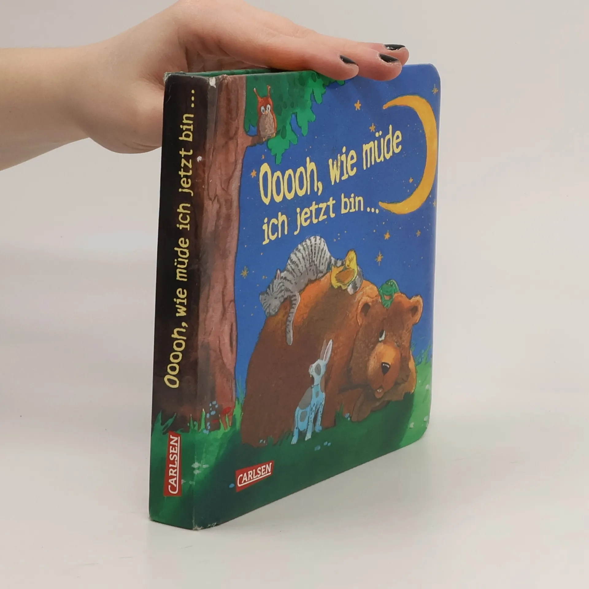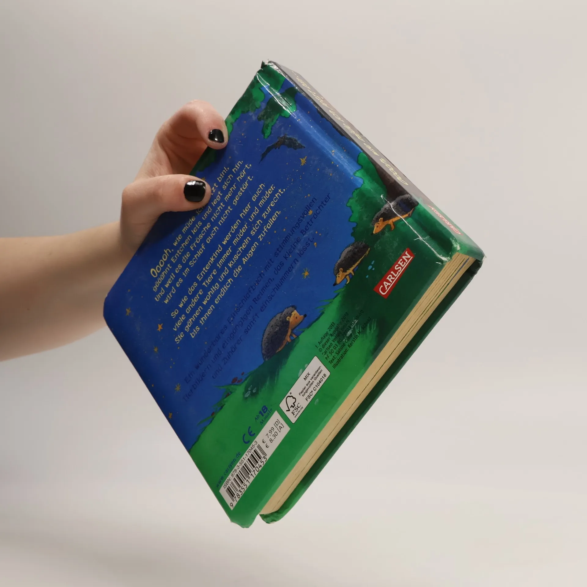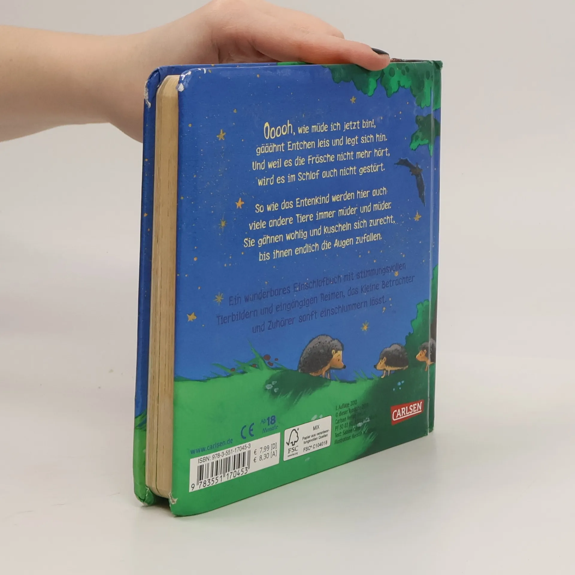 Ooooh, wie müde ich jetzt bin!, gääähnt Entchen leis und legt sich hin. Und weil es die Frösche nicht mehr hört, wird es im Schlaf auch nicht gestört. Wie das Entenkind so werden hier auch viele andere kleine Tiere immer müder und müder. Sie gähnen wohlig und kuscheln sich zurecht, bis ihnen endlich die Augen zufallen. Ein wunderbares Einschlafbuch mit liebenswerten Tierbildern und eingängigen Reimen, das kleine Betrachter und Zuhörer sanft einschlummern lässt.
