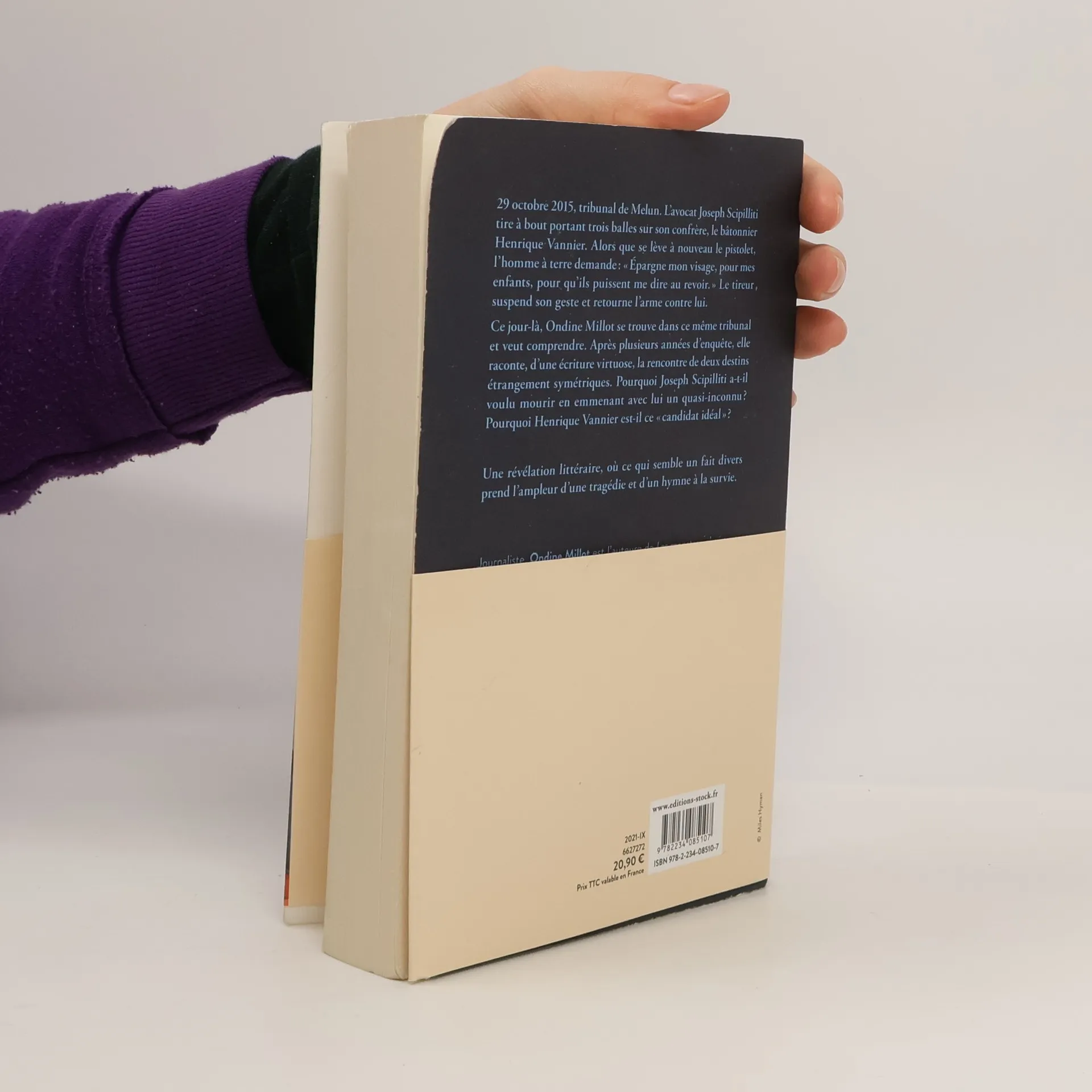 29 octobre 2015, tribunal de Melun. L'avocat Joseph Scipilliti tire à bout portant trois balles sur son confrère, le bâtonnier Henrique Vannier. Alors que se lève à nouveau le pistolet, l'homme à terre demande : « Épargne mon visage, pour mes enfants, pour qu'ils puissent me dire au revoir. » Le tireur suspend son geste et retourne l'arme contre lui. Ce jour-là, Ondine Millot se trouve dans ce même tribunal et veut comprendre. Après plusieurs années d'enquête, elle raconte, d'une écriture virtuose, la rencontre de deux destins étrangement symétriques. Pourquoi Joseph Scipilliti a-t-il voulu mourir en emmenant avec lui un quasi-inconnu ? Pourquoi Henrique Vannier est-il ce « candidat idéal » ? Une révélation littéraire, où ce qui semble un fait divers prend l'ampleur d'une tragédie et d'un hymne à la survie.