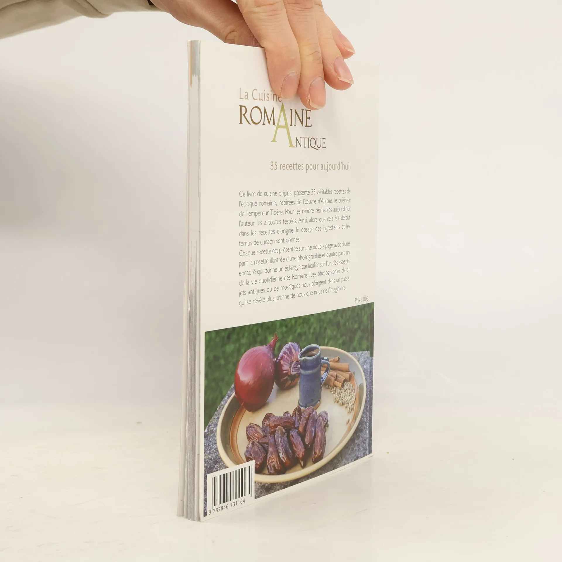 Ce livre de cuisine original présente 35 véritables recettes de l'époque romaine, inspirées de l'oeuvre d'Apicius, le cuisinier de l'empereur Tibère. Pour les rendre réalisables aujourd'hui, l'auteur les a toutes testées. Ainsi, alors que cela fait défaut dans les recettes d'origine, le dosage des ingrédients et les temps de cuisson sont donnés. Chaque recette est présentée sur une double page, avec d'une part la recette illustrée d'une photographie et d'autre part, un encadré qui donne un éclairage particulier sur l'un des aspects de la vie quotidienne des Romains. Des photographies d'objets antiques ou de mosaïques nous plongent dans un passé qui se révèle plus proche de nous que nous ne l'imaginions.