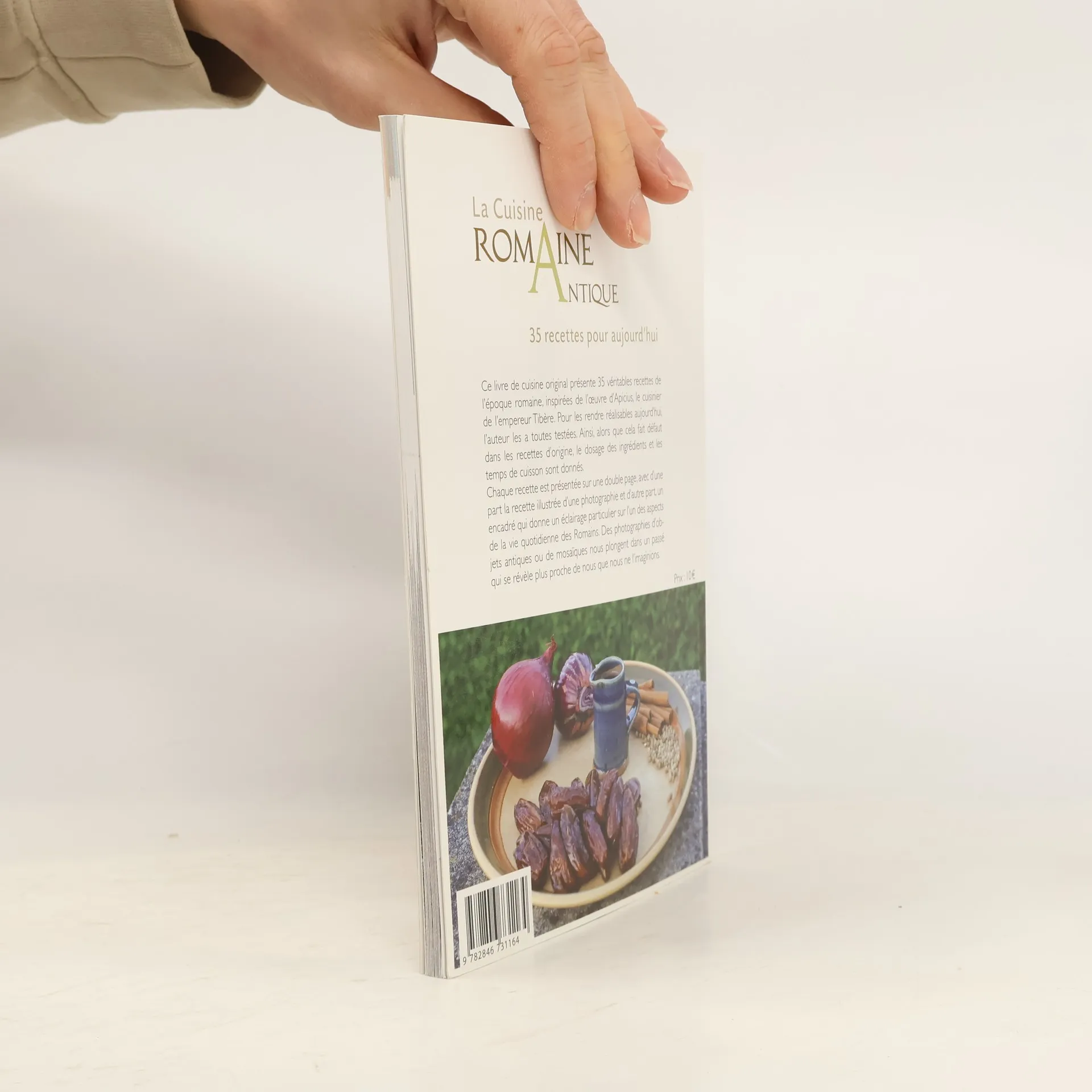 Ce livre de cuisine original présente 35 véritables recettes de l'époque romaine, inspirées de l'oeuvre d'Apicius, le cuisinier de l'empereur Tibère. Pour les rendre réalisables aujourd'hui, l'auteur les a toutes testées. Ainsi, alors que cela fait défaut dans les recettes d'origine, le dosage des ingrédients et les temps de cuisson sont donnés. Chaque recette est présentée sur une double page, avec d'une part la recette illustrée d'une photographie et d'autre part, un encadré qui donne un éclairage particulier sur l'un des aspects de la vie quotidienne des Romains. Des photographies d'objets antiques ou de mosaïques nous plongent dans un passé qui se révèle plus proche de nous que nous ne l'imaginions.
