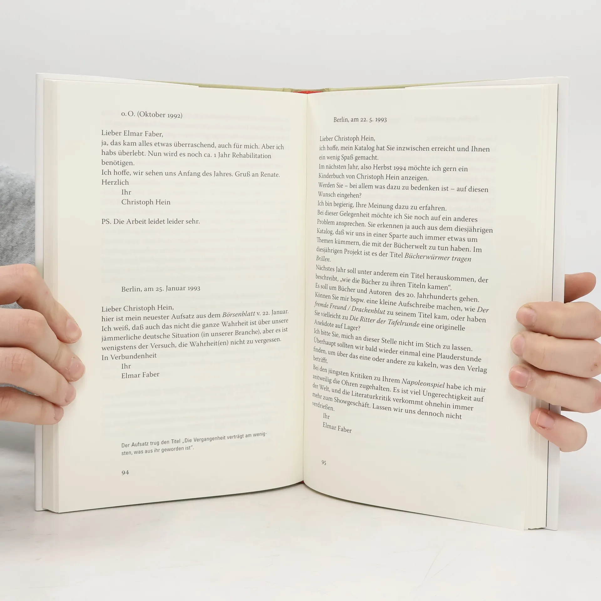 »Nein. Kunst rechnet sich tatsächlich nicht«, so das Verdictum Christoph Heins. Also hat er sich über andere Dinge mit seinem Verleger ausgetauscht. Der Briefwechsel umfasst einen Zeitraum von beinahe 35 Jahren. Das erste Schreiben datiert vom 16.September 1983 und die letzte Notiz ist vom 25. Juli 2017. Im Dezember 2017 stirbt Elmar Faber in seinem Haus in Leipzig. Nach Sichtung des Nachlasses des Verlegers ist es die dauerhafteste Korrespondenz mit einem Autor überhaupt. Elmar Faber hatte im Frühjahr 1983 als Verleger den Berliner Aufbau-Verlag übernommen, dessen Autor Christoph Hein war. Ein halbes Jahr zuvor war mit Der fremde Freund / Drachenblut eines der erfolgreichsten Bücher von Hein erschienen. Es hatte den Anschein, dass sich beide tatsächlich als Brüder im Geiste empfanden. Faber schreibt dazu in seinen Erinnerungen: »Ich wollte, wie Christoph Hein, die Literatur als koproduktive Mitgift für die Gesellschaft aufgefasst wissen, die (auch) Warnschilder aufstellte für Fehlentwicklungen. Wir waren, wie Christoph Hein meinte, nicht nur für das verantwortlich, was wir taten, sondern auch für das, was wir unterließen. Ich glaube, es war diese stille Übereinkunft, die unseren Freundschaftsbund schmiedete …« Diese Ausgabe versteht sich vor allem als Ergänzung zur Rezeption des Werkes von Christoph Hein, der sich gelegentlich auch mit dem Berufsbild des Verlegers kritisch bis ironisch auseinandersetzte. Und sie soll ebenso ein Memorial für den Verleger sein, der 1990 den Verlag Faber & Faber gründete.