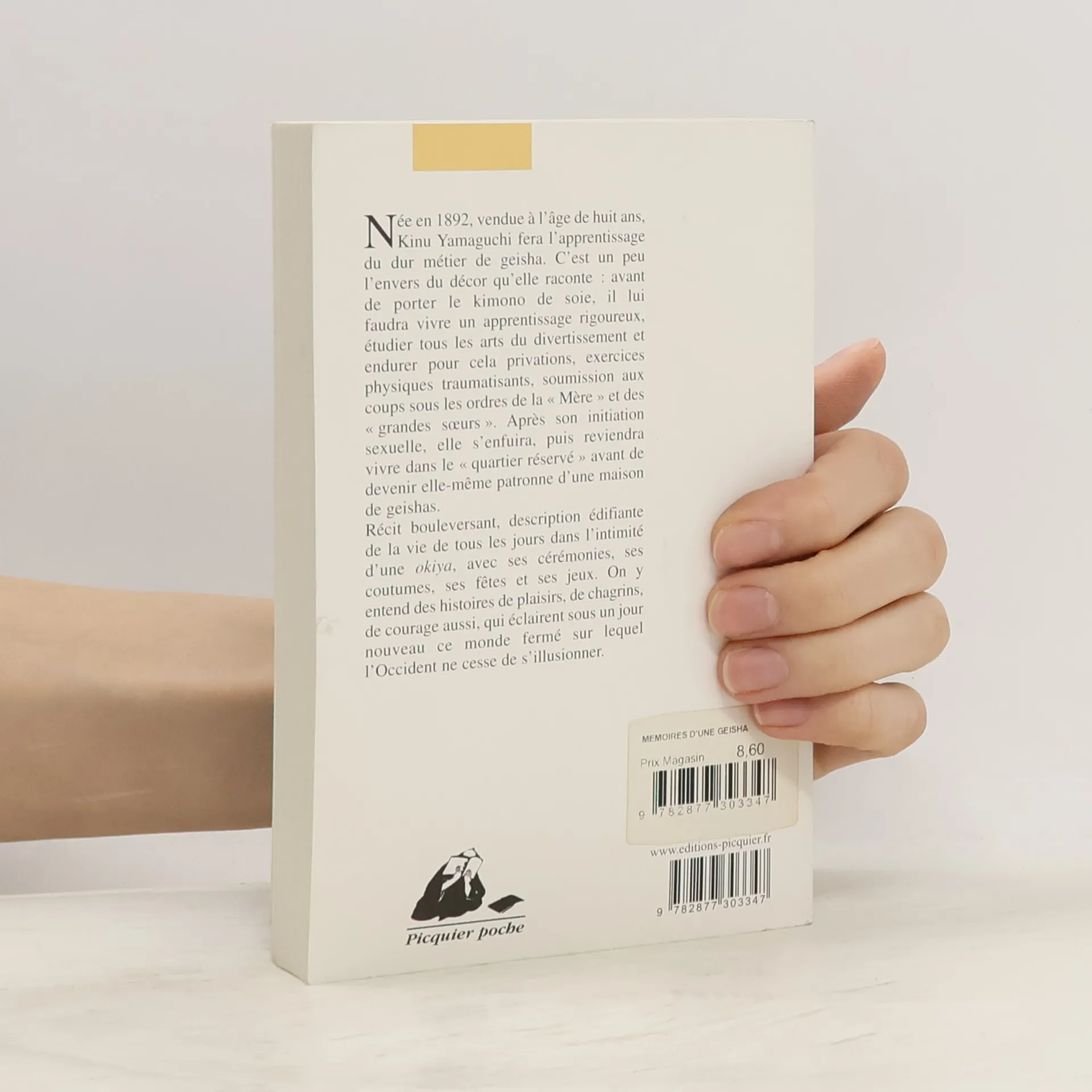 Née en 1892, vendue à l'âge de huit ans, Kinu Yamaguchi fera l'apprentissage du dur métier de geisha. C'est un peu l'envers du décor qu'elle raconte : avant de porter le kimono de soie, il lui faudra vivre un apprentissage rigoureux, étudier tous les arts de divertissement et endurer pour cela privations, exercices physiques traumatisants, soumission aux coups sous les ordres de la "Mère" et des "grandes soeurs". Après son initiation sexuelle, elle s'enfuira, puis reviendra vivre dans le "quartier réservé" avant de devenir elle-même patronne d'une maison de geishas.Récit bouleversant, description édifiante de la vie de tous les jours dans l'intimité d'une okiya, avec ses cérémonies, ses coutumes, ses fêtes et ses jeux. On y entend des histoires de plaisirs, de chagrins, de courage aussi, qui éclairent sous un jour nouveau ce monde fermé sur lequel l'Occident ne cesse de s'illusionner.
