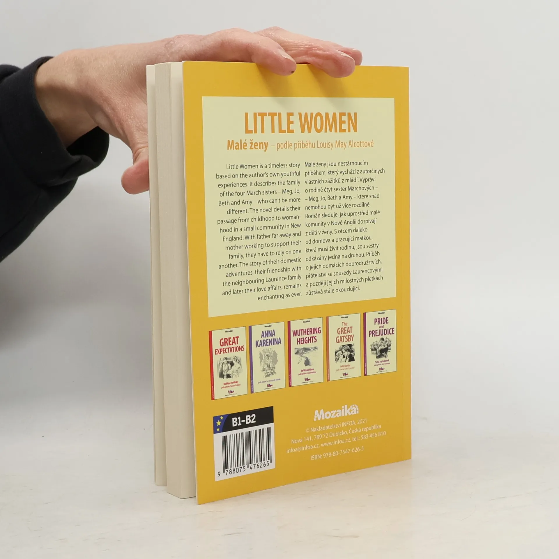 Malé ženy jsou nestárnoucím příběhem, který vychází z autorčiných vlastních zážitků z mládí. Vypráví o rodině čtyř sester Marchových, Meg, Jo, Beth a Amy, které snad nemohou být už více rozdílné. Román sleduje, jak uprostřed malé komunity v Nové Anglii dospívají z dětí v ženy. S otcem daleko od domova a pracující matkou, která musí živit rodinu, jsou sestry odkázány jedna na druhou. Příběh o jejich domácích dobrodružstvích, přátelství se sousedy Laurencovými a později jejich milostných pletkách zůstává stále okouzlující. Anglicko-český zrcadlový text pro mírně pokročilé Little Women is an ageless story based on the author's own experiences from her youth. It tells the story of a family of four March sisters, Meg, Jo, Beth and Amy, who perhaps can no longer be different. The novel follows the development of children from women into women in the middle of a small community in New England. With a father away from home and a working mother who has to support the family, the sisters depend on each other. The story of their home adventures, their friendship with Laurence's neighbors and later their love affairs still remains enchanting. English-Czech mirror text for intermediate students