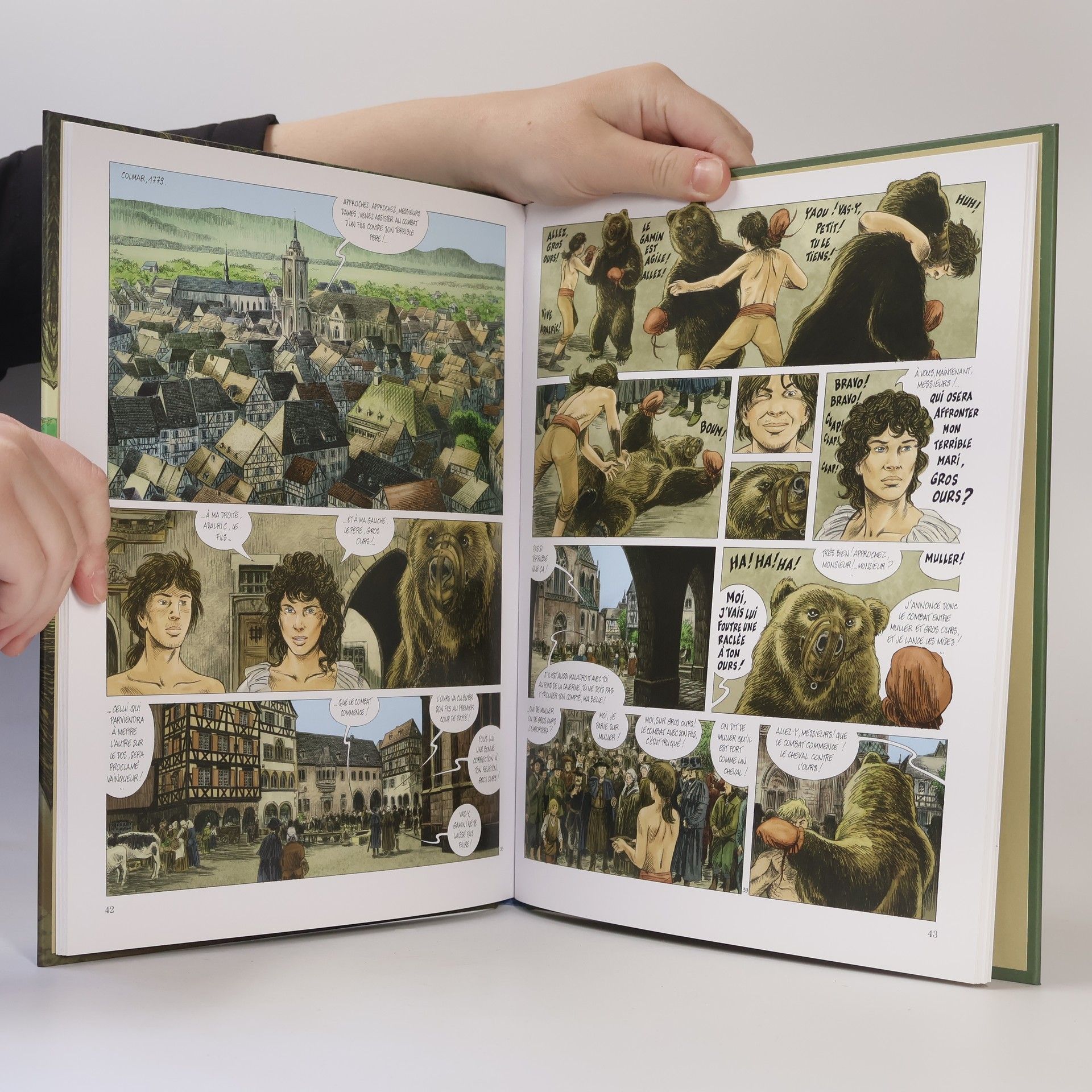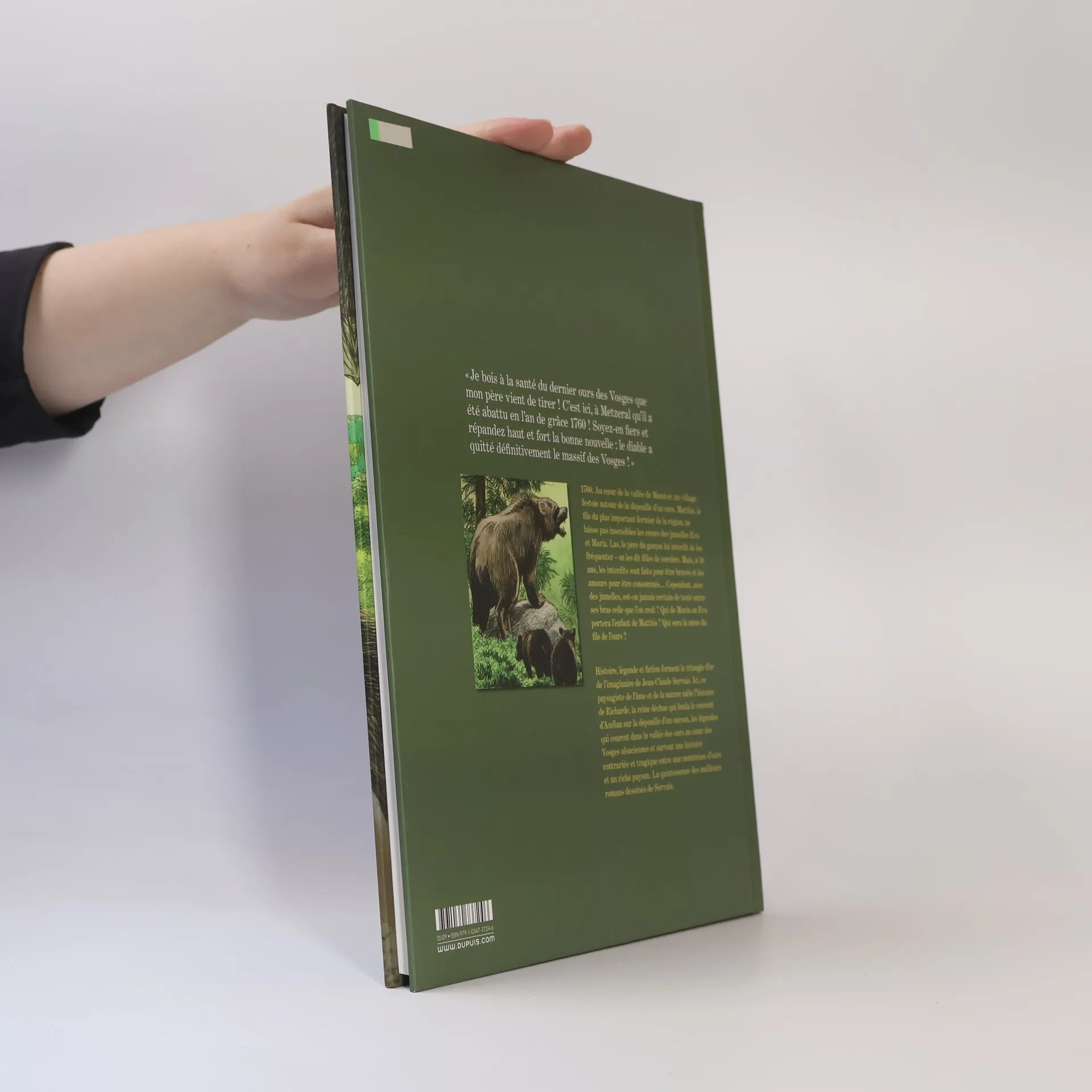 Lorsque l'Empereur Charles III le Gros répudie sa femme Richarde en 880, elle retourne dans son Alsace natale suite à une vision. Là où une ourse gratte la terre pour enterrer son petit, elle devra construire une abbaye. Quelques années plus tard, l'abbaye d'Andlau sort de terre et sera liée à cet animal, roi des forêts. Bien des années plus tard, en 1760, en plein coeur de la vallée de Munster, un village festoie. Le fils encore jeune du plus important fermier de la région ne laisse pas le coeur d'Eva et de Maria insensible. Ces jumelles, que tout oppose pourtant, le trouvent charmant. Mais le père du garçon ne voit pas cela d'un bon oeil et il interdit fermement à son fils de les côtoyer. Mais les interdits sont faits pour être bravés, et à 18 ans, il est difficile de penser au lendemain. Lorsqu'un ours est aperçu dans la vallée, les chasseurs décident de traquer la bête. Mais Eva compte bien le voir avant, d'autant qu'elle connaît la légende d'Andlau et souhaite rencontrer ce gigantesque animal pour de vrai. Maria, moins sereine, va la suivre bien malgré elle. Se noue alors sous les frondaisons et dans la montagne le destin entremêlé de ces humains et de ces animaux. Servais narre ici une légende alsacienne portée par un dessin évocateur et poétique. Une histoire tragique et sublime qui permet de saisir à quel point nos régions gardent encore bien des secrets.