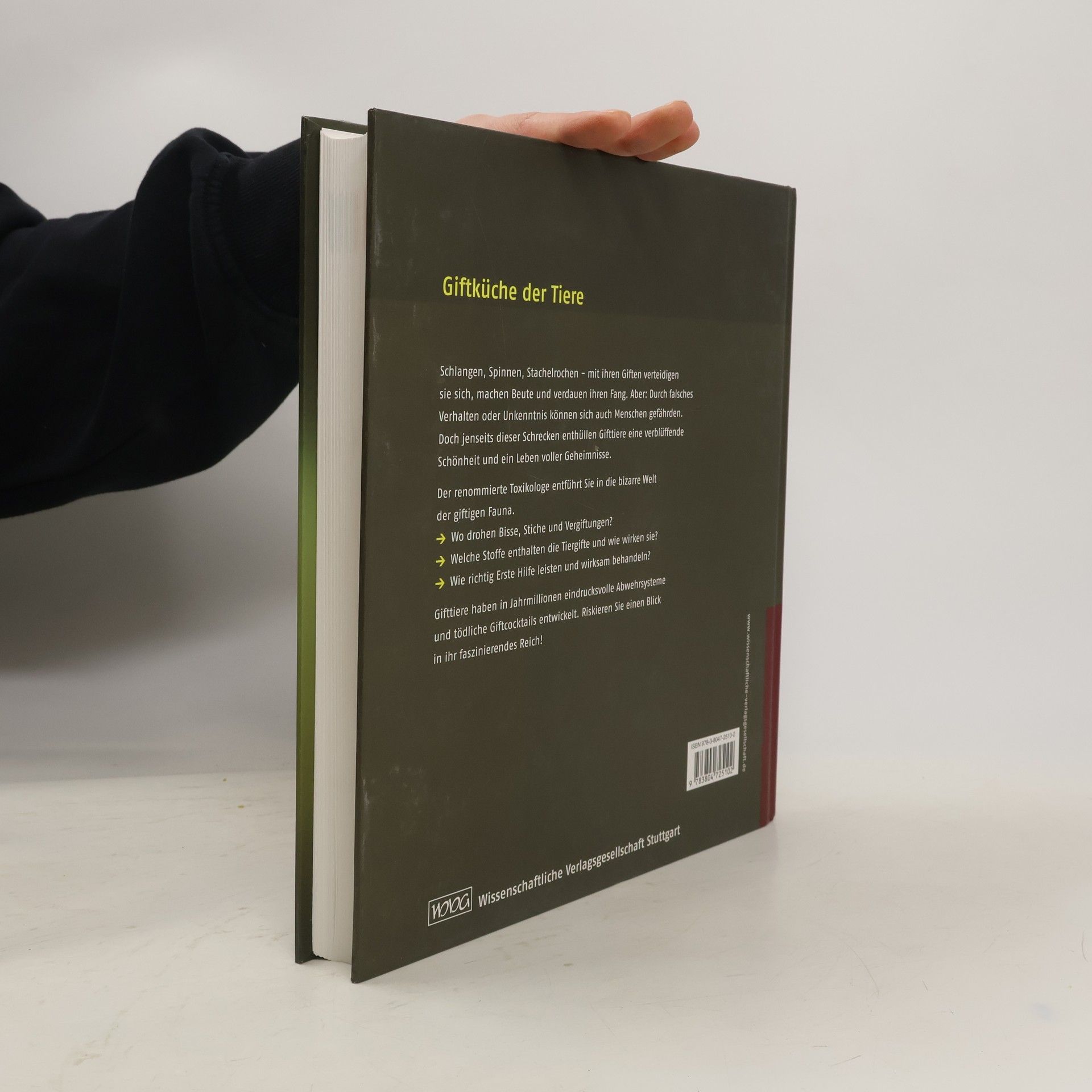 Giftküche der TiereSchlangen, Spinnen, Stachelrochen – mit ihren Giften verteidigen sie sich, machen Beute und verdauen ihren Fang. Aber: Durch falsches Verhalten oder Unkenntnis können sie auch Menschen gefährden. Doch jenseits dieser Schrecken enthüllen Gifttiere eine verblüffende Schönheit und ein Leben voller Geheimnisse. Der renommierte Toxikologe Prof. Dr. Dietrich Mebs entführt Sie in die bizarre Welt der giftigen Fauna. Wo drohen Bisse, Stiche und Vergiftungen? Welche Stoffe enthalten die Tiergifte und wie wirken sie? Wie richtig Erste Hilfe leisten und wirksam behandeln? Gifttiere haben in Jahrmillionen eindrucksvolle Abwehrsysteme und tödliche Giftcocktails entwickelt. Riskieren Sie einen Blick in ihr faszinierendes Reich!