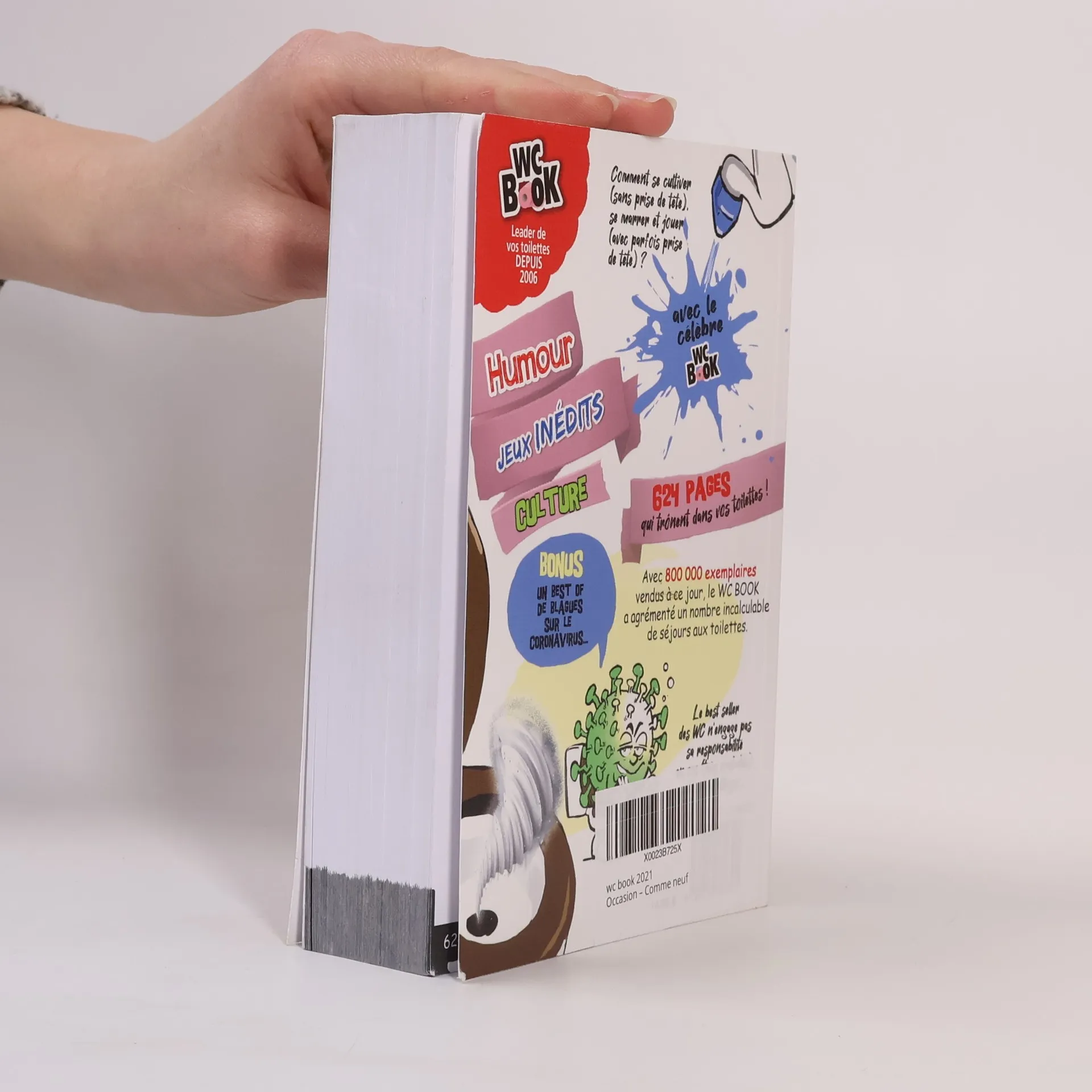 Le WC BOOK, c'est 624 pages qui vous accompagnent chaque année aux toilettes depuis 15 ans !Avec 800 000 exemplaires vendus depuis 2006, comment chiffrer le nombre d'heures passées à dévorer ses contenus éclectiques ? Blagues, contrepèteries, mots croisés, énigmes, anecdotes historiques, scientifiques & culturelles, histoires insolites, quiz, mots mêlés, sudoku, peopleries, charades, des pages dédiées aux "perles du confinement"... Sans oublier les dessins humoristiques décalés de l'illustrateur belge Ah!. Vous avez une bonne excuse pour créer un embouteillage devant les toilettes !