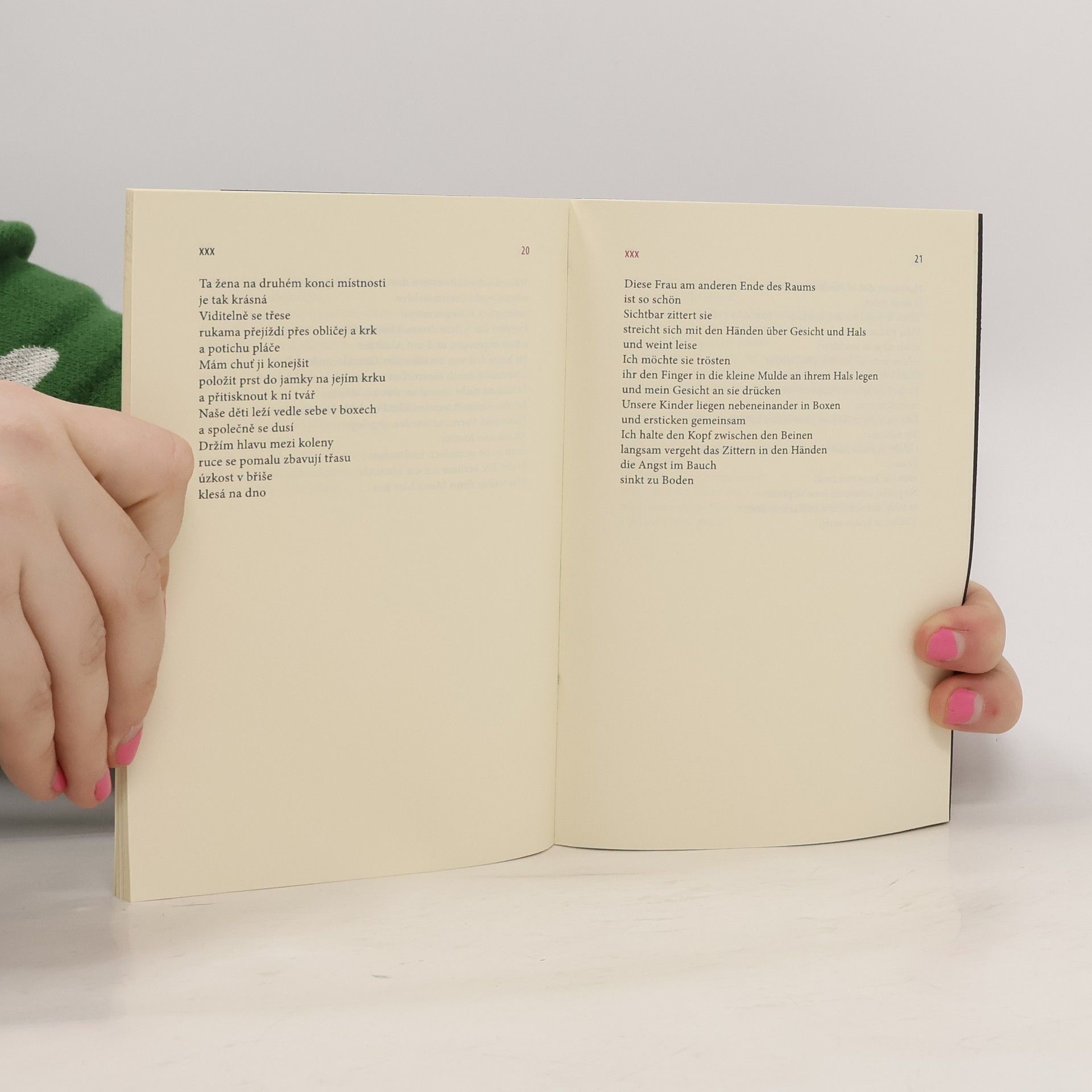 Zweiter Band der Reihe Edition OstroVers des Leipziger hochroth-Verlags mit Gedichten im tschechischen Original und deutscher Übersetzung von Julia Miesenböck.Marie Šťastná, 1981 in der kleinen Stadt Valašské Meziřící im Südosten Mährens geboren, zählt zur jüngeren Generation tschechischer Lyriker und Lyrikerinnen. Typisch für Šťastnás lyrisches Schaffen ist ein zentrales Motiv, das bereits die Titel der letzten beiden Gedichtbände, Akty (dt. »Akte«) und Interiéry (dt. »Interieurs«) anklingen lassen; der Begriff Interieurs, Innenräume, ist hier allerdings nicht nur im wörtlichen, sondern auch im übertragenen Sinn zu verstehen. Das Motiv intimer Sujets entfalten die in diesem Band publizierten Gedichte weiter: Es geht um den Menschen und seine Beziehungen zu den andren, um die eigenen vier Wände, eine neue Wohnung oder das Elternhaus. Ein Teil der Gedichte führt uns hinaus aus privaten Räumen und konfrontiert uns mit der Außenwelt und mit den Menschen, die einem dort begegnen. (Aus dem Nachwort von Julia Miesenböck)