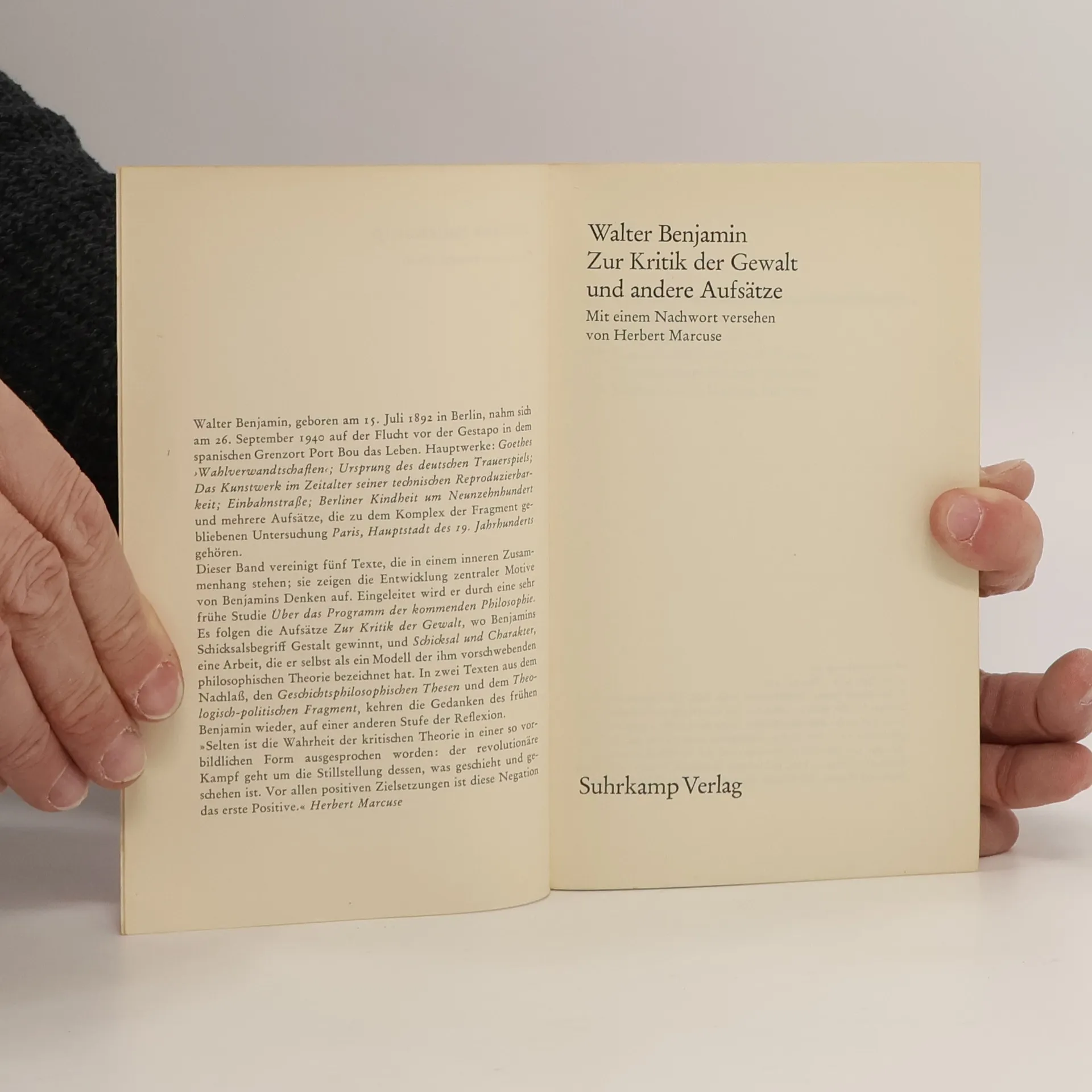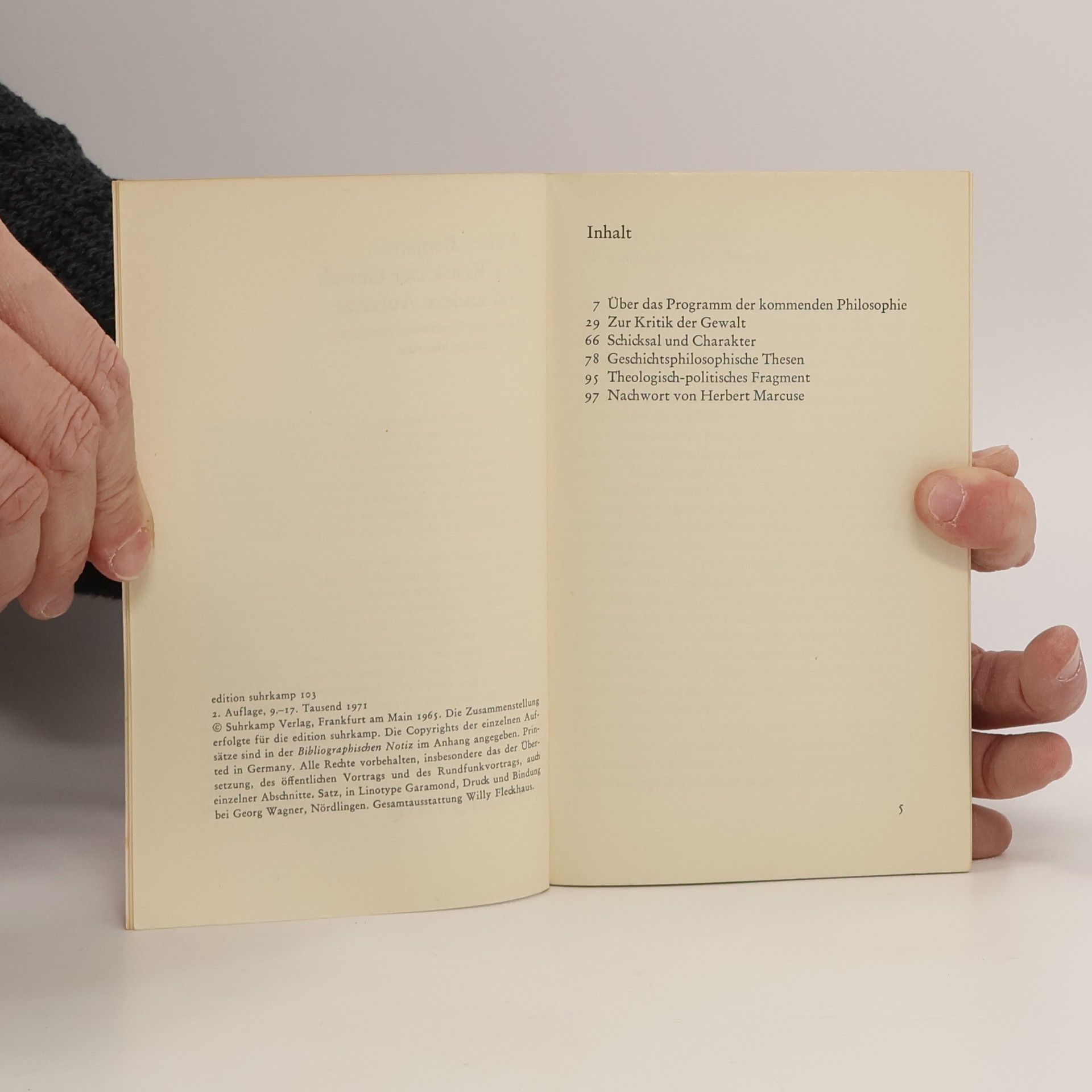 Zur Kritik der Gewalt und andere Aufsätze. Mit einem Nachwort von Herbert Marcuse, Walter Benjamin