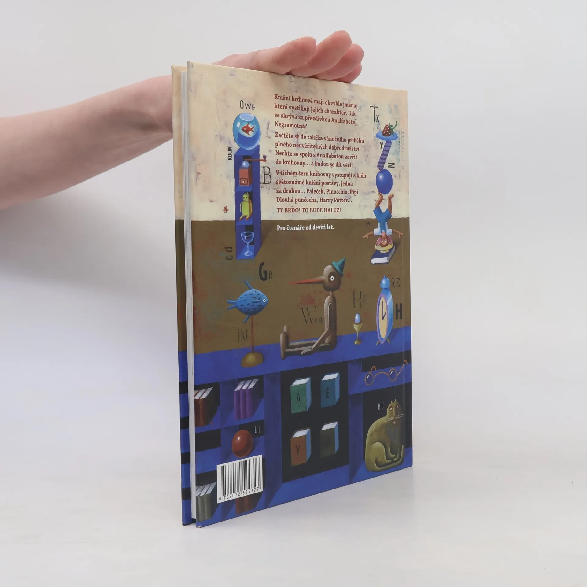 Knižní hrdinové mají obvykle jména, která vystihují jejich charakter. Kdo se skrývá za přezdívkou Analfabeta Negramotná? Začtěte se do takřka vánočního příběhu plného neuvěřitelných dobrodružství. Nechte se spolu s Analfabetou zavřít do knihovny...a budou se dít věci! V tichém šeru knihovny vystupují z knih světoznámé knižní postavy, jedna za druhou...Paleček, Pinocchio, Pipi Dlouhá punčocha, Harry Potter... TY BRĎO! TO BUDE HALUZ!