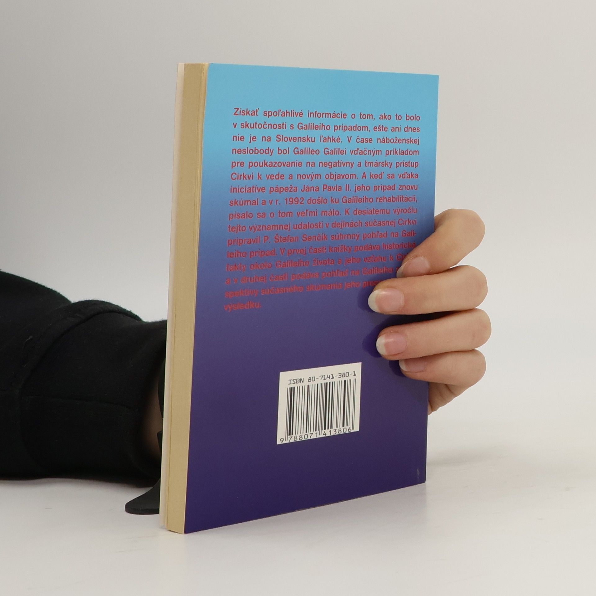 Získať spoľahlivé informácie o tom, ako to bolo v skutočnosti s Galileiho prípadom, ešte ani dnes nie je na Slovensku ľahké. V čase náboženskej neslobody bol Galileo Galilei vďačným príkladom pre poukazovanie na negatívny a tmársky prístup Cirkvi k vede a novým objavom. A keď sa vďaka iniciatíve pápeža Jána Pavla II. jeho prípad znovu skúmal a v r. 1992 došlo ku Galileiho rehabilitácii, písalo sa o tom veľmi málo. K desiatemu výročiu tejto významnej udalosti v dejinách súčasnej Cirkvi pripravil P. Štefan Senčík súhrnný pohľad na Galileiho prípad. V prvej časti knižky podáva historické fakty okolo Galileiho života a jeho vzťahu k Cirkvi a v druhej časti podáva pohľad na Galileiho z perspektívy súčasného skúmania jeho procesu a jeho výsledku. Vydanie prvé