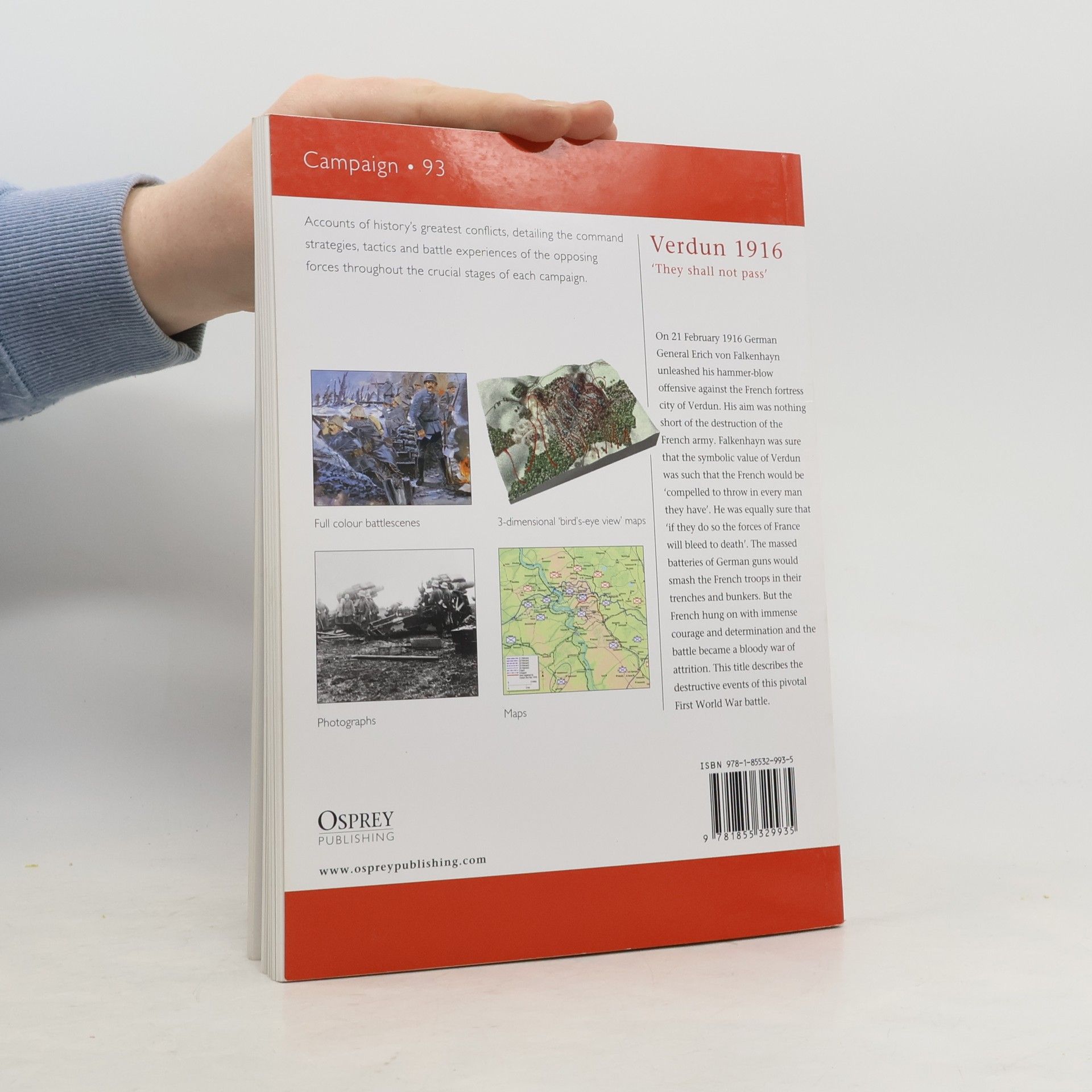 Osprey's examination of the destructive events of a pivotal battle of World War I (1914-1918). On 21 February 1916 German General Erich von Falkenhayn unleashed his hammer-blow offensive against the French fortress city of Verdun. His aim was nothing short of the destruction of the French army. Falkenhayn was sure that the symbolic value of Verdun was such that the French would be ‘compelled to throw in every man they have.’ He was equally sure that ‘if they do so the forces of France will bleed to death’. The massed batteries of German guns would smash the French troops in their trenches and bunkers. But the French hung on with immense courage and determination and the battle became a bloody war of attrition.