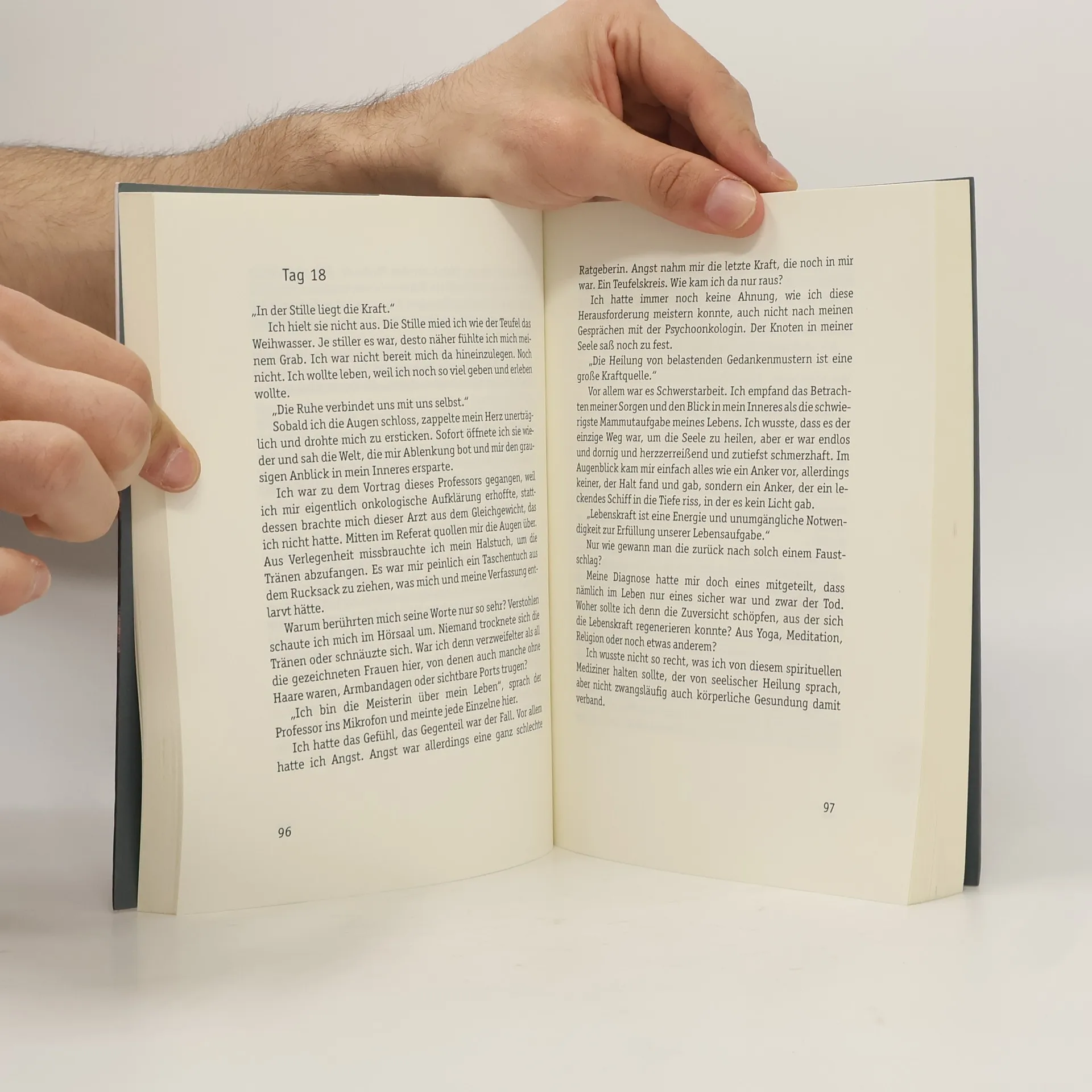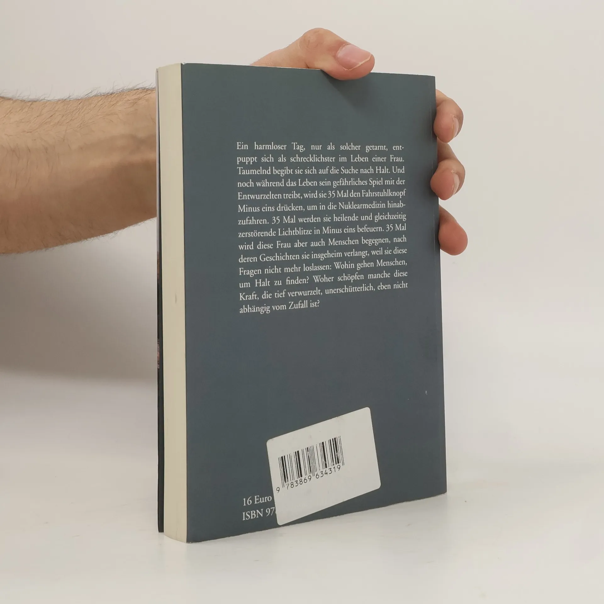 Ein harmloser Tag, nur als solcher getarnt, entpuppt sich als schrecklichster im Leben einer Frau. Taumelnd begibt sie sich auf die Suche nach Halt. Und noch während das Leben sein gefährliches Spiel mit der Entwurzelten treibt, wird sie 35 Mal den Fahrstuhlknopf Minus eins drücken, um in die Nuklearmedizin hinabzufahren. 35 Mal werden sie heilende und gleichzeitig zerstörende Lichtblitze in Minus eins befeuern. 35 Mal wird diese Frau aber auch Menschen begegnen, nach deren Geschichten sie insgeheim verlangt, weil sie diese Fragen nicht mehr loslassen: Wohin gehen Menschen, um Halt zu finden? Woher schöpfen manche diese Kraft, die tief verwurzelt, unerschütterlich, eben nicht abhängig vom Zufall ist?