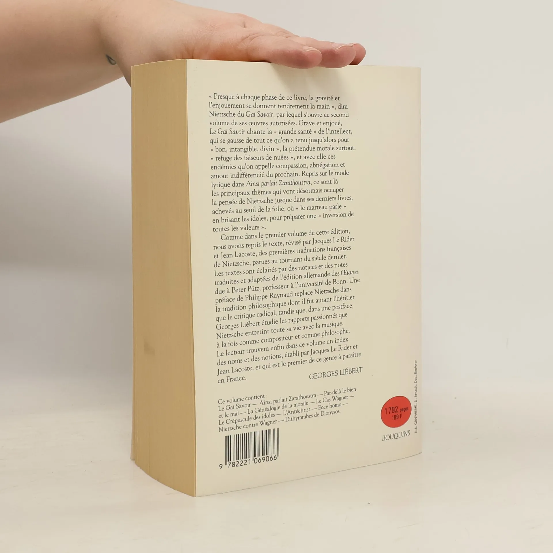 " Presque à chaque phase de ce livre, la gravité et l'enjouement se donnent tendrement la main ", dira Nietzsche du Gai Savoir, par lequel s'ouvre ce second volume de ses oeuvres autorisées. Grave et enjoué, Le Gai Savoir chante la " grande santé " de l'intellect, qui se gausse de tout ce qu'on a tenu jusqu'alors pour " bon, intangible, divin ", la prétendue morale surtout, " refuge des faiseurs de nuées ", et avec elle ces endémies qu'on appelle compassion, abnégation et amour indifférencié du prochain. Repris sur le mode lyrique dans Ainsi parlait Zarathoustra, ce sont là les principaux thèmes qui vont désormais occuper la pensée de Nietzsche jusque dans ses derniers livres, achevés au seuil de la folie, où " le marteau parle " en brisant les idoles, pour préparer une " inversion de toutes les valeurs ". Comme dans le premier volume de cette édition, nous avons repris le texte, révisé par Jacques Le Rider et Jean Lacoste, des premières traductions françaises de Nietzsche, parues au tournant du siècle dernier. Les textes sont éclairés par des notices et des notes traduites et adaptées de l'édition allemande des Oeuvres due à Peter Pütz, professeur à l'université de Bonn. Une préface de Philippe Raynaud replace Nietzsche dans la tradition philosophique dont il fut autant l'héritier que le critique radical, tandis que, dans une postface, Georges Liébert étudie les rapports passionnés que Nietzsche entretint toute sa vie avec la musique, à la fois comme compositeur et comme philosophe. Le lecteur trouvera enfin dans ce volume un index des noms et des notions, établi par Jacques Le Rider et Jean Lacoste, et qui est le premier de ce genre à paraître en France.
