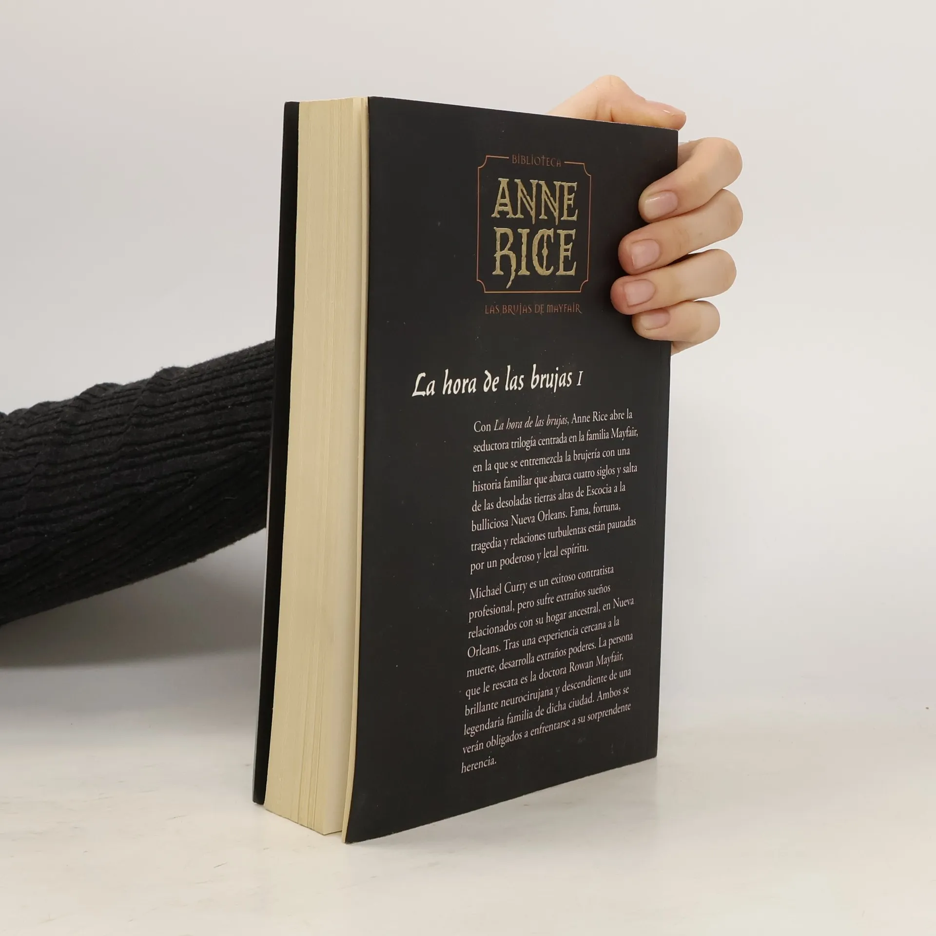 Con La hora de las brujas, Anne Rice abre la seductora trilogía centrada en la familia Mayfair, en la que se entremezcla la brujería con una historia familiar que abarca cuatro siglos y salta de las desoladas tierras altas de Escocia a la bulliciosa Nueva Orleans. Fama, fortuna, tragedia y relaciones turbulentas están pautadas por un poderoso y letal espíritu.Michael Curry es un exitoso contratista profesional, pero sufre extraños sueños relacionados con su hogar ancestral, en Nueva Orleans. Tras una experiencia cercana a la muerte, desarrolla extraños poderes. La persona que le rescata es la doctora Rowan Mayfair, brillante neurocirujana y descendiente de una legendaria familia de dicha ciudad. Ambos se verán obligados a enfrentarse a su sorprendente herencia.