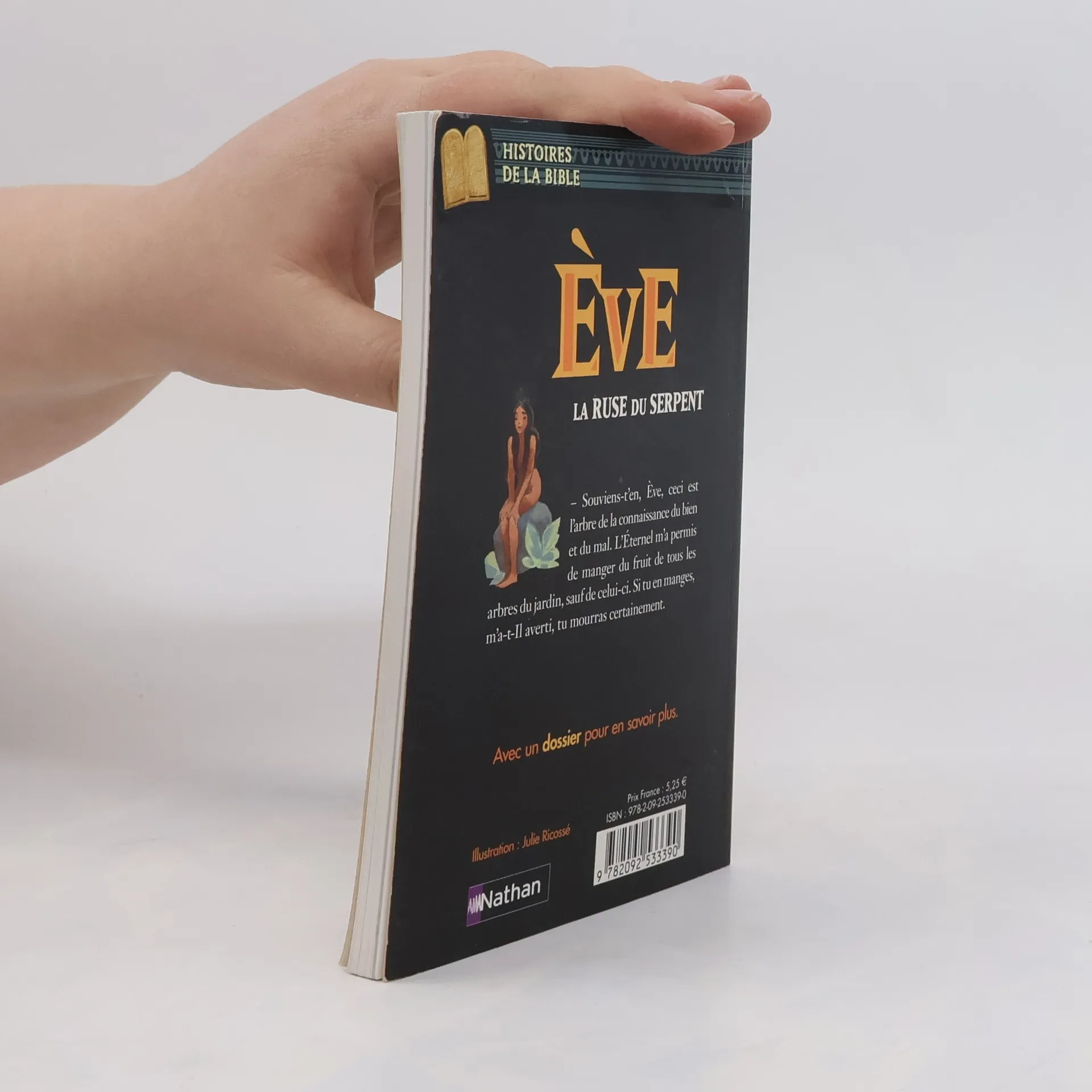 La curiosité insatiable d'Eve qui mena à la chute du jardin d'Eden. Dieu a créé une compagne à Adam, une créature qui lui ressemble mais plus douce, plus ronde : Eve. Emerveillé, Adam lui fait découvrir les splendeurs du jardin d'Eden. Louant chaque jour le Seigneur, Adam et Eve vivent pleinement leur amour. Pourtant, la curiosité gagne Eve : qu'y a-t-il au delà du jardin ? Elle rencontre le serpent qui lui affirme qu'elle le saura en mangeant le fruit de l'arbre de la connaissance. Ayant cédé à la tentation, elle pousse Adam à faire de même. Les voilà possesseurs de la science du bien et du mal. Dieu ne peut les garder au Paradis, et les condamne à la vie terrestre, à la souffrance et à la mort. Ils apprennent alors à vivre leur condition humaine, créant à leur tour une créature : leur fils, Caïn...Histoires de la Bible, des livres pour les enfants dès 11 ans.