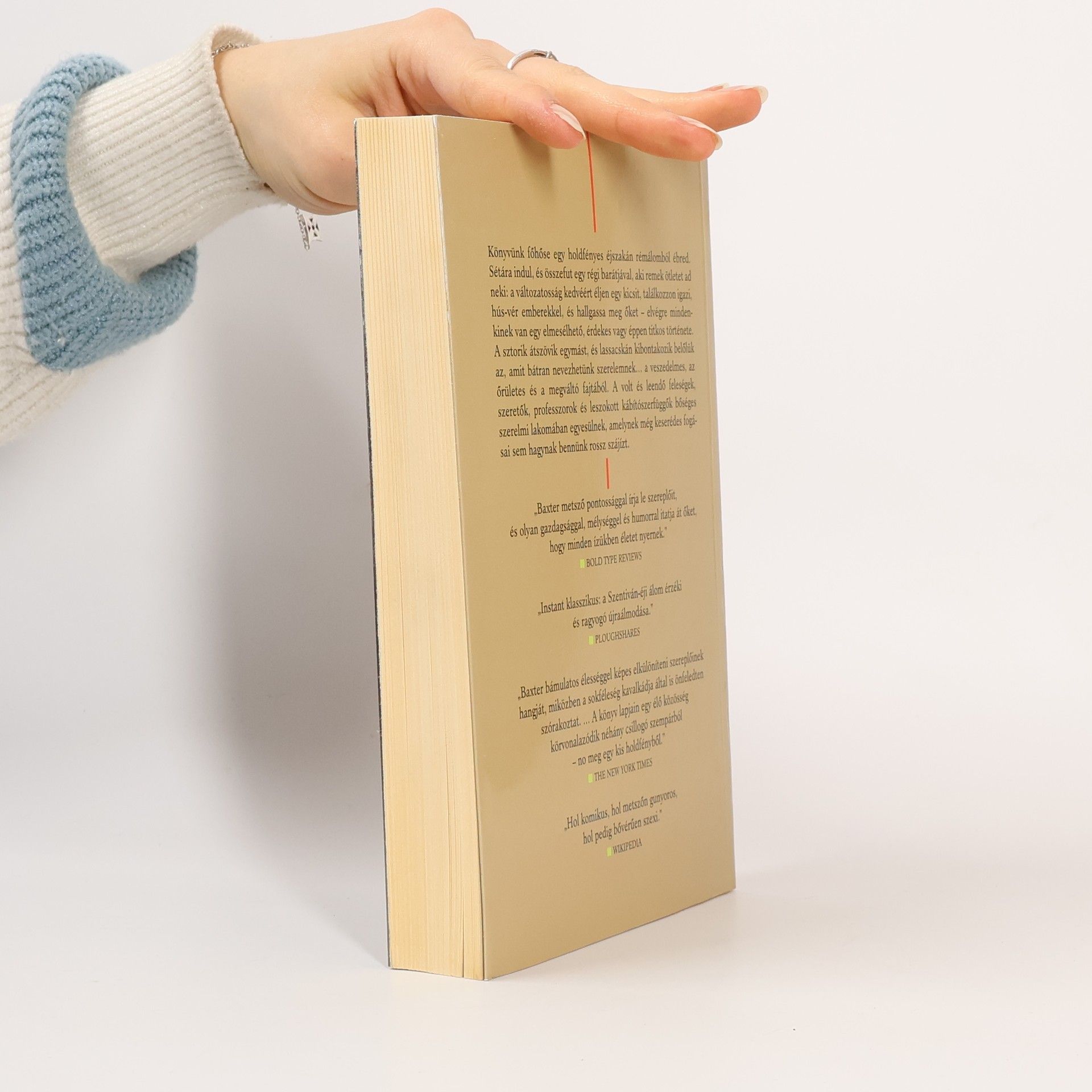 Könyvünk főhőse egy holdfényes éjszakán rémálomból ébred. Sétára indul, és összefut egy régi barátjával, aki remek ötletet ad neki: a változatosság kedvéért éljen egy kicsit, találkozzon igazi, hús-vér emberekkel, és hallgassa meg őket – elvégre mindenkinek van egy elmesélhető, érdekes, vagy éppen titkos története. A sztorik átszövik egymást, és lassacskán kibontakozik valami, amit bátran nevezhetünk szerelemnek… a veszedelmes, az őrületes és a megváltó fajtából. A volt és leendő feleségek, szeretők, professzorok, és leszokott kábítószerfüggők bőséges szerelmi lakomában egyesülnek, amelynek még keserédes fogási sem hagynak bennünk rossz szájízt.