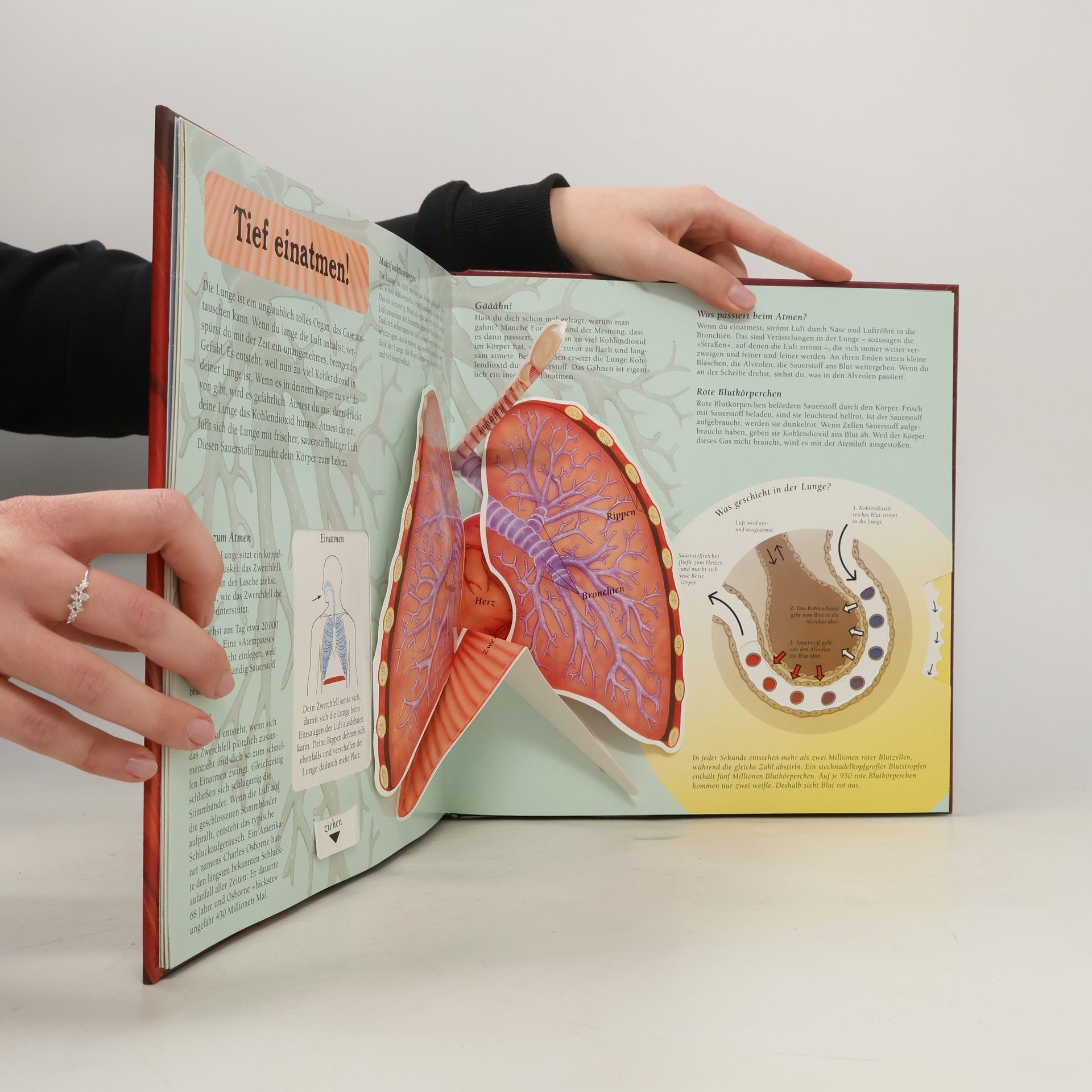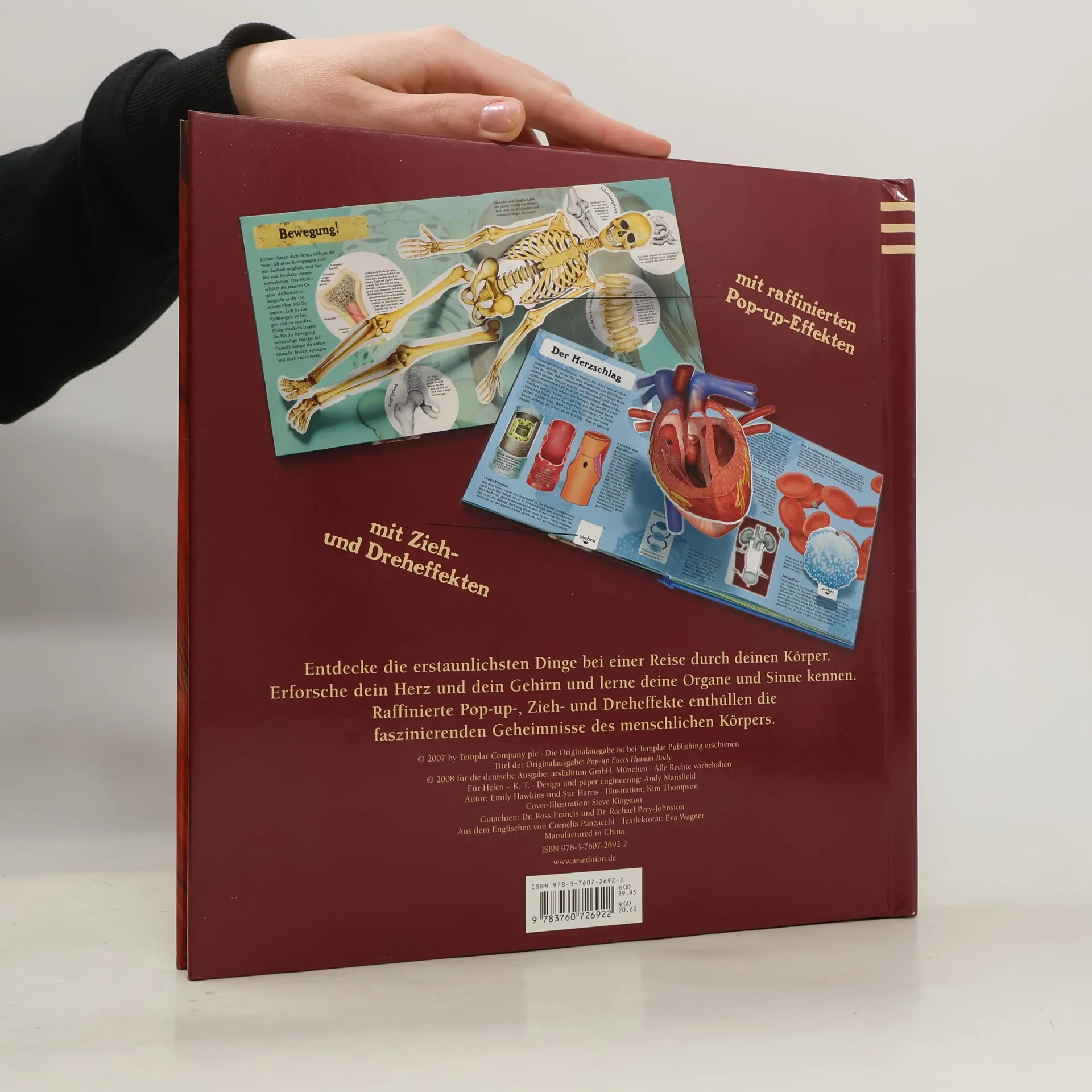 Mit detailgetreuen Illustrationen, Pop-up-Effekten und raffinierten Zieh-Elementen taucht der Leser in diesem Sachbuch in die Geheimnisse des menschlichen Körpers ein – und wird dabei selbst aktiv! Welche Aufgaben haben unsere Organe? Warum bluten wir, wenn wir uns schneiden? Die Antworten liefert dieses aufregende Sachbuch, das komplexes Wissen verständlich aufbereitet. Knappe, gut verständliche Erklärungen und viele ergänzende Zusatzinformationen erläutern das Wunderwerk unseres Körpers.