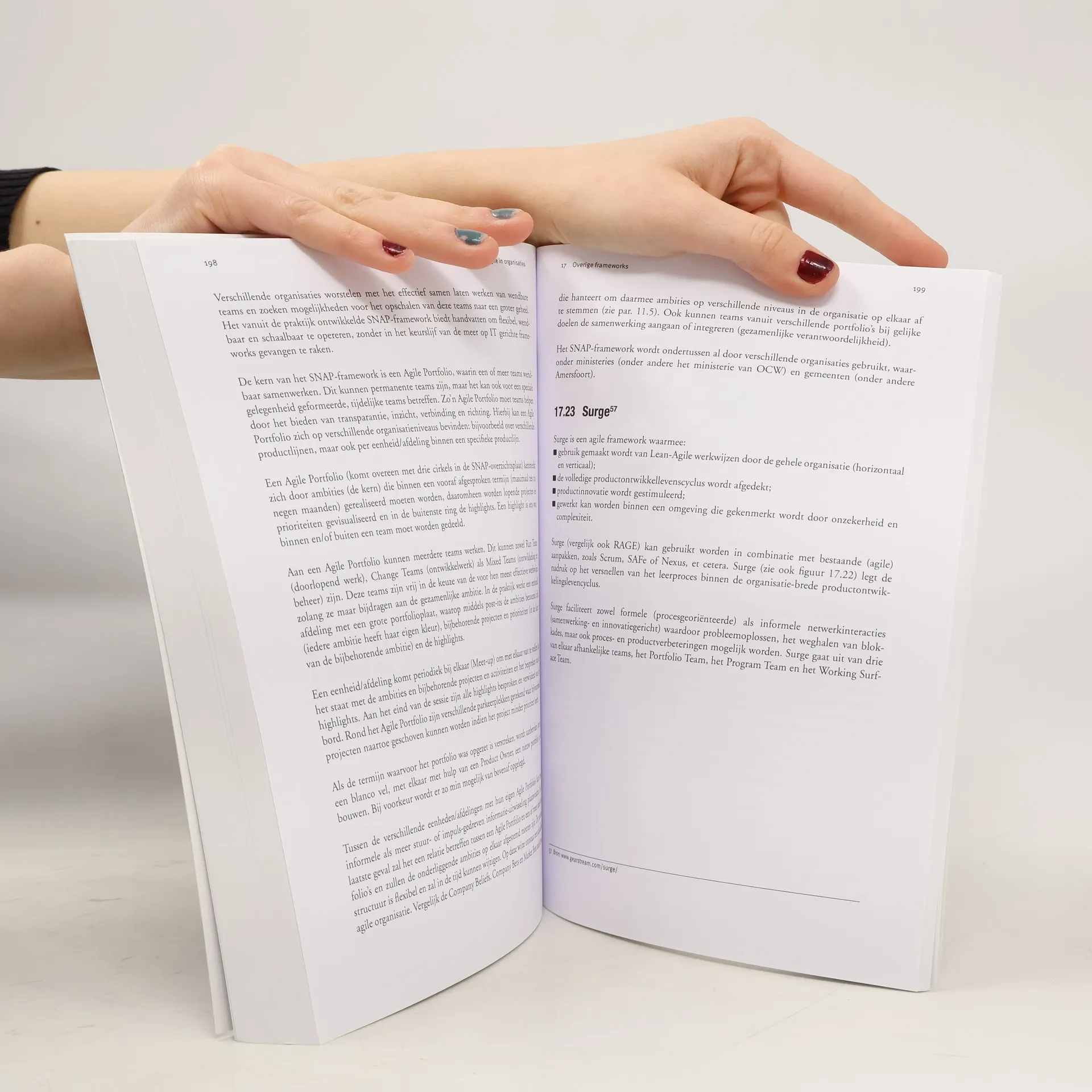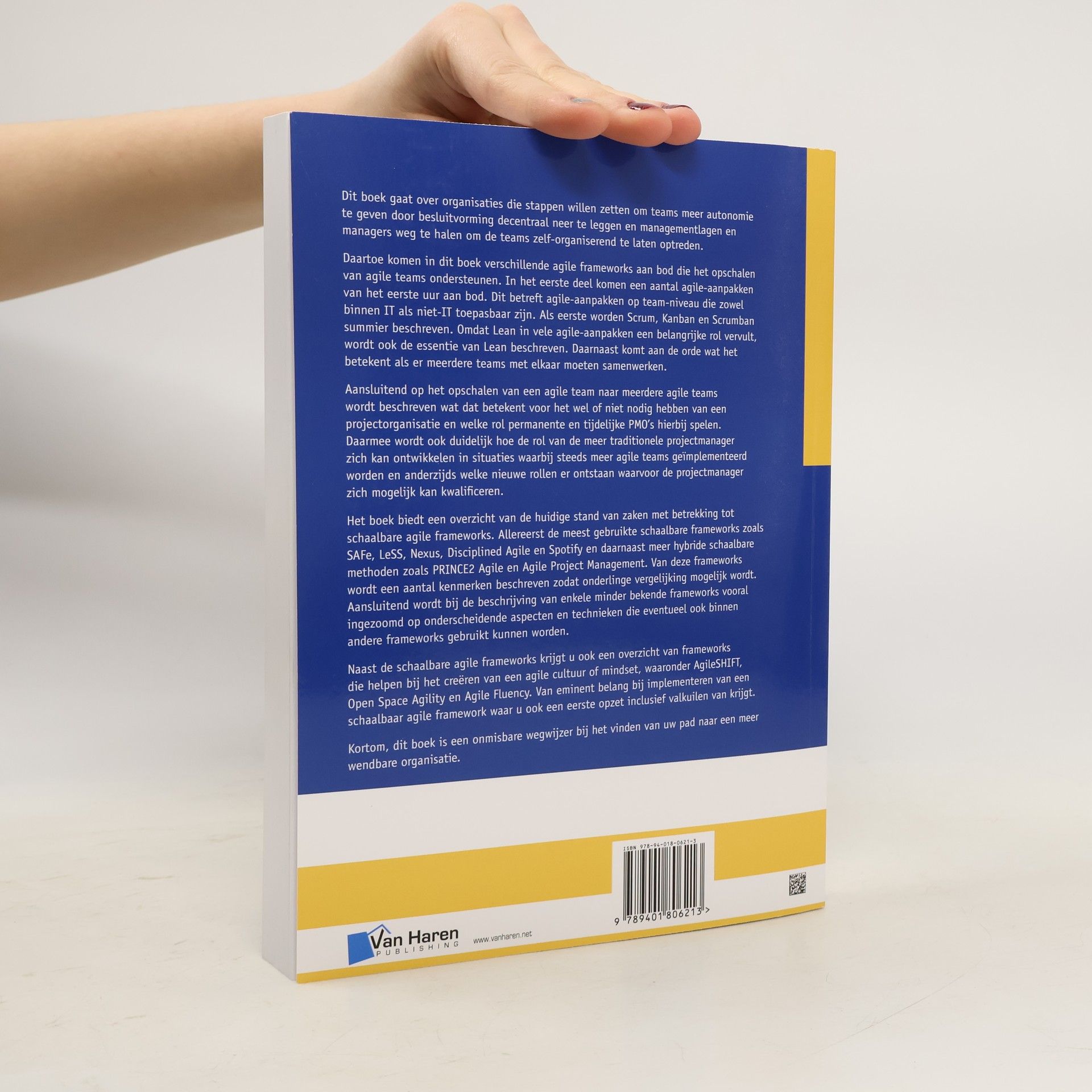 Dit boek behandelt organisaties die streven naar meer autonomie voor teams door besluitvorming te decentraliseren en managementlagen te verminderen, zodat teams zelf-organiserend kunnen functioneren. Diverse agile frameworks die het opschalen van agile teams ondersteunen, komen aan bod. Het eerste deel bespreekt agile-aanpakken op teamniveau, toepasbaar binnen zowel IT als niet-IT. Scrum, Kanban en Scrumban worden kort beschreven, evenals de essentie van Lean, dat een belangrijke rol speelt in veel agile-aanpakken. De samenwerking tussen meerdere teams wordt ook behandeld. Vervolgens wordt ingegaan op de implicaties van het opschalen van agile teams, zoals de noodzaak van een projectorganisatie en de rol van permanente en tijdelijke PMO's. Dit biedt inzicht in de ontwikkeling van de traditionele projectmanager in een omgeving met meer agile teams en de nieuwe rollen die kunnen ontstaan. Het boek biedt een overzicht van de huidige stand van zaken rond schaalbare agile frameworks, waaronder SAFe, LeSS, Nexus, Disciplined Agile en Spotify, en hybride methoden zoals PRINCE2 Agile. Kenmerken van deze frameworks worden beschreven voor onderlinge vergelijking. Daarnaast worden minder bekende frameworks besproken, met focus op unieke aspecten en technieken. Ook wordt aandacht besteed aan frameworks die helpen bij het creëren van een agile cultuur, zoals AgileSHIFT en Open Space Agility. Het boek biedt een eerste opzet voor de implem