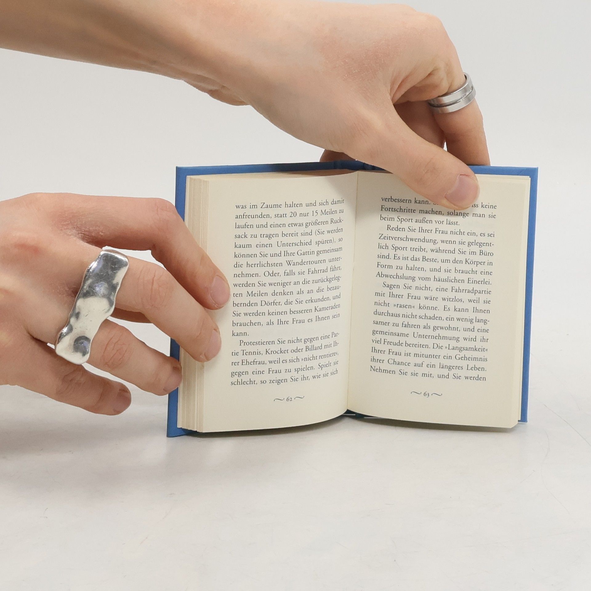 Ratschläge für IHN: „Lassen Sie nicht allerorts im Salon Ihre Cigarettenasche auf den Teppich fallen, auch wenn Freunde Ihnen versichern, dies verstärke die Farbgebung!“ „Schlendern Sie nicht durch das ganze Haus und spitzen dabei Ihre Bleistifte.“ „Verachten Sie nicht die praktische Gesinnung Ihrer Frau, nur weil sie nicht das ist, was man eine Leuchte nennt.“