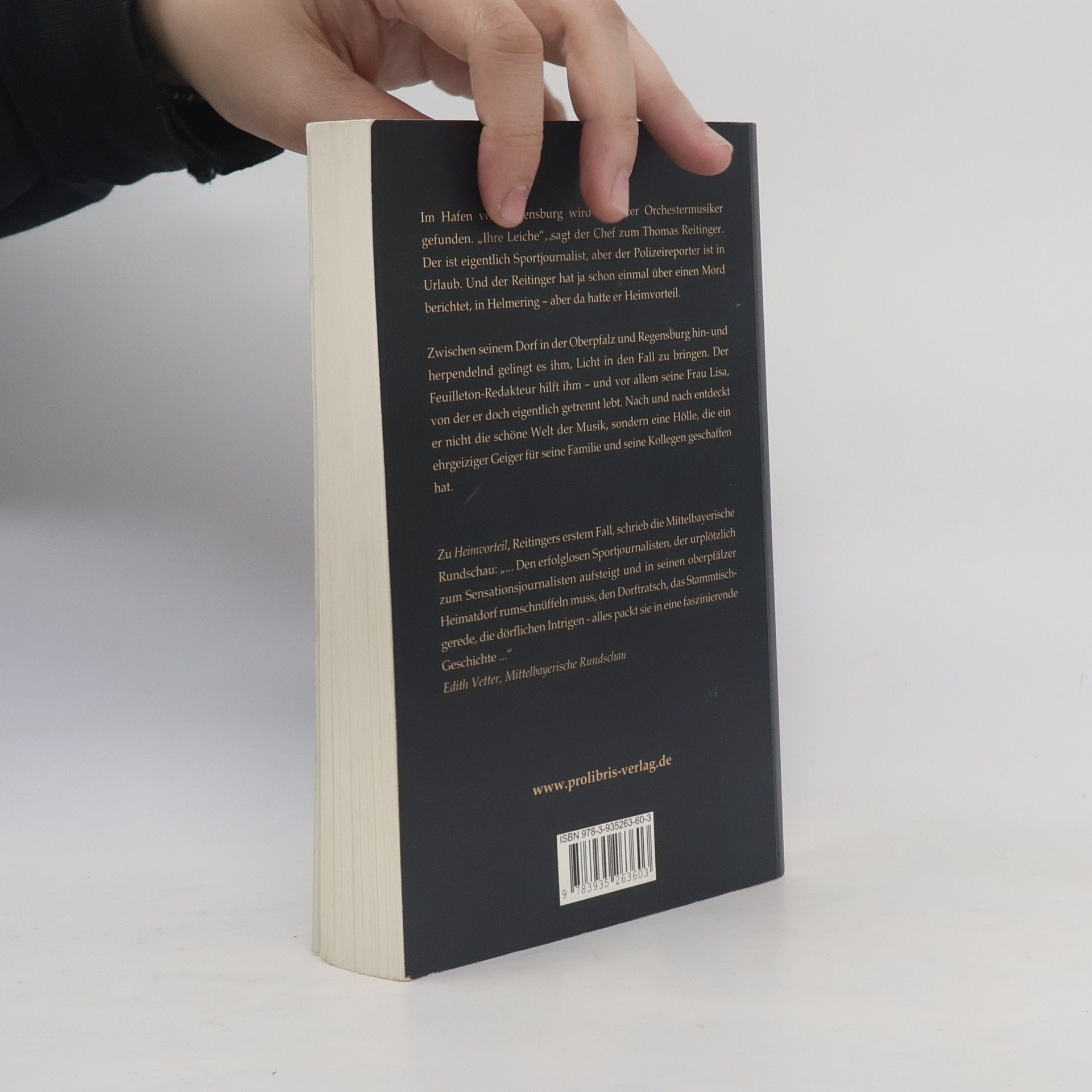 Im Hafen von Regensburg wird ein toter Orchestermusiker gefunden. „Ihre Leiche“, sagt der Chef zum Thomas Reitinger. Der ist eigentlich Sportjournalist, aber der Polizeireporter ist in Urlaub. Und der Reitinger hat ja schon einmal über einen Mord berichtet, in Helmering – aber da hatte er Heimvorteil. Zwischen seinem Dorf in der Oberpfalz und Regensburg hin- und herpendelnd gelingt es ihm, Licht in den Fall zu bringen. Der Feuilleton-Redakteur hilft ihm – und vor allem seine Frau Lisa, von der er doch eigentlich getrennt lebt. Nach und nach entdeckt er nicht die schöne Welt der Musik, sondern eine Hölle, die ein ehrgeiziger Geiger für seine Familie und seine Kollegen geschaffen hat.