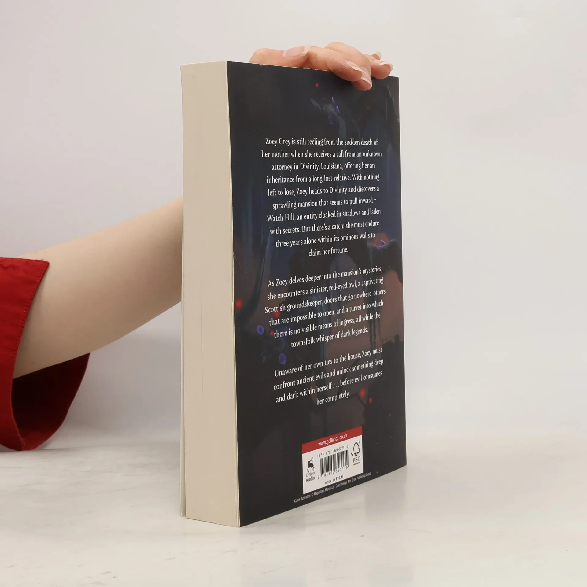 Zoey (or Zo, like no) Grey is reeling from the sudden death of her mother when she receives a surprising call from an attorney in Divinity, Louisiana, with the news she has been left an inheritance by a distant relative, the terms of which he will only discuss in person. Destitute and alone, with nothing left to lose, Zo heads to Divinity and discovers she is the sole beneficiary of a huge fortune and a monstrosity of a house that sits ominously at the peak of Watch Hill-but she must live in it, alone, for three years before the house, or the money, is hers.Met with this irresistible opportunity to finally build a future for herself, Zo puts aside her misgivings about the foreboding Gothic mansion and the strange circumstances, and moves in, where she is quickly met by a red-eyed Stygian owl and an impossibly sexy Scottish groundskeeper.Her new home is full of countless secrets and mystifying riddles, with doors that go nowhere, others that are impossible to open, and a turret into which there is no visible means of ingress. And the townspeople are odd...What Zo doesn't yet know is that her own roots lie in this very house and that in order to discover her true identity and awaken her dormant powers, she will have to face off against sinister forces she doesn't quite comprehend-or risk being consumed by them.