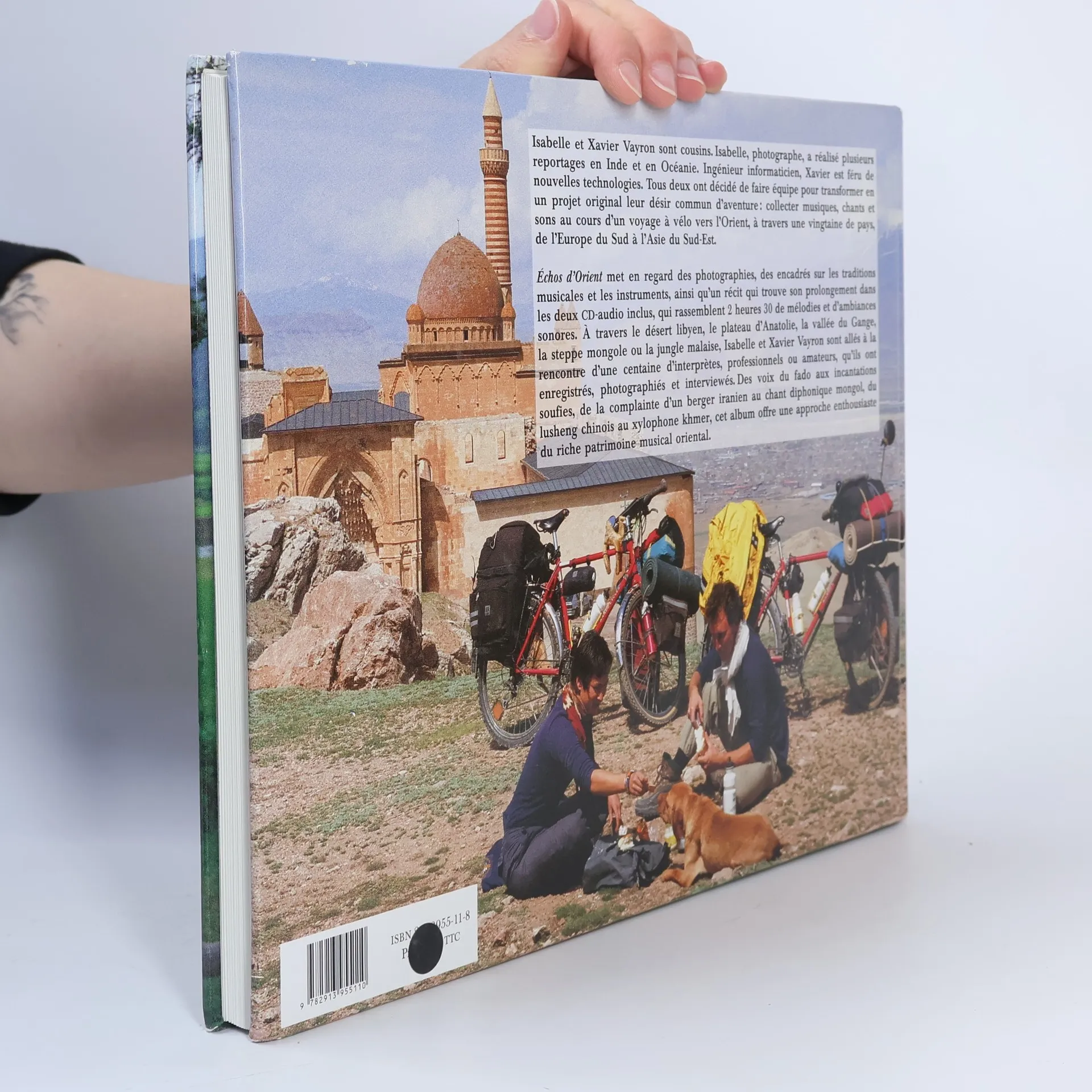 Isabelle et Xavier Vayron sont cousins. Isabelle, photographe, a réalisé plusieurs reportages en Inde et en Océanie. Ingénieur informaticien, Xavier est féru de nouvelles technologies. Tous deux ont décidé de faire équipe pour transformer en un projet original leur désir commun d'aventure : collecter musiques, chants et sons au cours d'un voyage à vélo vers l'Orient, à travers une vingtaine de pays, de l'Europe du Sud à l'Asie du Sud-Est. Echos d'Orient met en regard des photographies, des encadrés sur les traditions musicales et les instruments, ainsi qu'un récit qui trouve son prolongement dans les deux CD-audio inclus, qui rassemblent 2 heures 30 de mélodies et d'ambiances sonores. A travers le désert libyen, le plateau d'Anatolie, la vallée du Gange, la steppe mongole ou la jungle malaise, Isabelle et Xavier Vayron sont allés à la rencontre d'une centaine d'interprètes, professionnels ou amateurs, qu'ils ont enregistrés, photographiés et interviewés. Des voix du fado aux incantations soufies, de la complainte d'un berger iranien au chant diphonique mongol, du lusheng chinois au xylophone khmer, cet album offre une approche enthousiaste du riche patrimoine musical oriental.