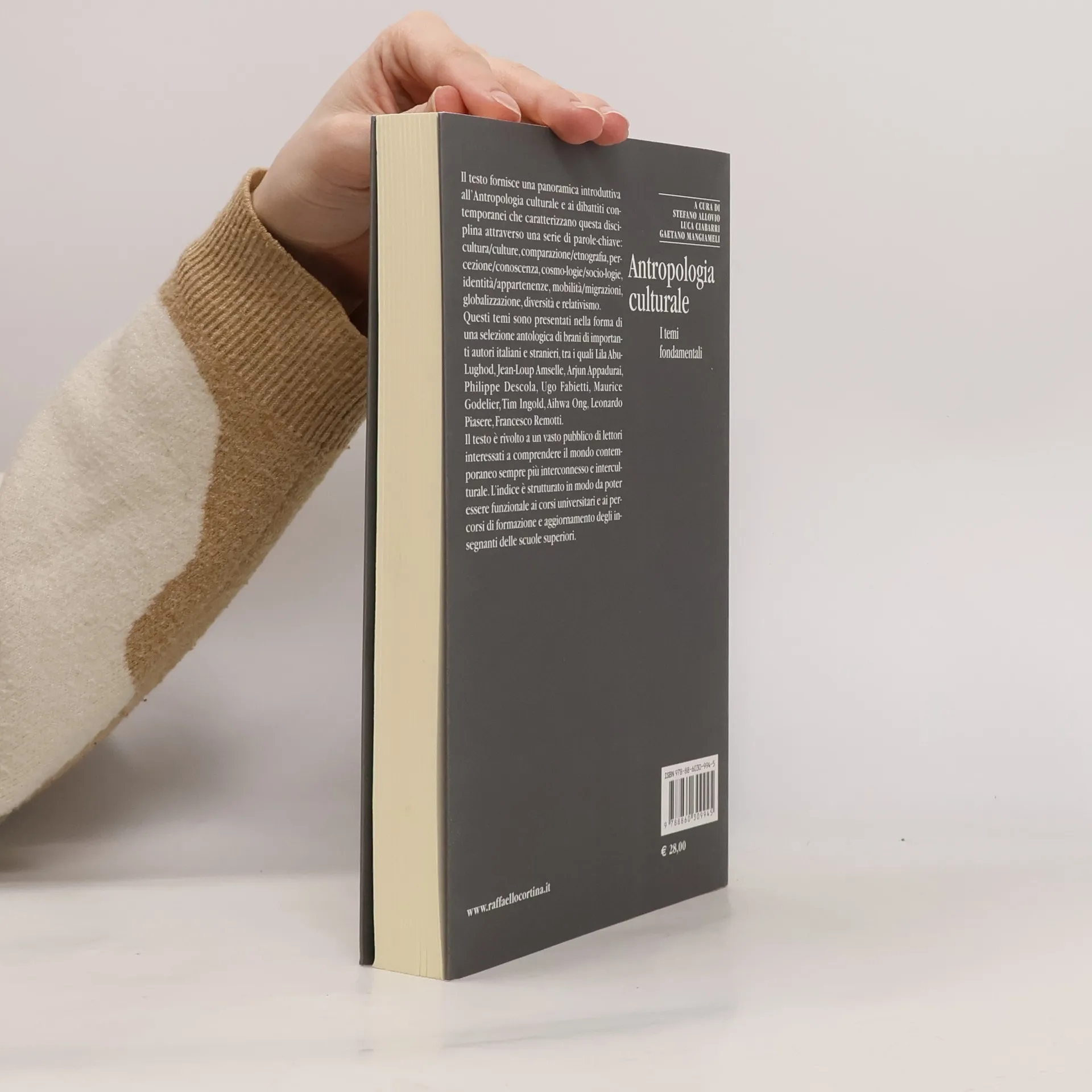 Il testo fornisce una panoramica introduttiva all’antropologia culturale e ad alcuni dibattiti contemporanei che caratterizzano questa disciplina attraverso una serie di parole-chiave, tra cui cultura/culture, evoluzione, etnografia, diversità culturale, percezione/conoscenza, mobilità, globalizzazione, razza/etnia, sesso/genere. Questi temi sono presentati nella forma di una selezione antologica di brani di importanti autori italiani e stranieri, tra i quali Jean Loup Amselle, Arjun Appadurai, Philippe Descola, Ugo Fabietti, Aihwa Ong, Francesco Remotti. Il volume è strutturato in modo da poter essere funzionale nei corsi universitari e nei percorsi di formazione e aggiornamento degli insegnanti delle scuole superiori.