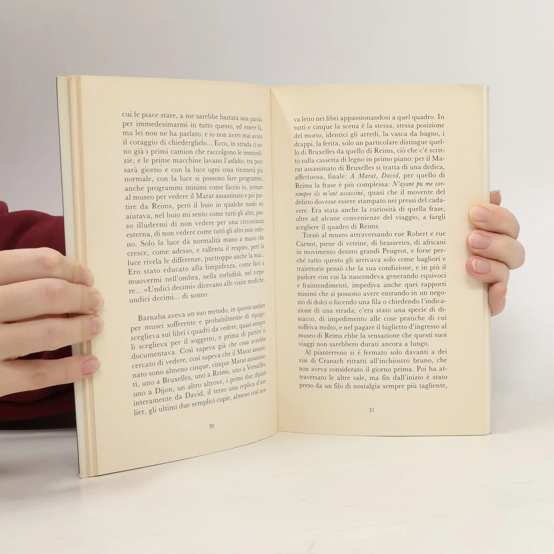 «Il y a des gens qui se tiennent tout entiers au bord de leurs yeux. Ils surgissent de là. Cela ne dépend pas de leurs qualités intérieures, peut-être d'autres, plus riches intérieurement, ont un regard qui n'arrive pas jusqu'à la pupille, il s'arrête avant, on ne sait où, que sais-je, au diaphragme, à la poitrine, ou quelque part dans leur tête. Je ne sais pas comment vous voyez, mais votre regard se voit tellement. Vous êtes totalement là, au bord de vos yeux.» Traduit de l'italien par Jean-Paul Manganaro