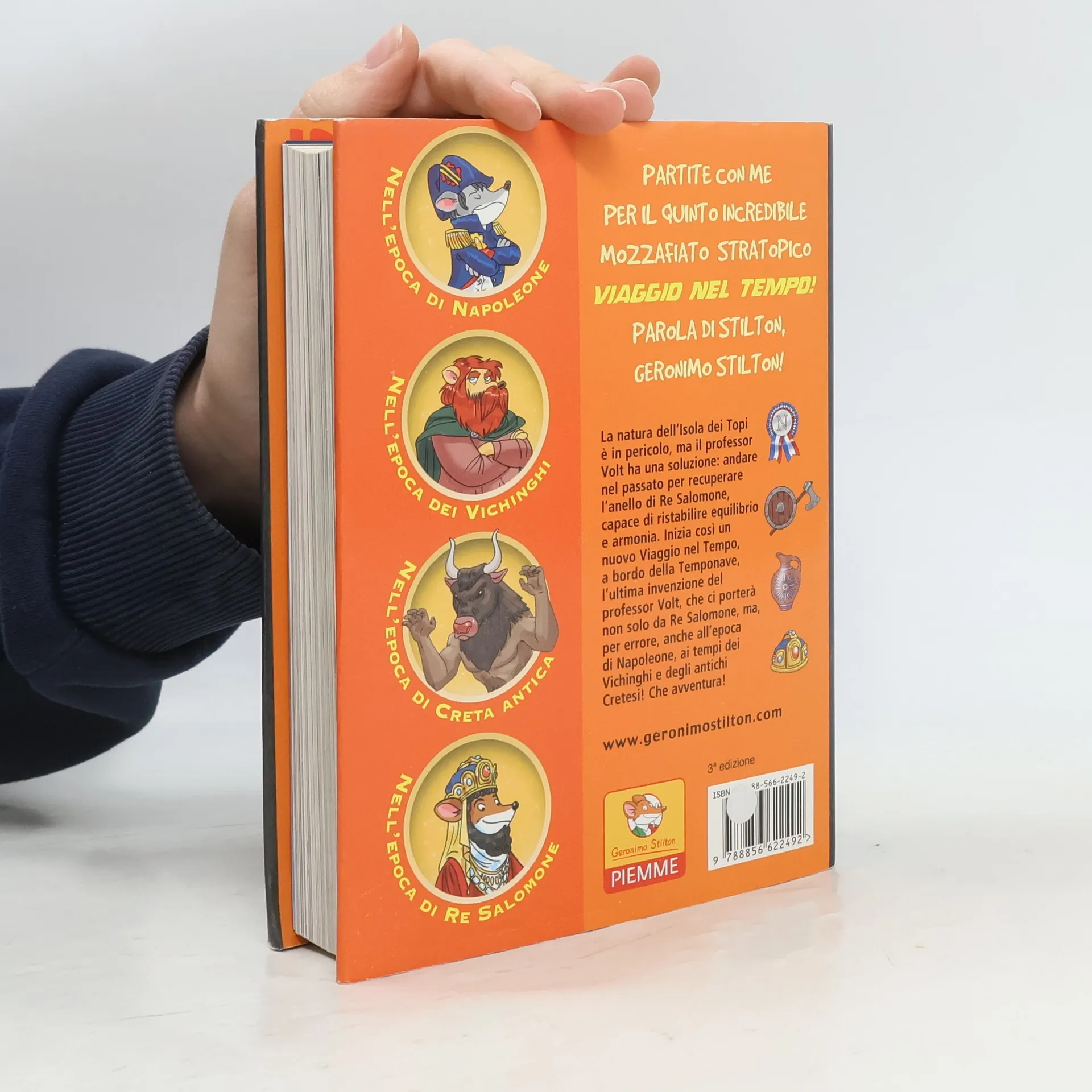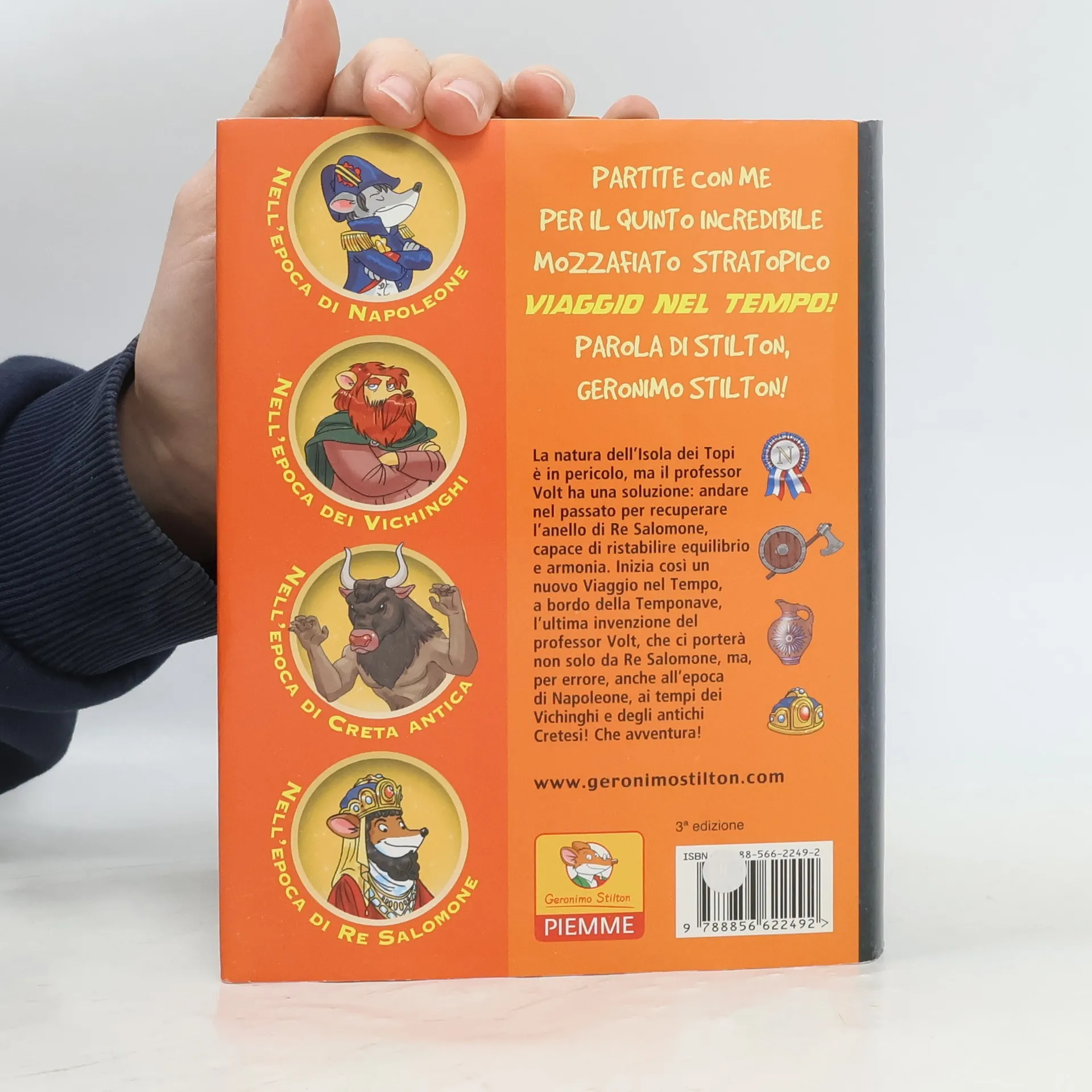 La natura dell’Isola dei Topi è in pericolo, ma il professor Volt ha una soluzione: andare nel passato per recuperare l’anello di Re Salomone, capace di ristabilire equilibrio e armonia. Inizia così un nuovo Viaggio nel Tempo, a bordo della Temponave, l’ultima invenzione del professor Volt, che ci porterà non solo da Re Salomone, ma, per errore, anche all’epoca di Napoleone, ai tempi dei Vichinghi e degli antichi Cretesi! Che avventura!