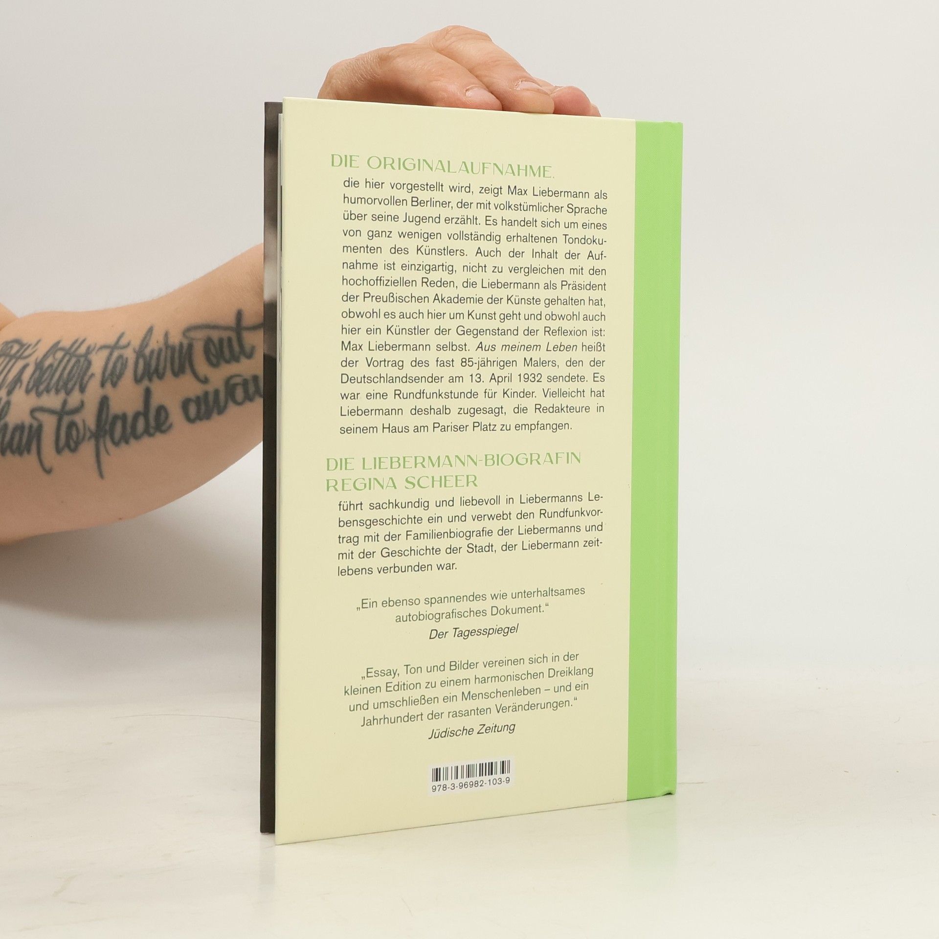 Die Original-Tonaufnahme, die mit dieser Publikation vorgestellt wird, zeigt Liebermann als humorvollen Berliner, der mit volkstümlichem Tonfall über seine Jugend erzählt. Sie ist eine von ganz wenigen vollständig erhaltenen Tondokumenten des Künstlers, und auch ihr Inhalt ist einzigartig, nicht zu vergleichen mit den hoch offiziellen Reden, die Liebermann als Präsident der Preußischen Akademie der Künste gehalten hat, obwohl es auch hier um Kunst geht und obwohl auch hier ein Künstler der Gegenstand der Reflexion ist: Max Liebermann selbst. Aus meinem Leben heißt der Vortrag des fast 85-jährigen Malers, den der Deutschlandsender am 13. April 1932 sendete. Es war eine Rundfunkstunde für Kinder; vielleicht hat Max Liebermann deshalb zugesagt, die Redakteure in seinem Haus am Pariser Platz zu empfangen. Die Liebermann-Biografin Regina Scheer führt sachkundig und liebevoll in Liebermanns Lebensgeschichte ein und verwebt den Rundfunkvortrag mit der Familienbiografie der Liebermanns und mit der Geschichte der Stadt, der Liebermann zeitlebens verbunden war.