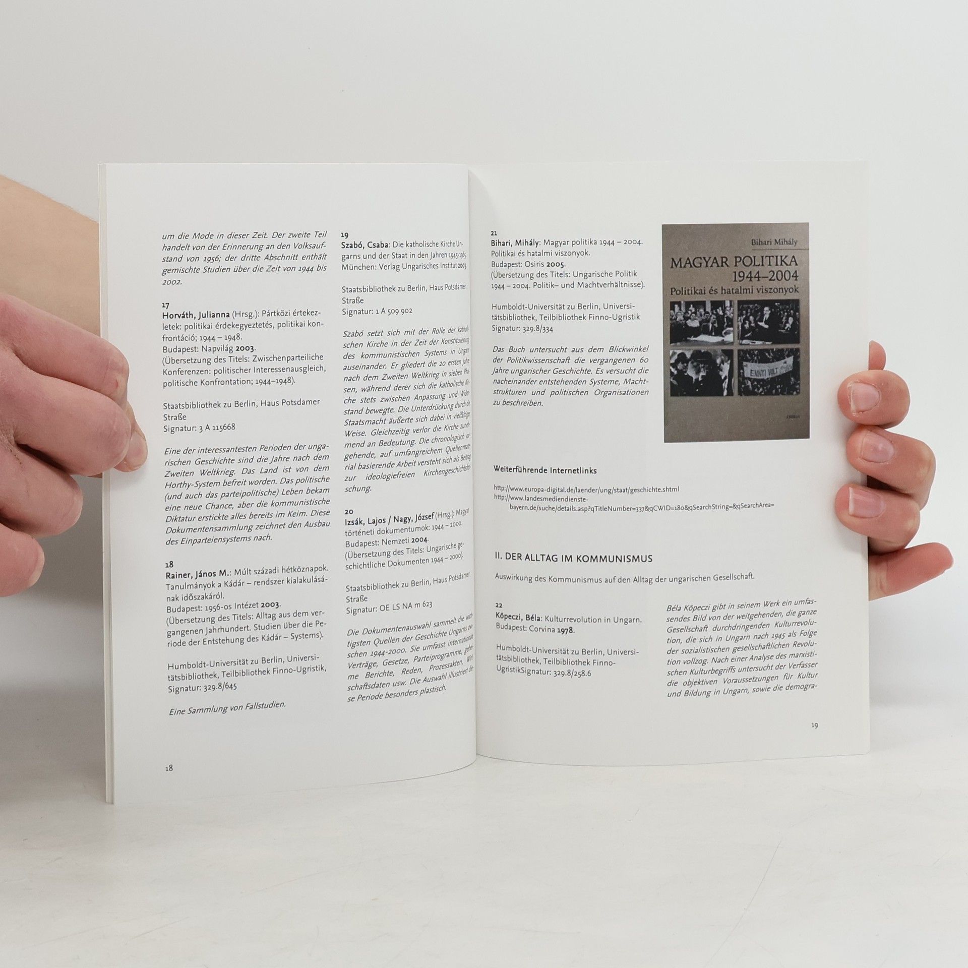 Dieser Katalog wurde begleitend für die Buchausstellung „Der Umgang mit dem kommunistischen Erbe in Ungarn nach 1989 im Spiegel der deutschen und ungarischen Literatur“ erstellt. Der Ausstellungskatalog stellt die vorrevolutionäre sowie die nachrevolutionäre Periode der kommunistischen Herrschaft und deren Aufarbeitung anhand einer Auswahl von relevanter nach 1989 publizierter Literatur vor. Zum anderen sollen die im Katalog aufgeführte systematische und kommentierte Bibliographie von Szilvia Druck und Internetadressen ermuntern, sich mit wissenschaftlicher Leidenschaft dem Thema der ungarischen Zeitgeschichte zu nähern und dafür eine erste Orientierung sein.