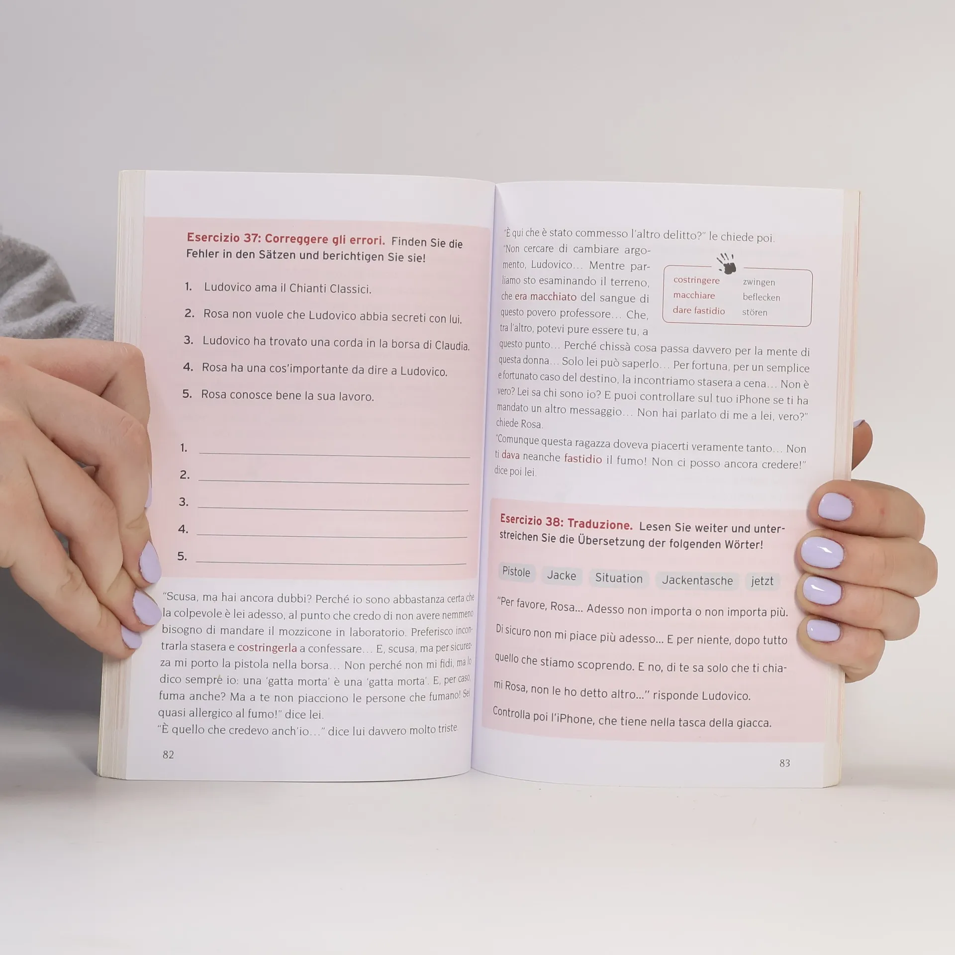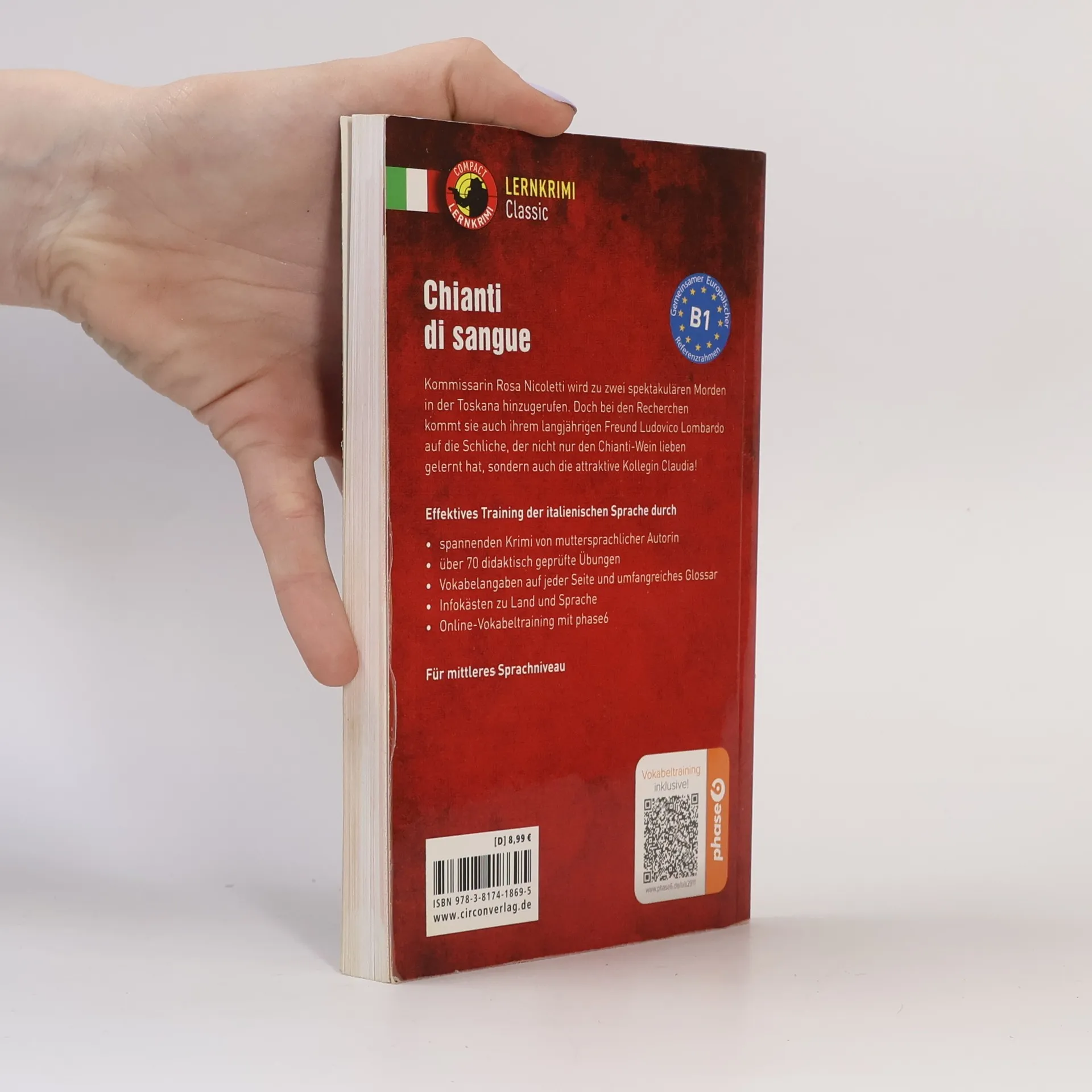 Chianti di sangue (Compact Lernkrimi) Universitätsprofessor Ludovico Lombardo frönt in der Toskana seiner neuen Leidenschaft, dem italienischen Wein, insbesondere dem Chianti. Dort lernt er auch die attraktive Claudia kennen und lieben. Dann geschehen zwei spektakuläre Mordfälle und Commissario Nicoletti reist in die Toskana. Bei den Recherchen stößt sie auf Claudia, die in die Mordfälle mehr verwickelt zu sein scheint, als es Lombardo recht ist. Dieser Lernkrimi bietet spannendes Lesevergnügen und macht das Sprachtraining unterhaltsam und effektiv. So lassen sich die Italienischkenntnisse schnell und einfach vertiefen, auffrischen und überprüfen. Der Schwerpunkt liegt hierbei auf dem Grundwortschatz. In den Text eingestreute Übungen wie Lückentext, Multiple Choice, Übersetzungsaufgaben, etc. schulen zudem das Textverständnis. spannende Kriminalgeschichte gezieltes Training des italienischen Grundwortschatzes textbezogene Übungen mit Lösungen Vokabelangaben auf jeder Seite Infokästen zu Sprache und Landeskunde Abschlusstest zum Überprüfen des Gelernten Europäischer Referenzrahmen: Für mittlere Sprachfertigkeit - Niveau B1