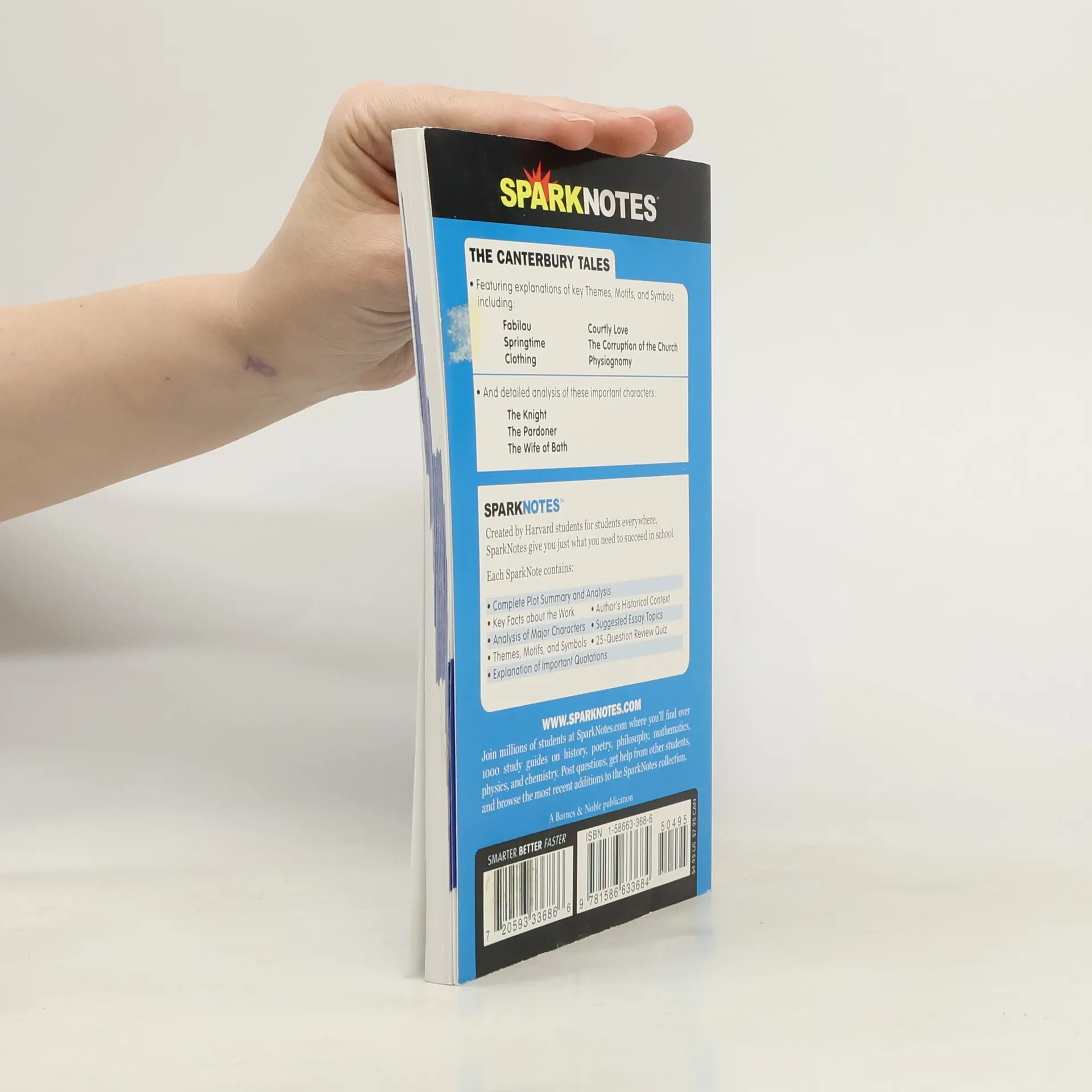 SparkNotesToday’s Most Popular Study GuidesThe Canterbury Tales Geoffrey Chaucer Smarter Better Faster SparkNotesThe Canterbury Tales Featuring explanations of key Themes, Motifs, and Symbols including: Fabilau Courtly Love Springtime The Corruption of the Church Clothing Physiognomy And detailed analysis of these important characters: The KnightThe Pardoner The Wife of Bath SparkNotesCreated by Harvard students for students everywhere, SparkNotes give you just what you need to succeed in school.Each SparkNote contains: Complete Plot Summary and Analysis Key Facts about the Work Analysis of Major Characters Themes, Motifs, and Symbols Explanation of Important Quotations Author’s Historical Context Suggested Essay Topics 25-Question Review Quiz SPARKNOTES.COMJoin millions of students at SparkNotes.com where you’ll find over 1000 study guides on history, poetry, philosophy, mathematics, physics, and chemistry. Post questions, get help from other students, and browse the most recent additions to the SparkNotes collection.Spark Publishing’s Literature Guides are celebrating their 5th Anniversary! To celebratethis, we’re giving our TOP 50 a revamp by adding some exciting new features.There will be sixteen pages devoted to writing a literary essay including: Glossary of literary terms, Step by step tutoring on how to write a literary essay Feature on how not to plagiarized. Each book will also include an A+ Essay; an actual literary essay written about the Spark-ed book, to show students how an essay should be written.