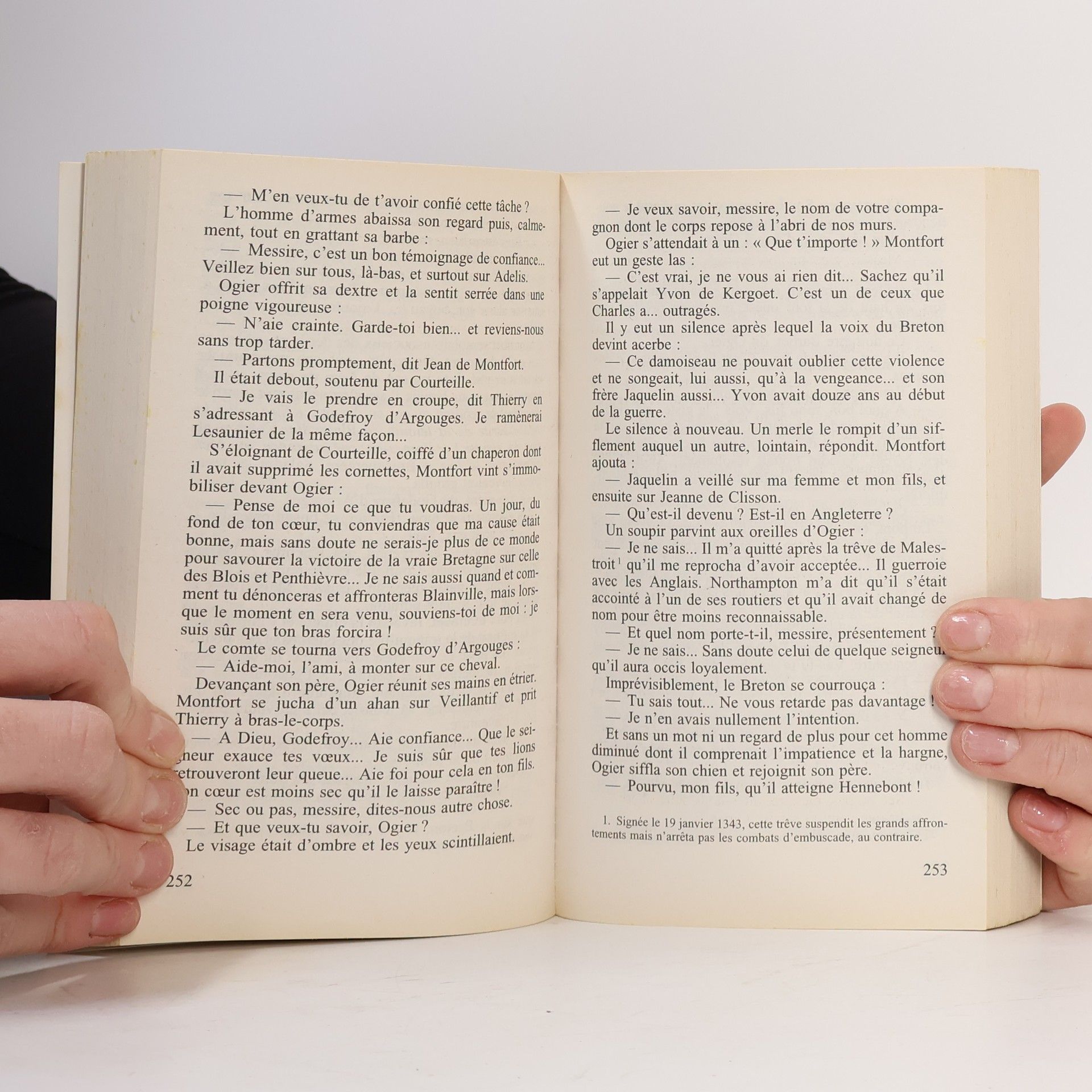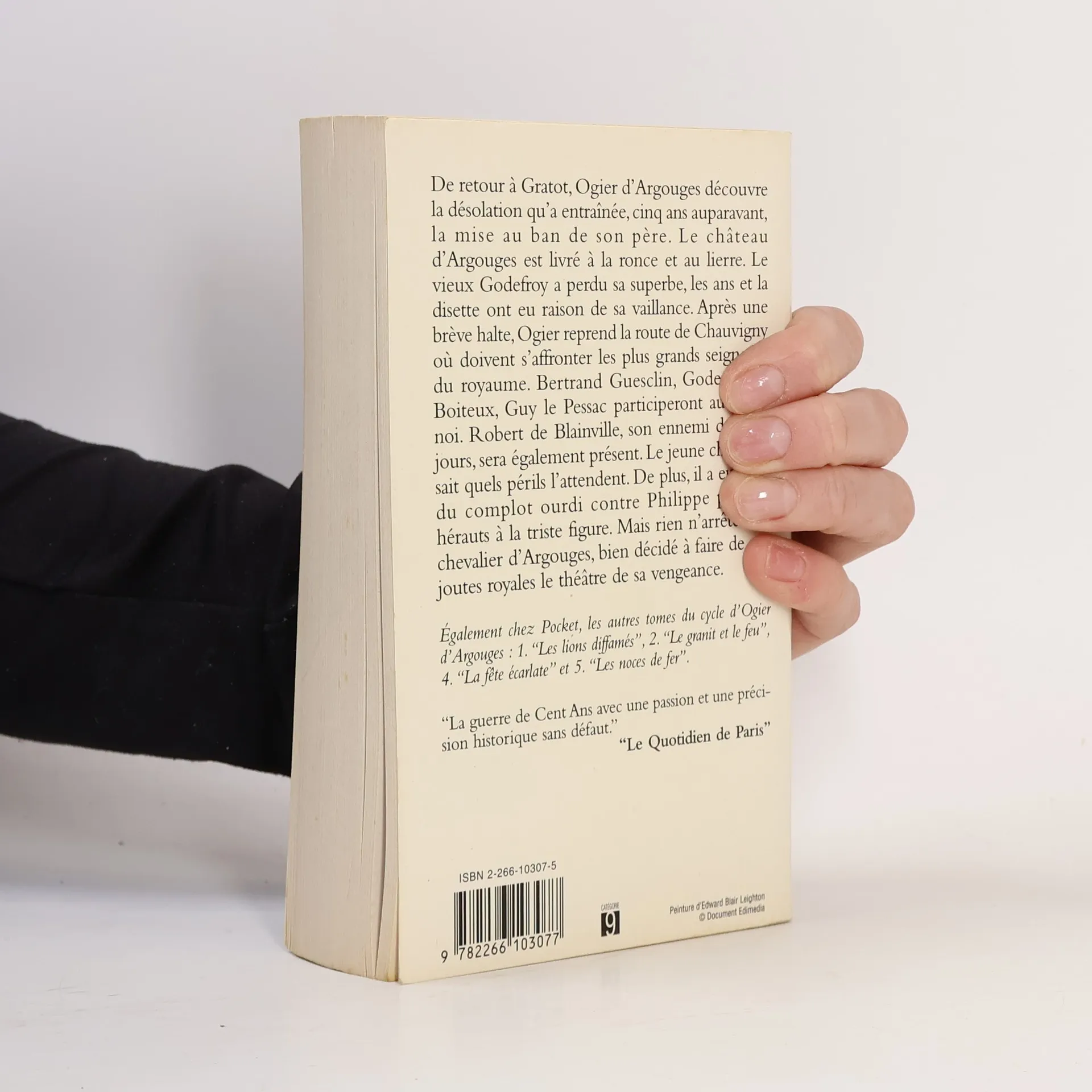 Jeudi 13 avril 1346. En fin de matinée, Ogier d'Argouges et ses compagnons contournent le champ clos de Chauvigny où des joutes vont rassembler, le dimanche suivant, les meilleurs chevaliers du Poitou et quelques personnages fameux du royaume. Ceux qui sortiront indemnes de ces épreuves s'affronteront, le lendemain, dans un tournoi. Ce n'est pas de gaieté de coeur que le jeune chevalier normand a quitté Gratot, le château familial. Il pressent qu'après des années de combats incertains, le sort de son pays, marqué par une succession de fatalités, va basculer dans la honte : les armées d'Edouard III, s'apprêtent à envahir la France. La date et le lieu du débarquement doivent être décidés à Chauvigny où se réuniront secrètement les émissaires du roi d'Angleterre et des nobles français traîtres à la Couronne. Ogier n'a qu'un désir et une volonté : découvrir le lieu de rencontre des conjurés, faire échec à leurs décisions et confondre Richard de Blainville, le favori du roi Philippe VI, l'homme qui a injustement dégradé son père et diffamé les Lions de ses armes. Les preuves de sa trahison en main, il pourra, tout en sauvant l'honneur menacé de son suzerain, assouvir enfin sa vengeance. Trois personnes accompagnent Ogier : Thierry, son écuyer, Raymond, un sergent, et Adelis, une ancienne ribaude dont il a restauré la dignité. Lors de la traversée d'une forêt, les quatre amis délivrent une jouvencelle, Isabelle, captive d'une bande de Bretons. Cependant, celle dont s'éprendra le fougueux redresseur de torts, c'est Blandine, une pucelle qui, bientôt, toute prôche d'Isabelle, reine de la fête d'armes, n'aura d'yeux que pour lui. Ogier est impatient de coiffer son heaume sommé d'un poing vermeil, symbole de sa fermeté d'âme. Il attend comme une bénédiction l'instant où il empoignera les lances de joutes dont le " rochet " terminal ressemble à une fleur d'acier. Il lui faut bouter hors des arçons non seulement les vaniteux qui l'ont offensé, mais également un certain Bertrand Guesclin qui, pour une fois, dans un ouvrage dont on ne peut nier les qualités et l'érudition, apparaît sous son aspect véritable.